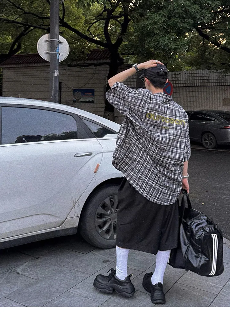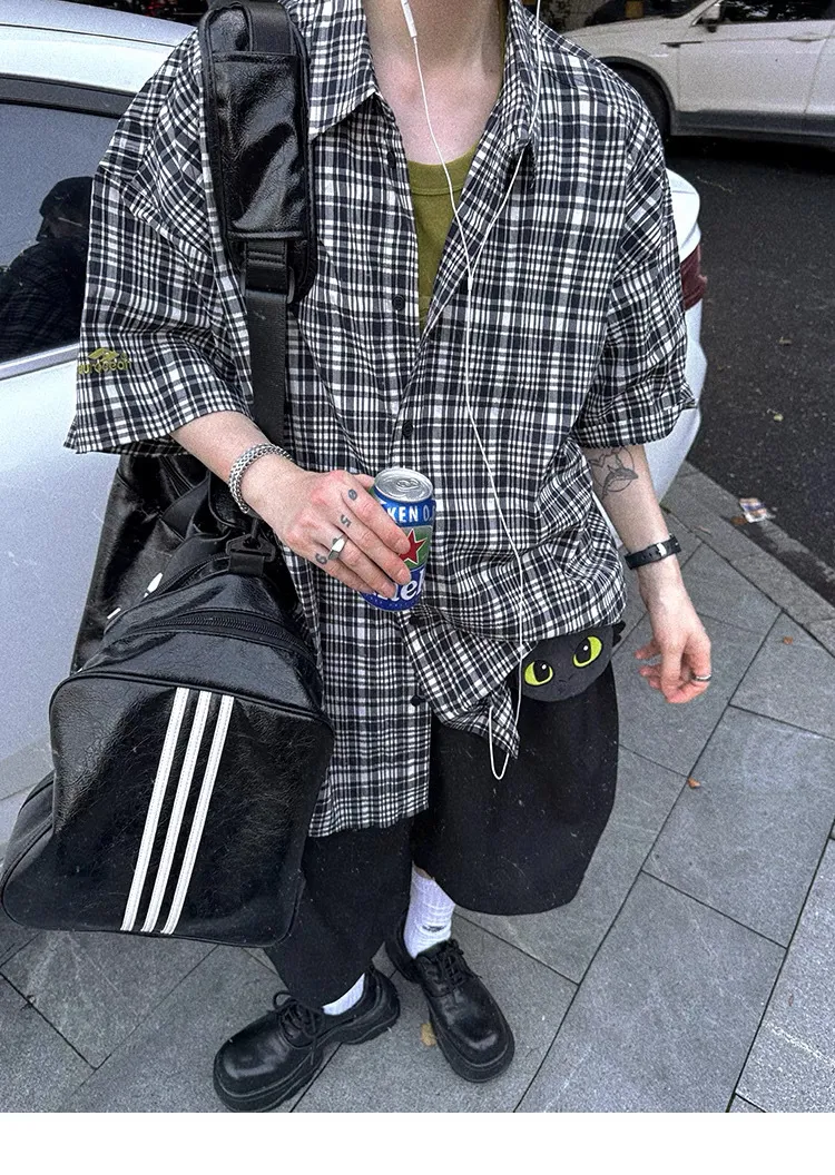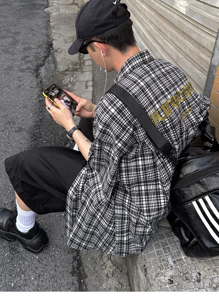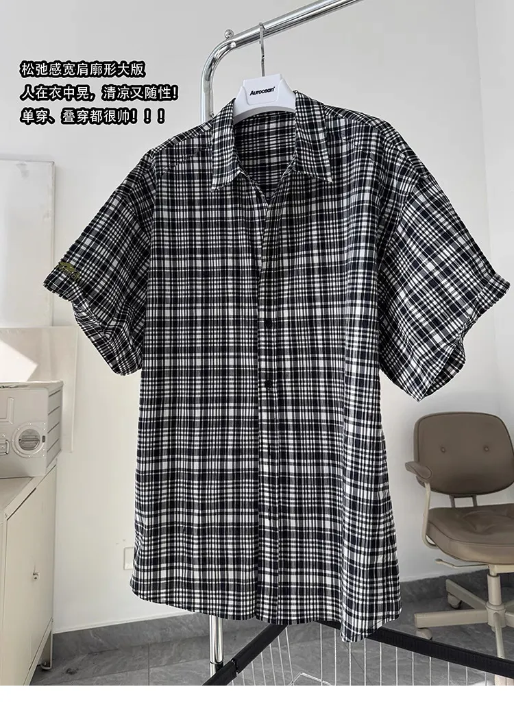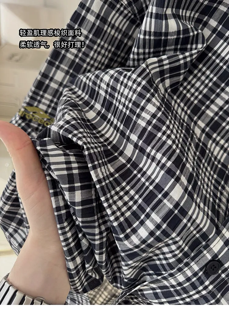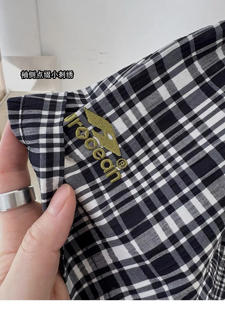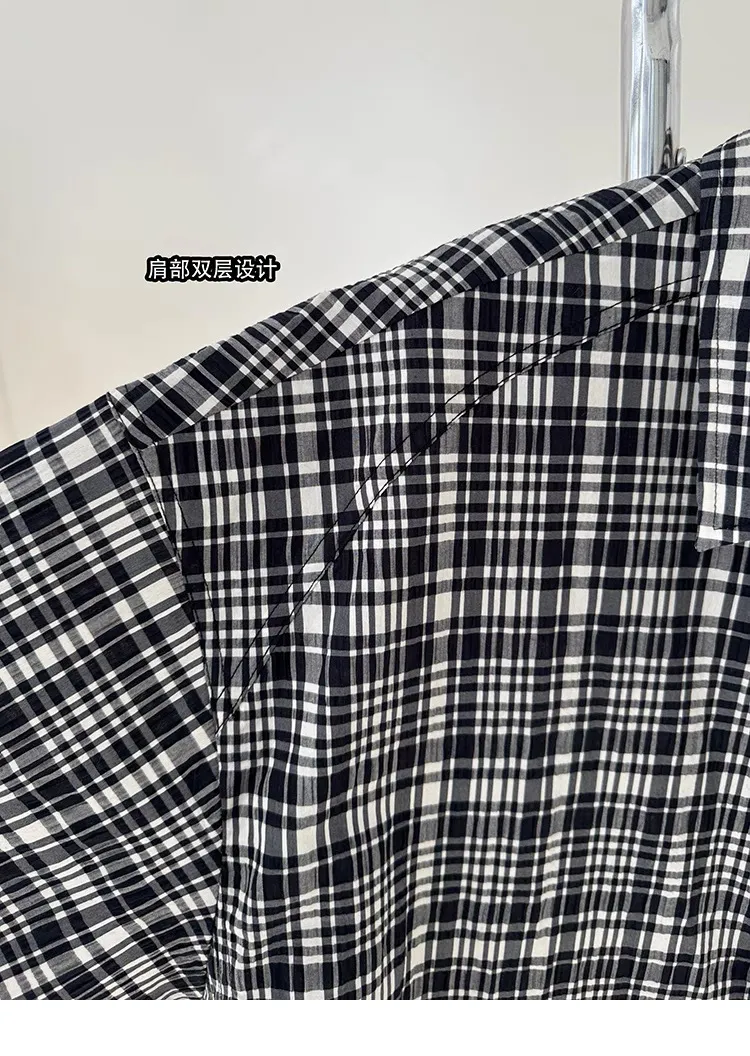 AUROCEAN 格紋肌理 撞色刺繡 寬肩 襯衫(黑色)