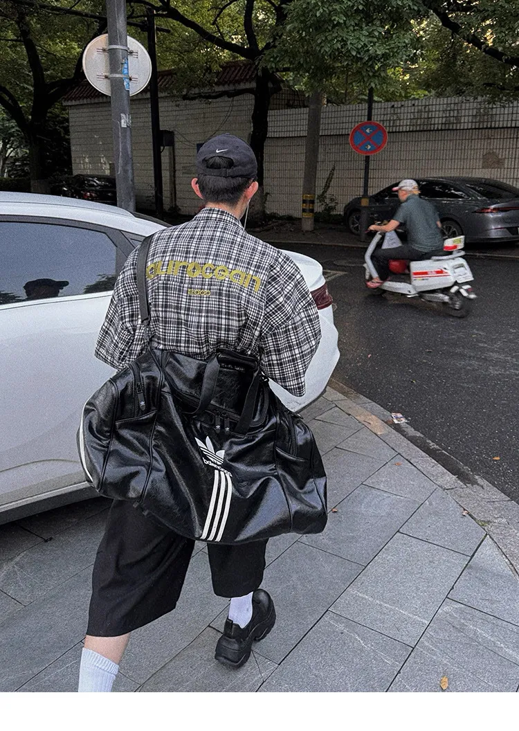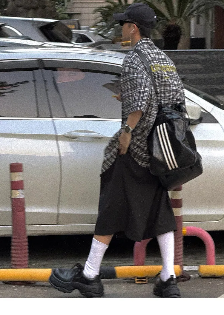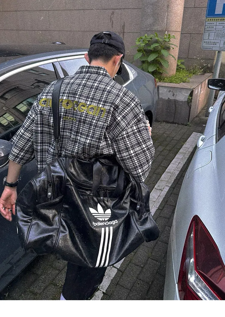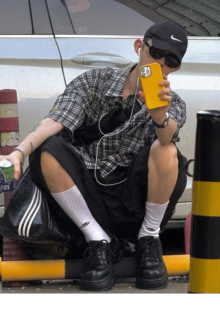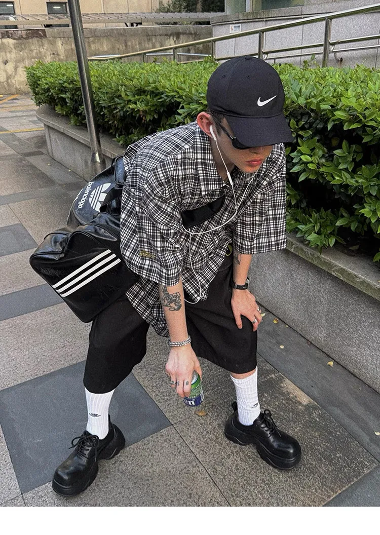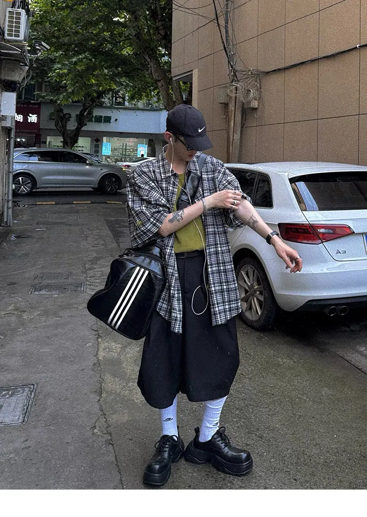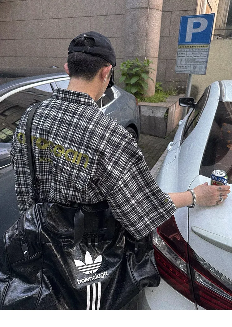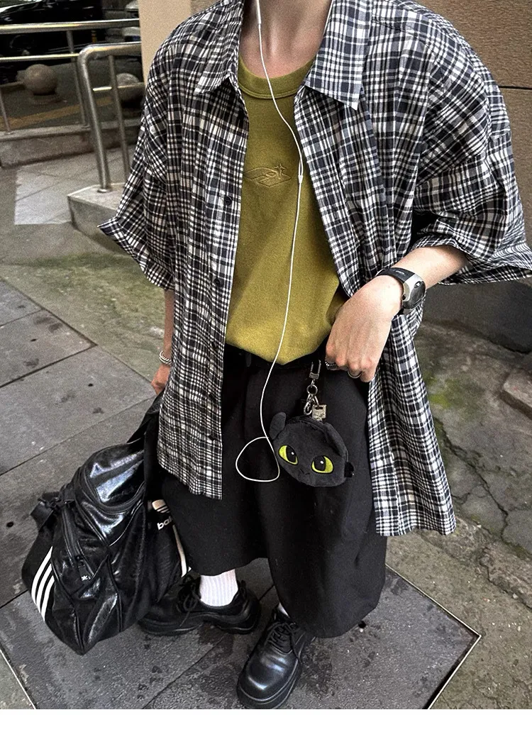 AUROCEAN 格紋肌理 撞色刺繡 寬肩 襯衫(黑色)