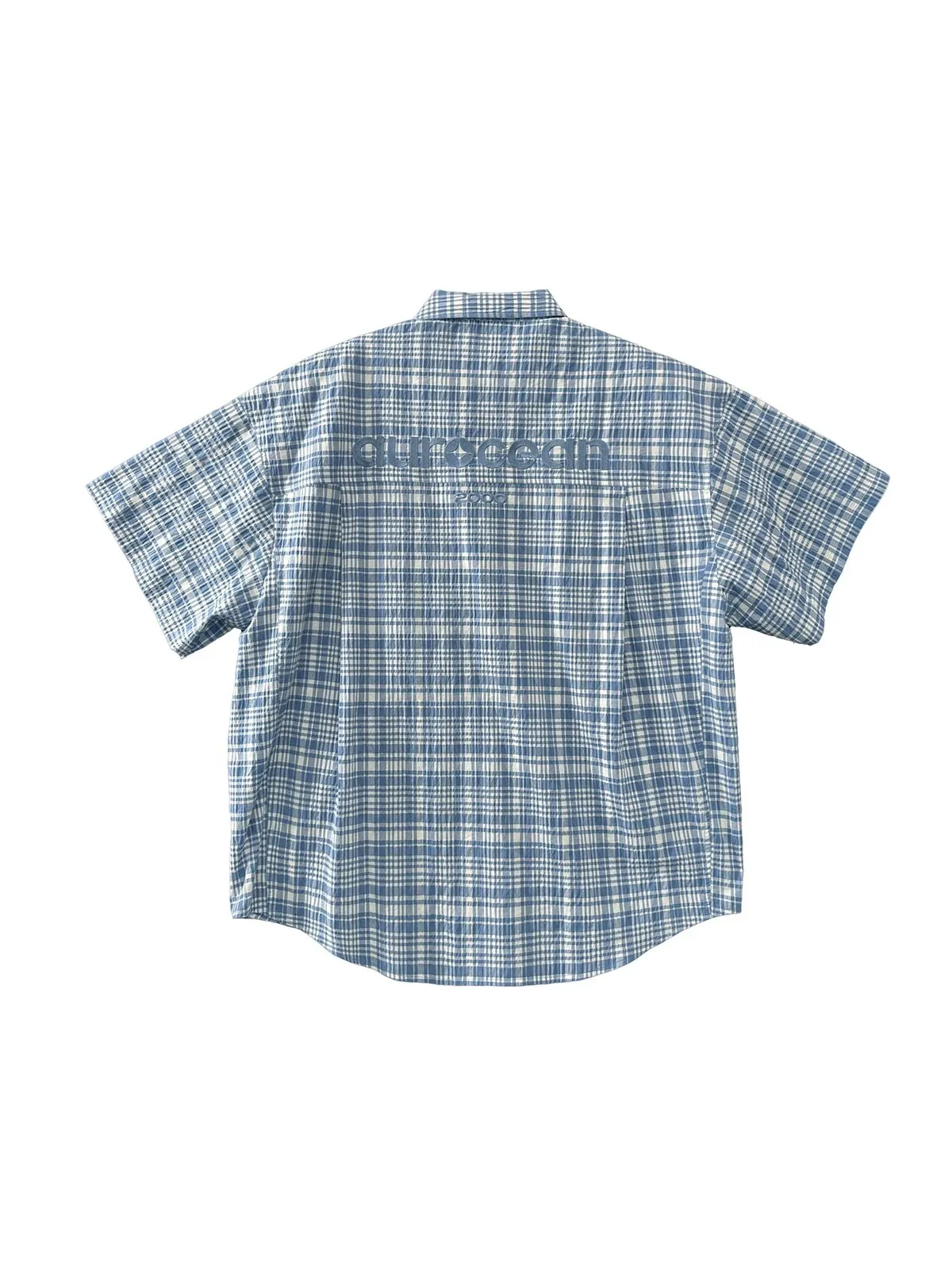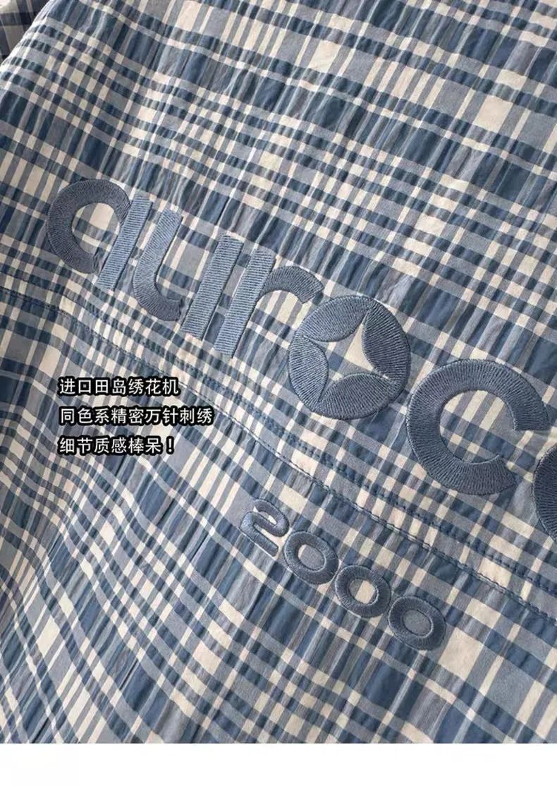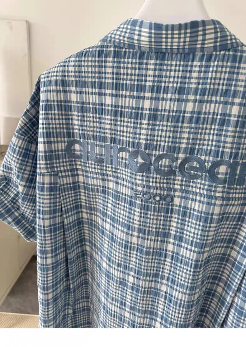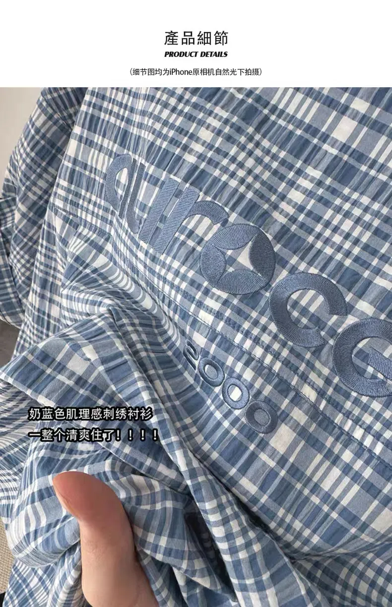 AUROCEAN 格紋肌理 撞色刺繡 寬肩 襯衫(奶藍)