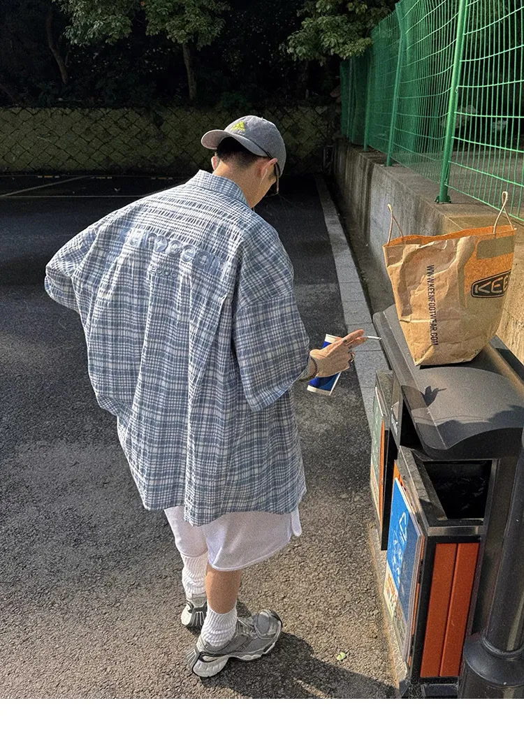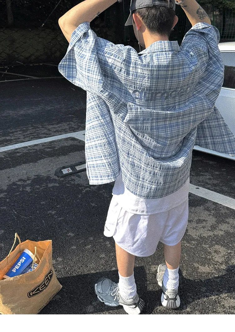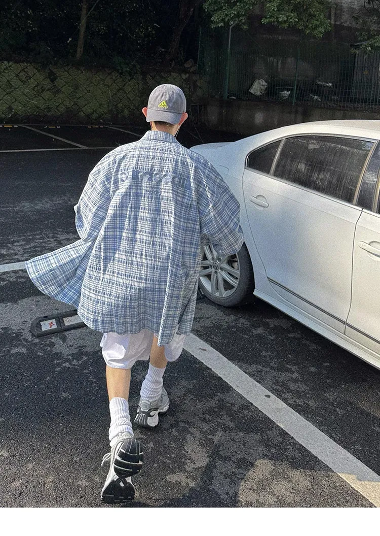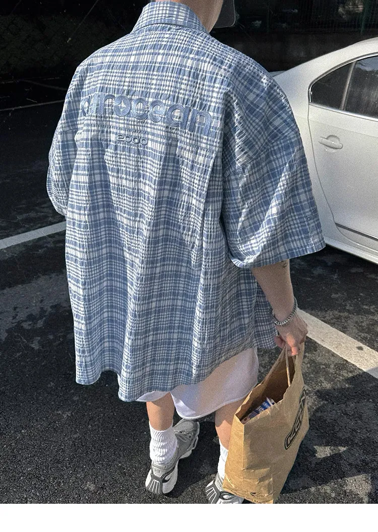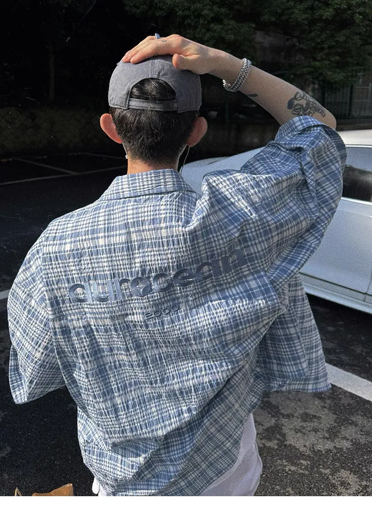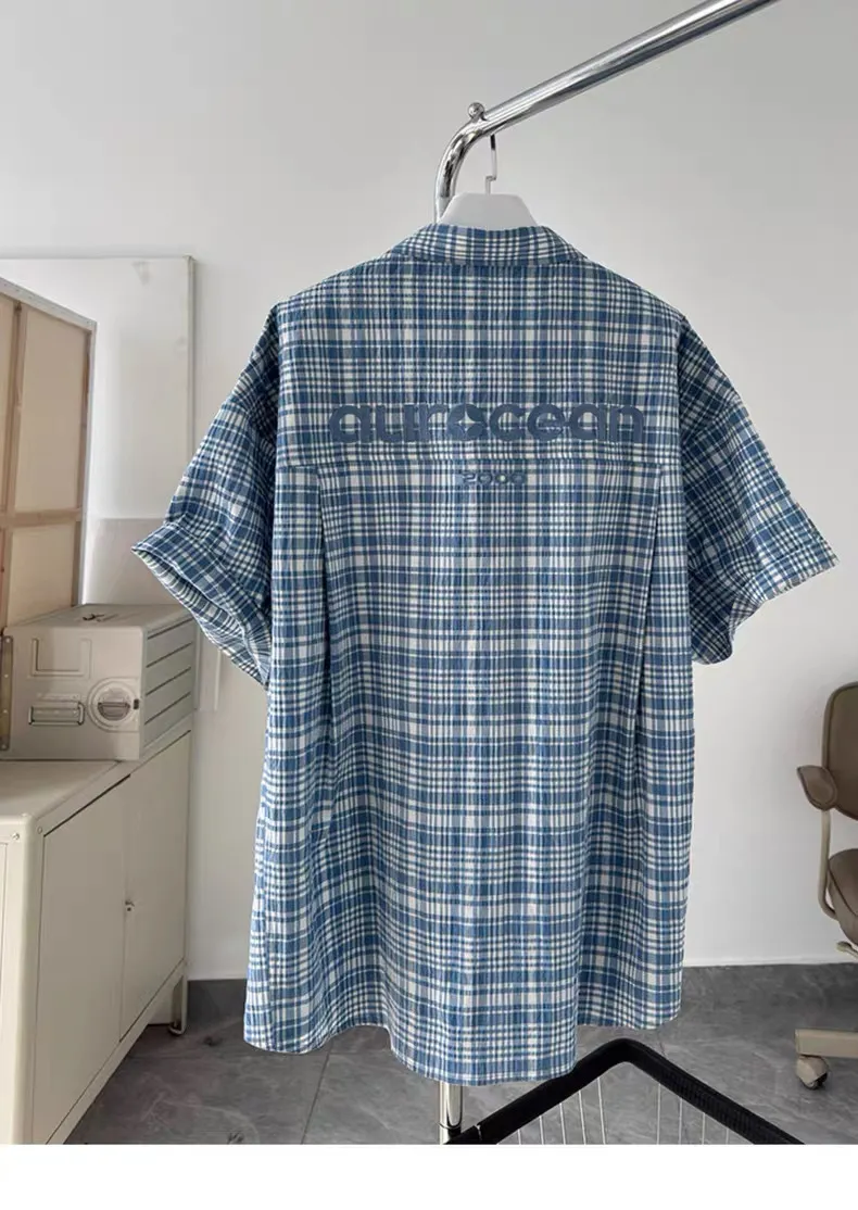 AUROCEAN 格紋肌理 撞色刺繡 寬肩 襯衫(奶藍)