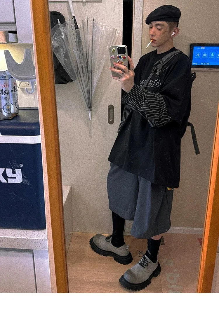 做舊水洗 雙層拼接 帽踢 Taped 棉褲 套裝(水洗黑)