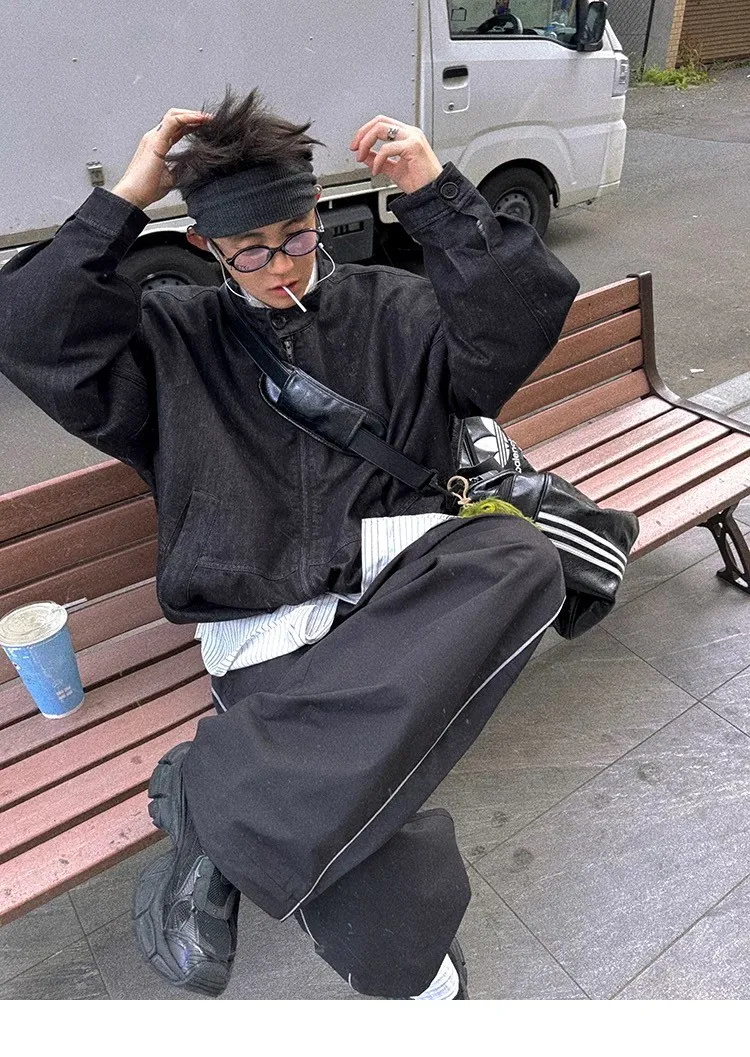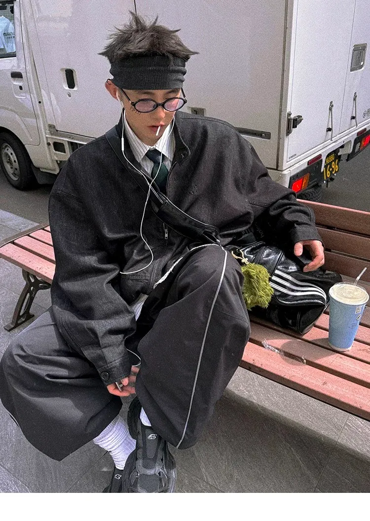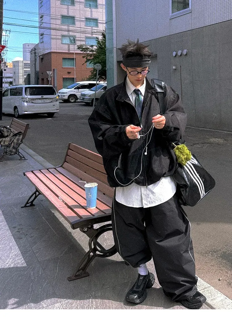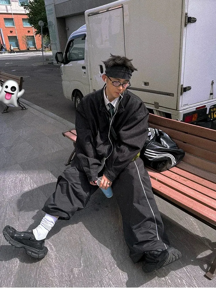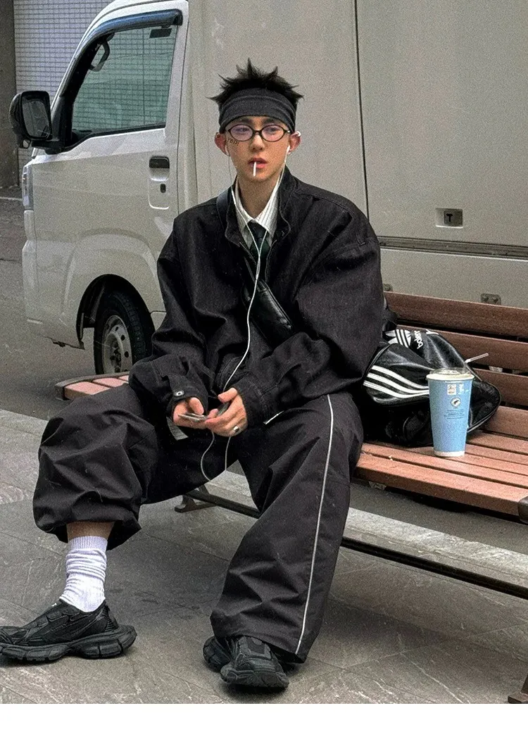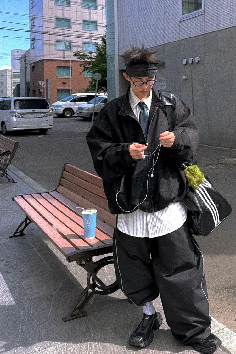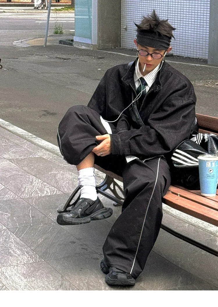 做舊水洗 雙層拼接 帽踢 Taped 棉褲 套裝(水洗黑)
