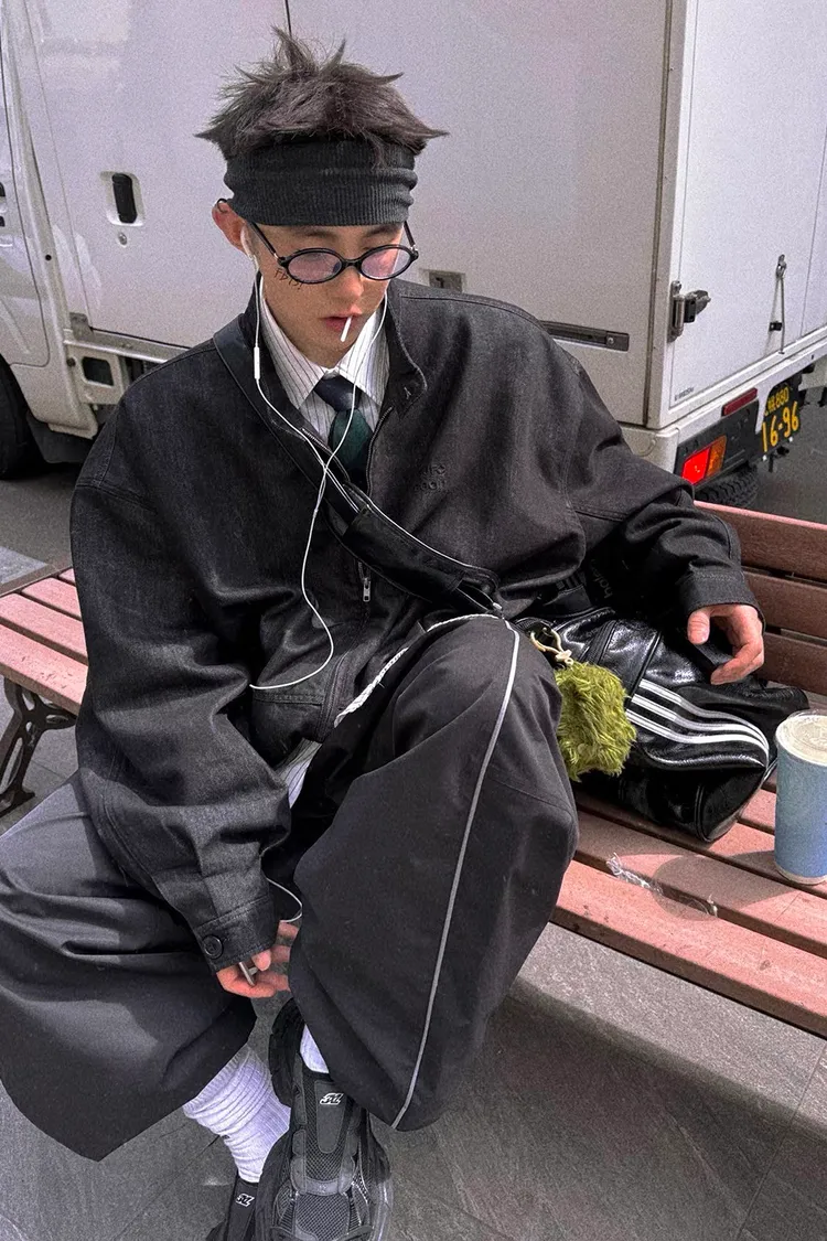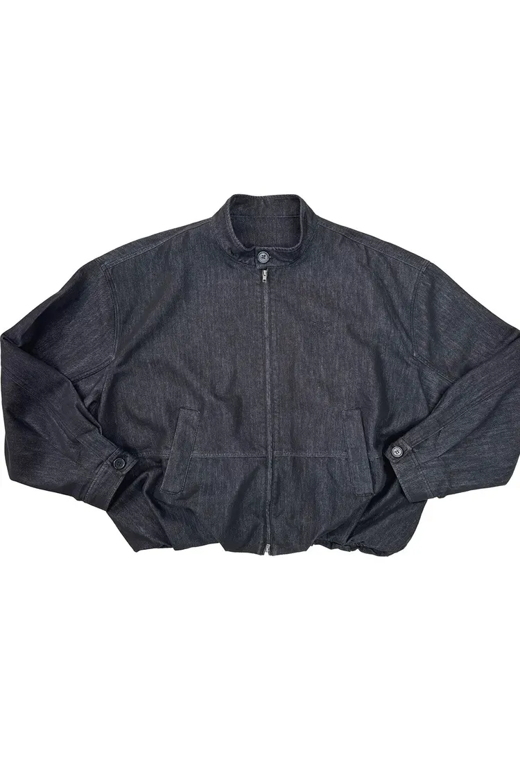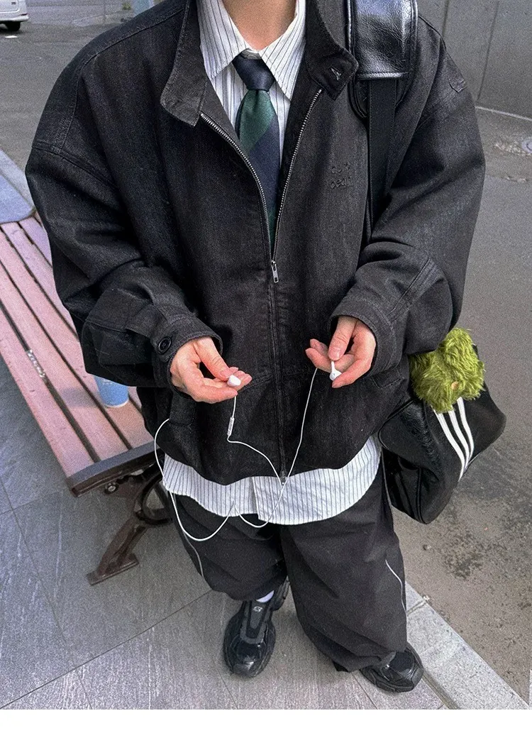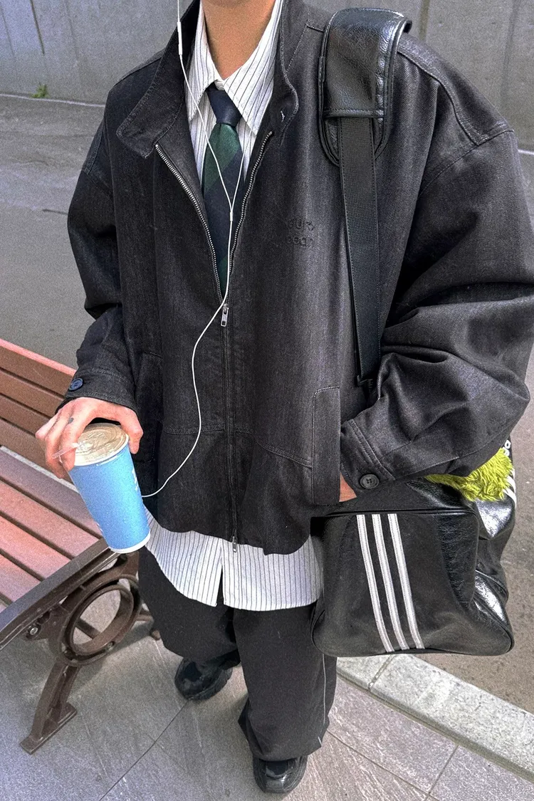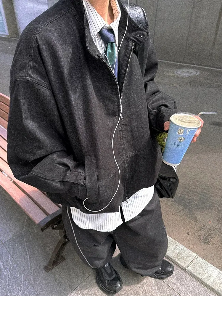 AUROCEAN 水洗丹寧 復古少年 小立領 外套(黑色)
