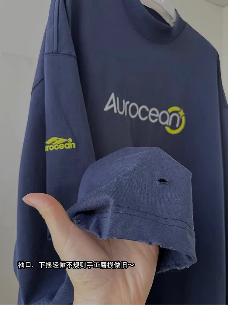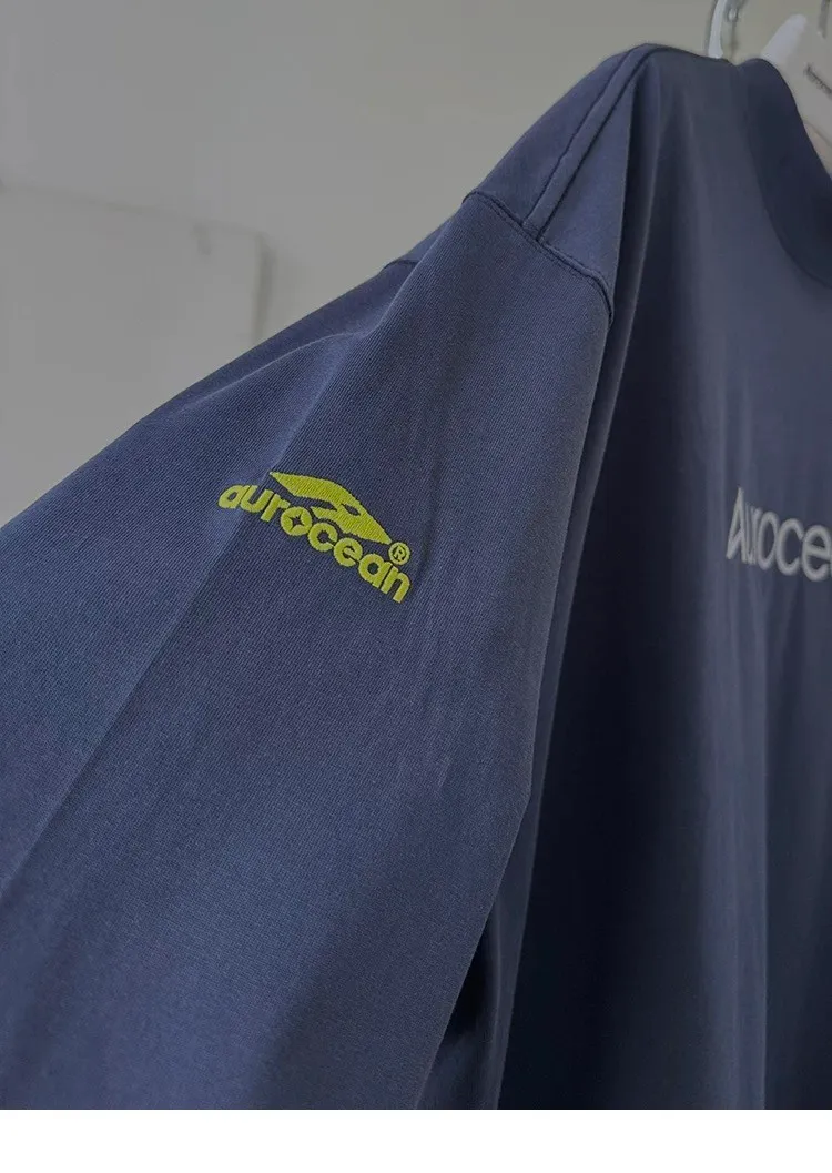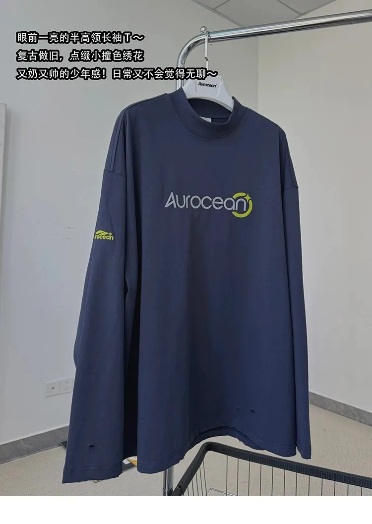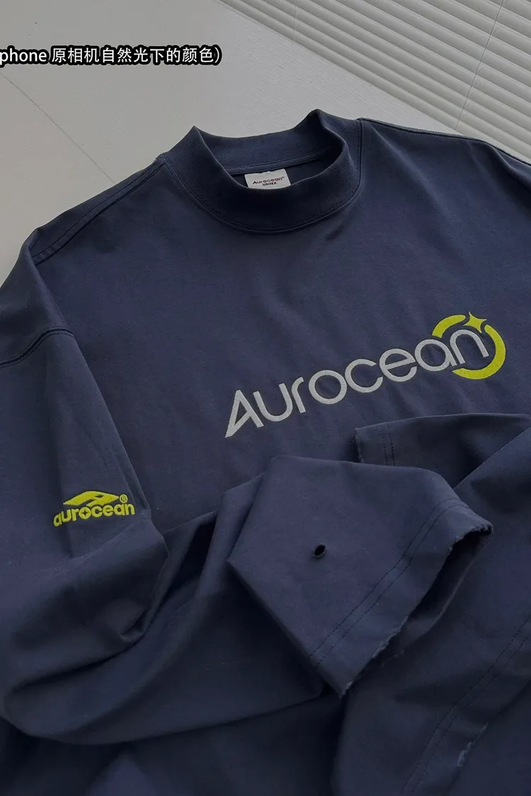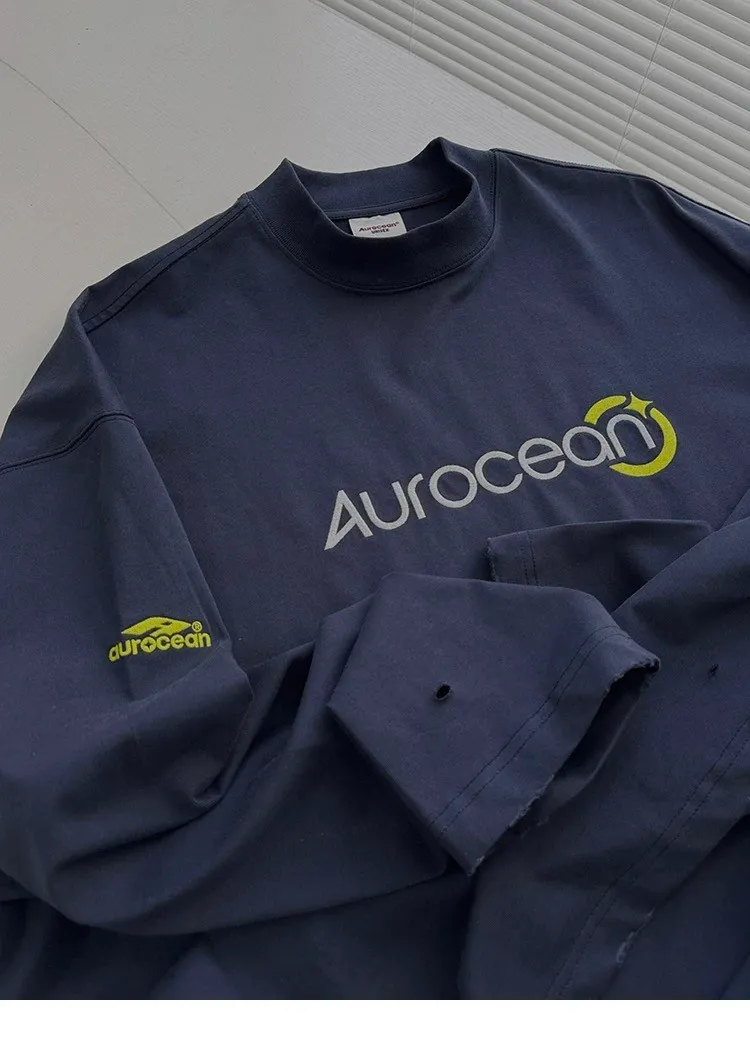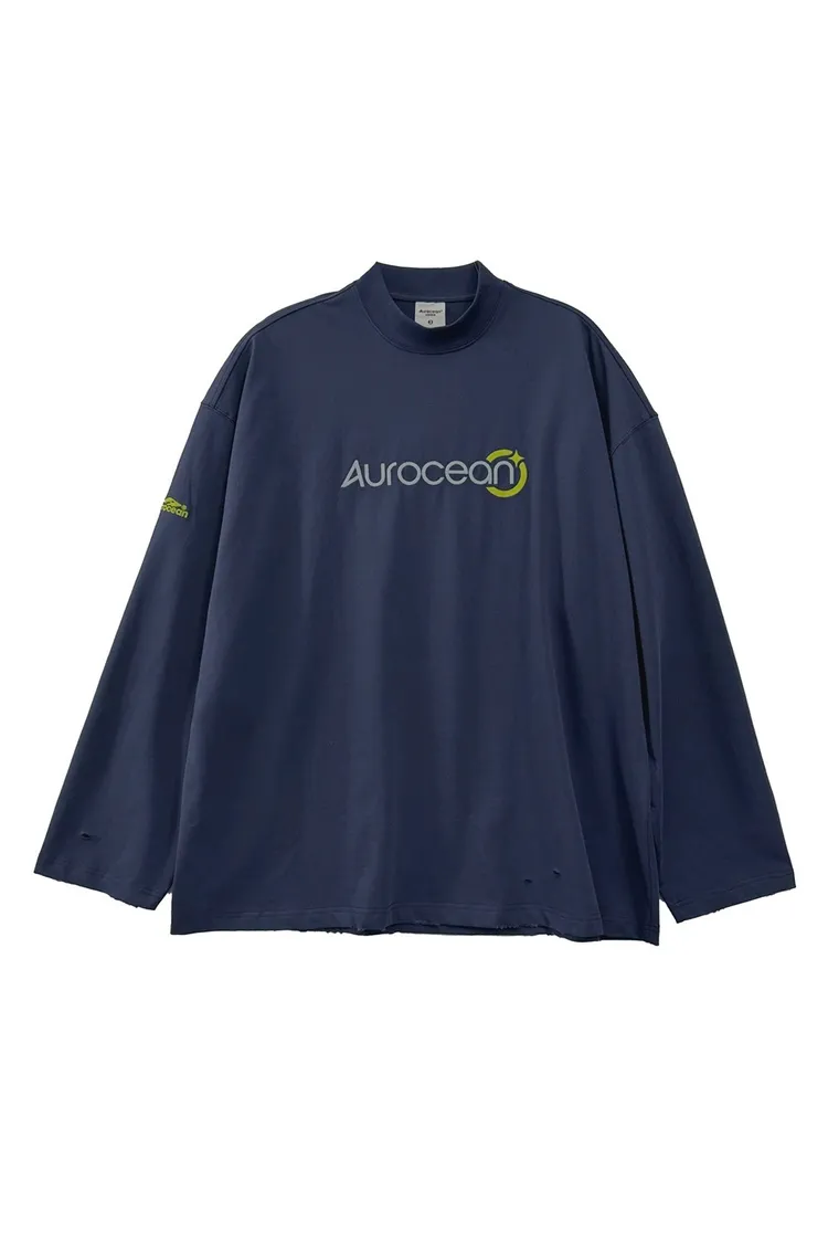 AUROCEAN 小高領 破壞水洗 LOGO 長袖(藏青)