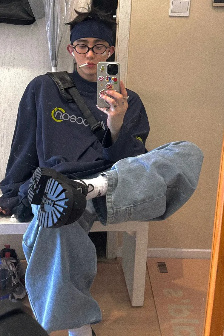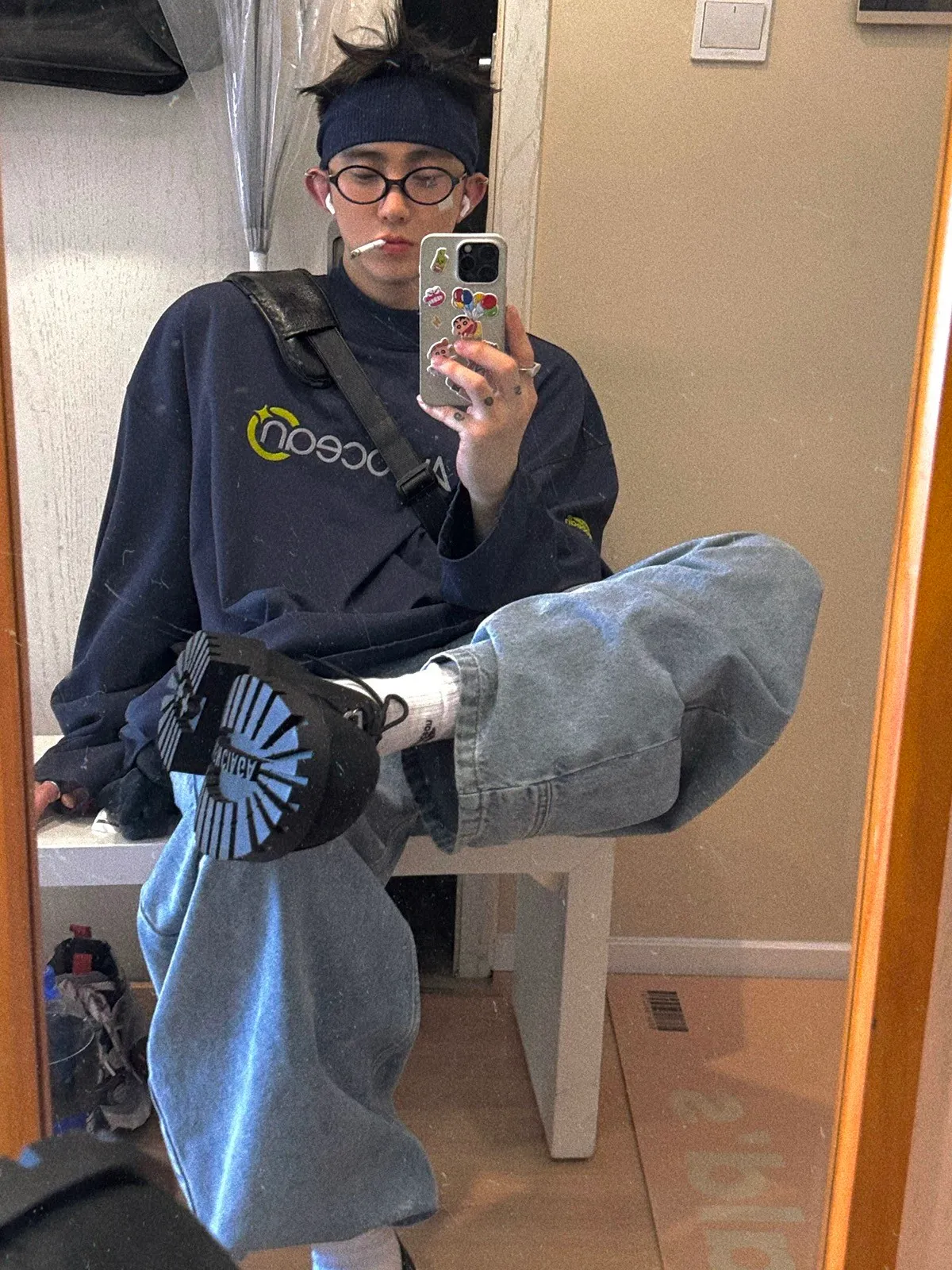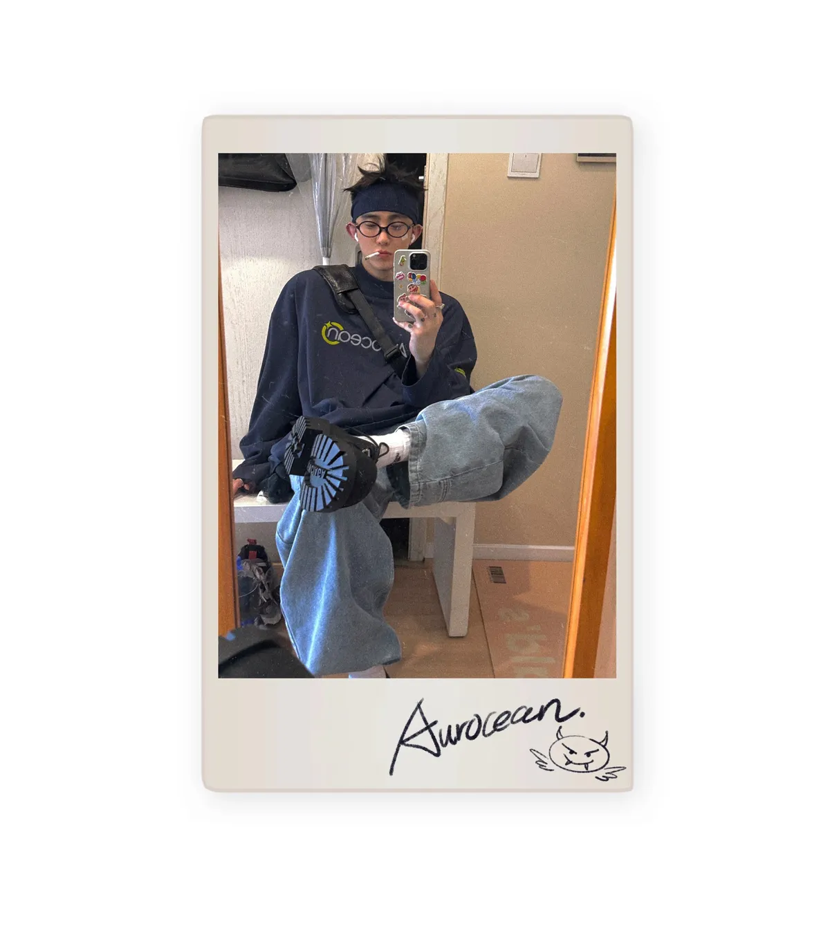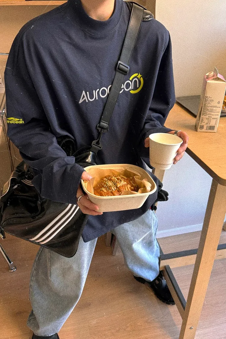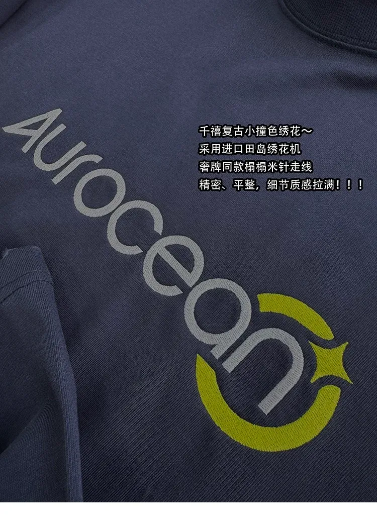 AUROCEAN 小高領 破壞水洗 LOGO 長袖(藏青)