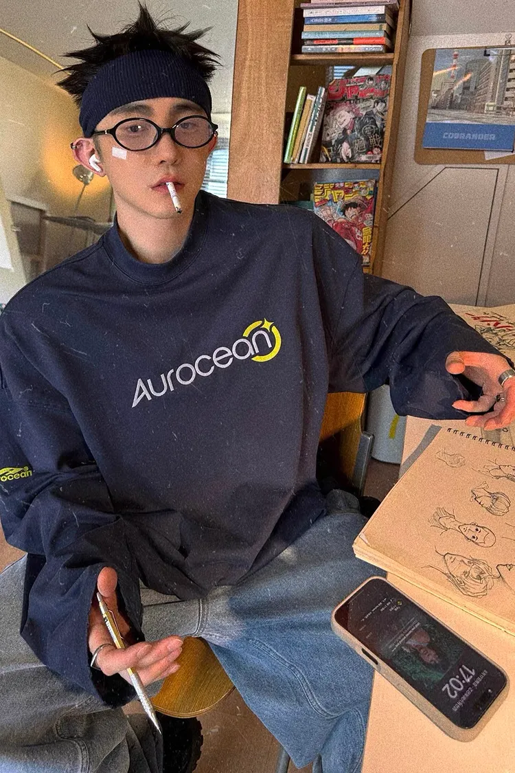 AUROCEAN 假兩件 襯衫袖 塗鴉LOGO 長袖(黑色)