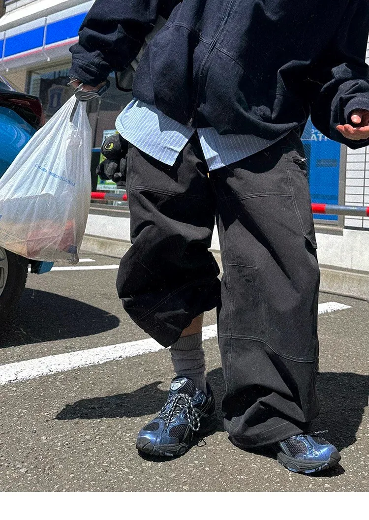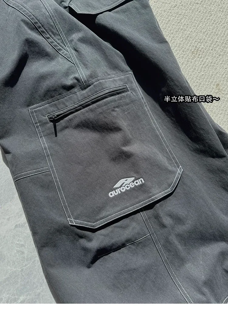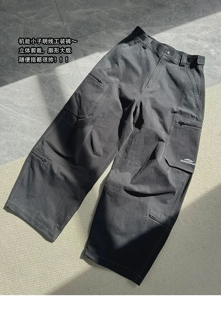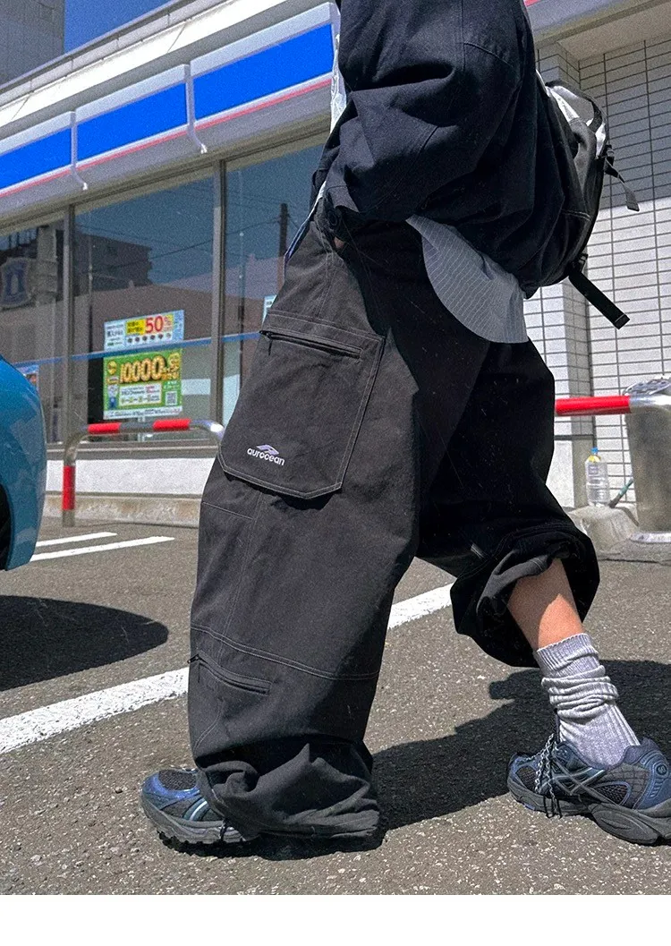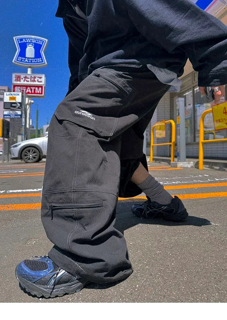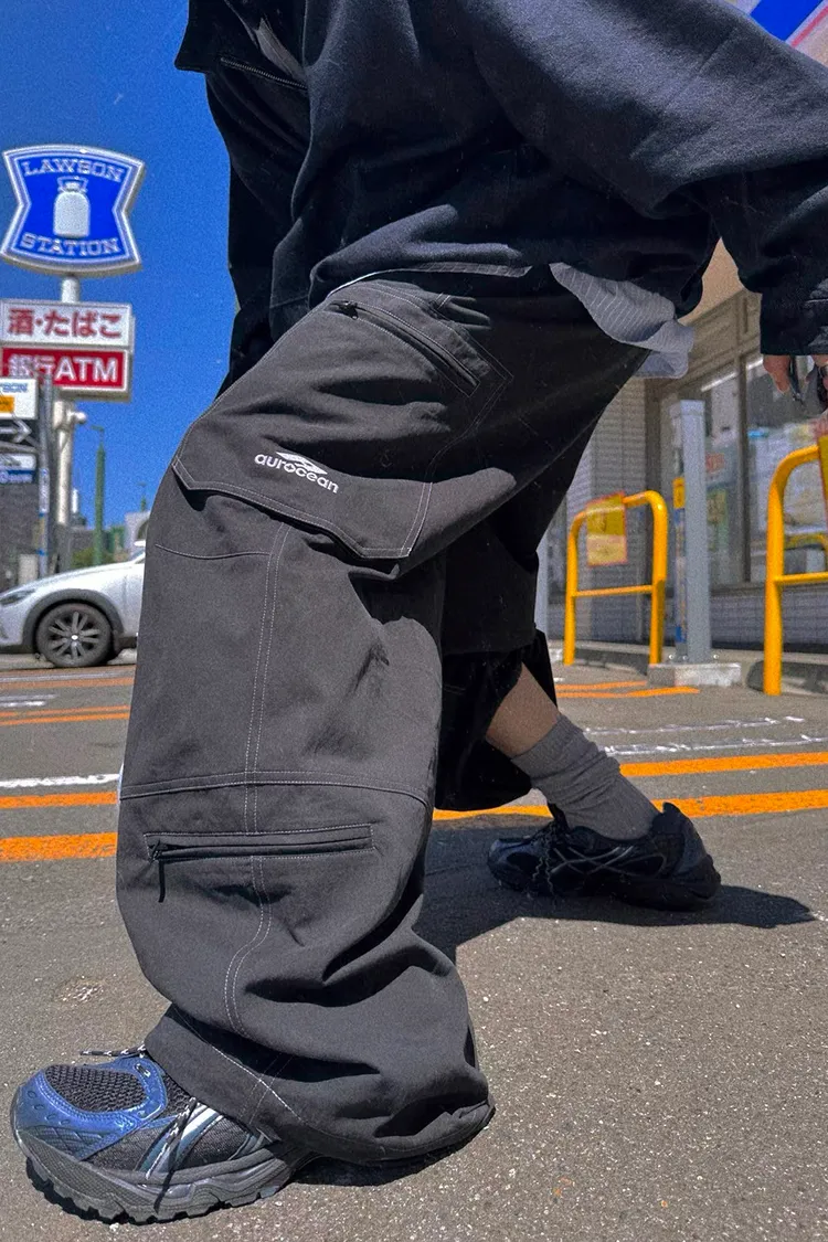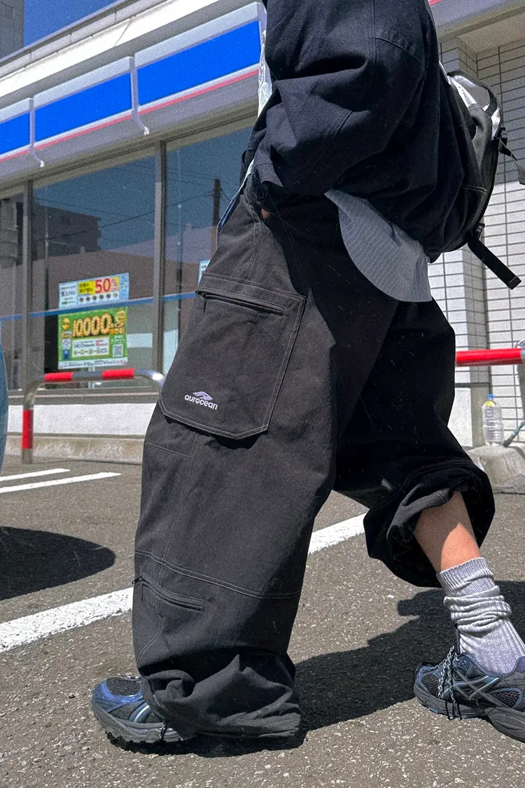 AUROCEAN 機能小子 多口袋縫線 寬鬆 長褲(黑色)