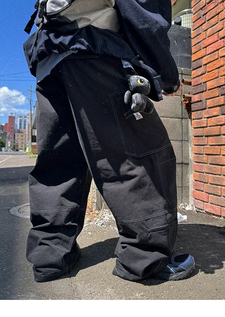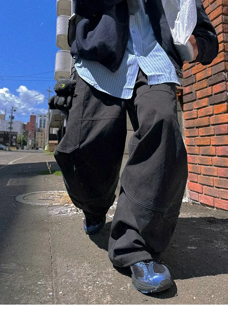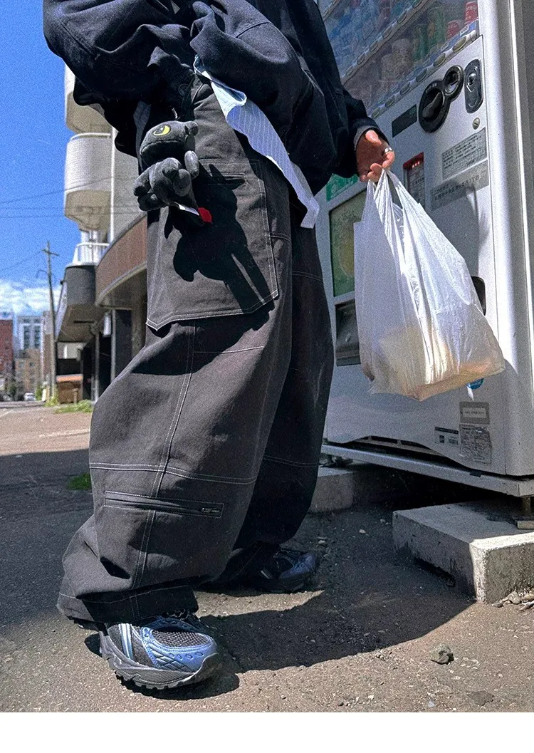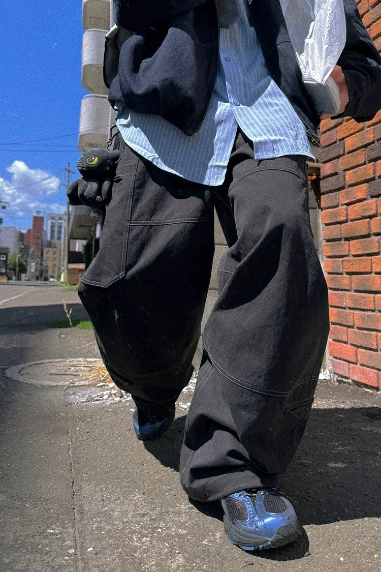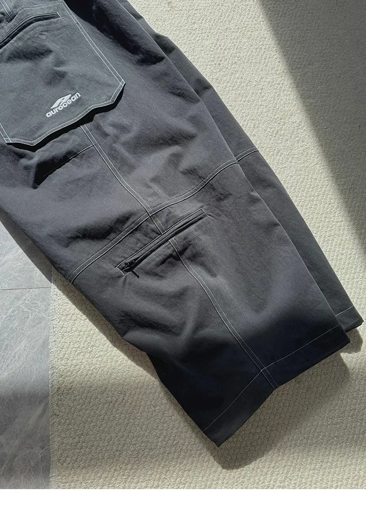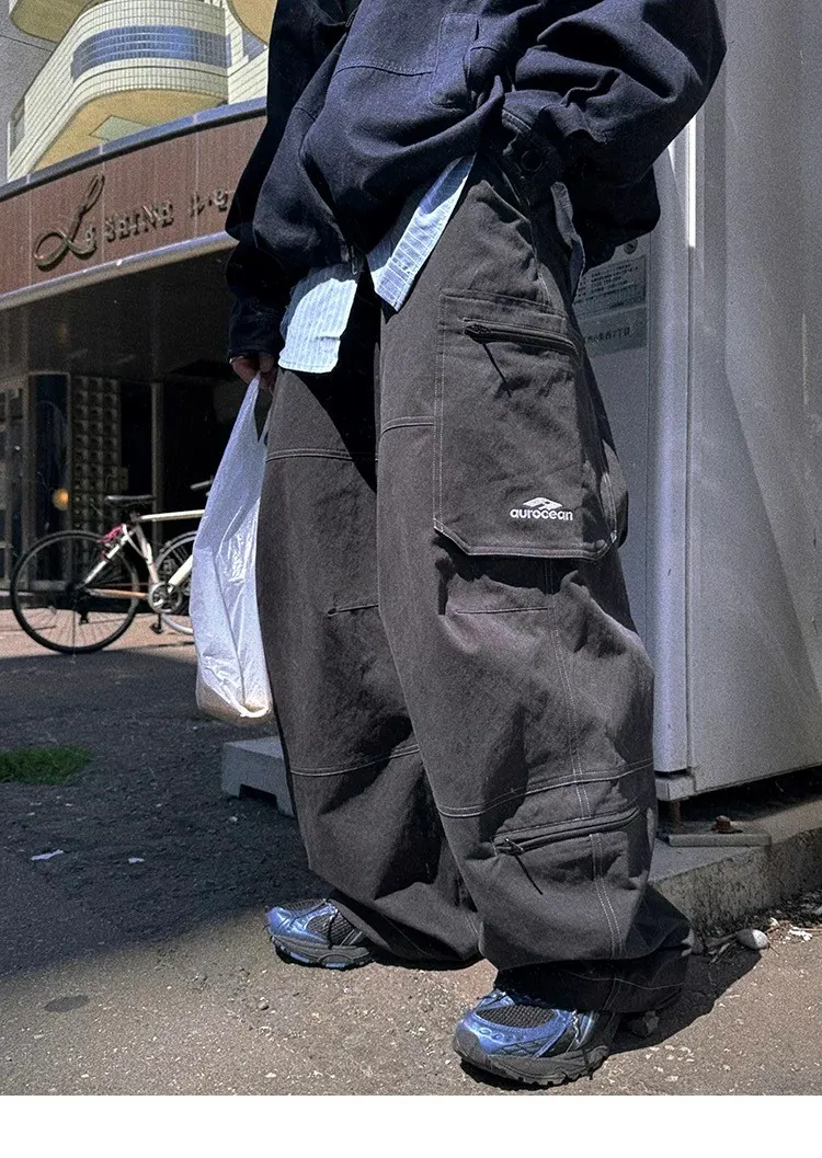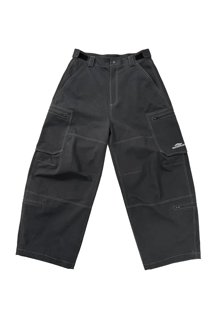 AUROCEAN 機能小子 多口袋縫線 寬鬆 長褲(黑色)