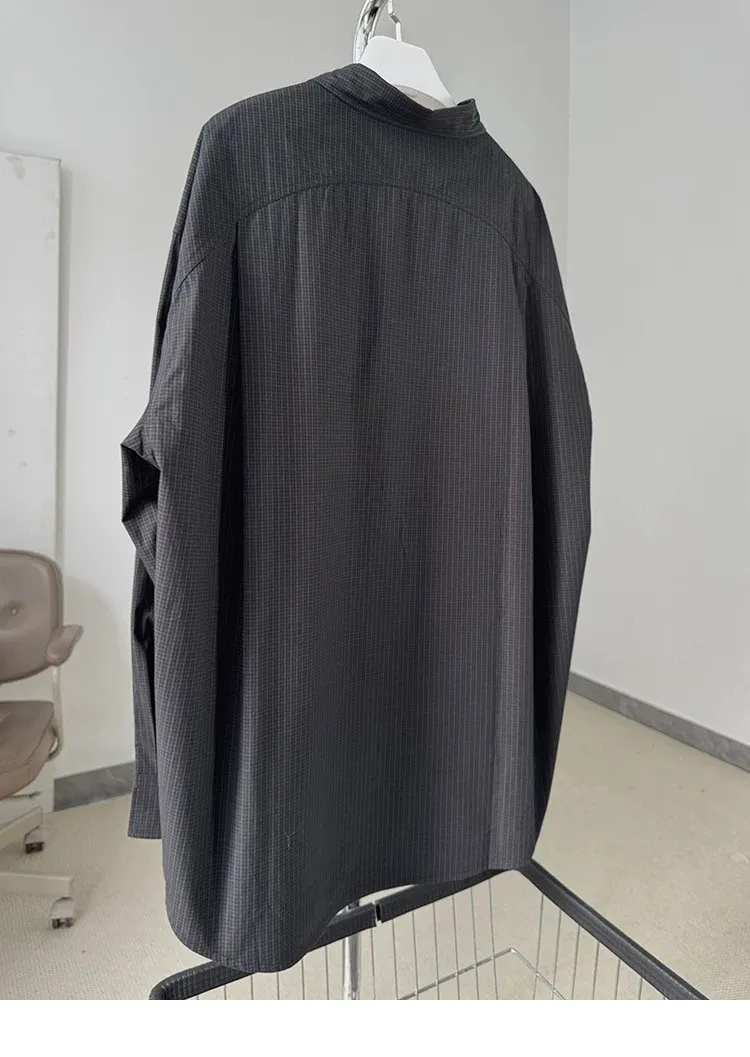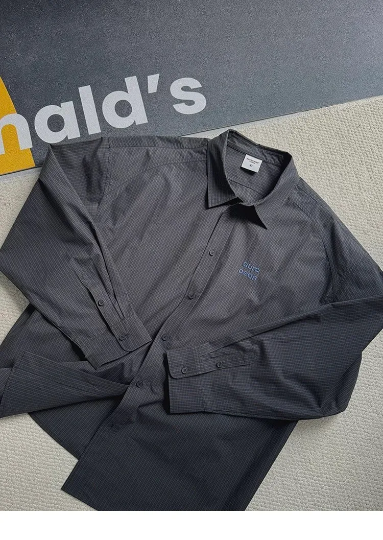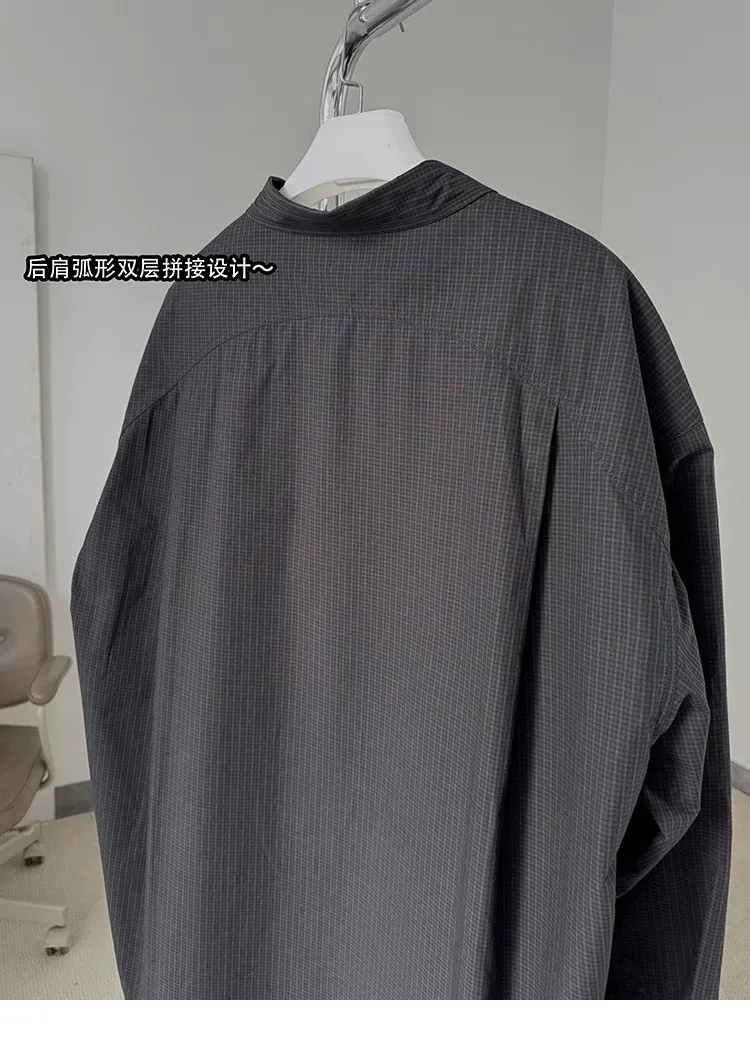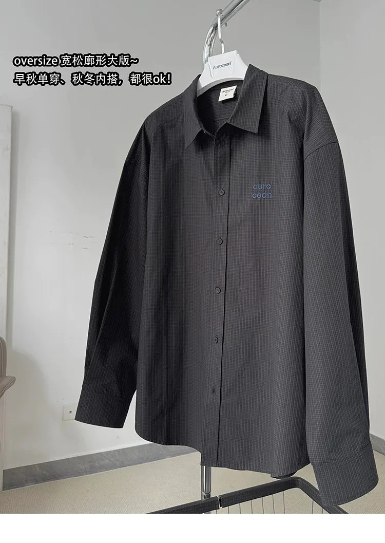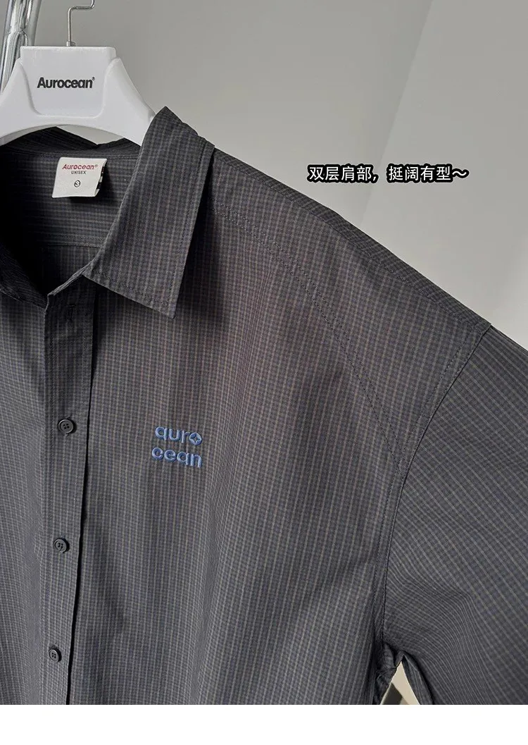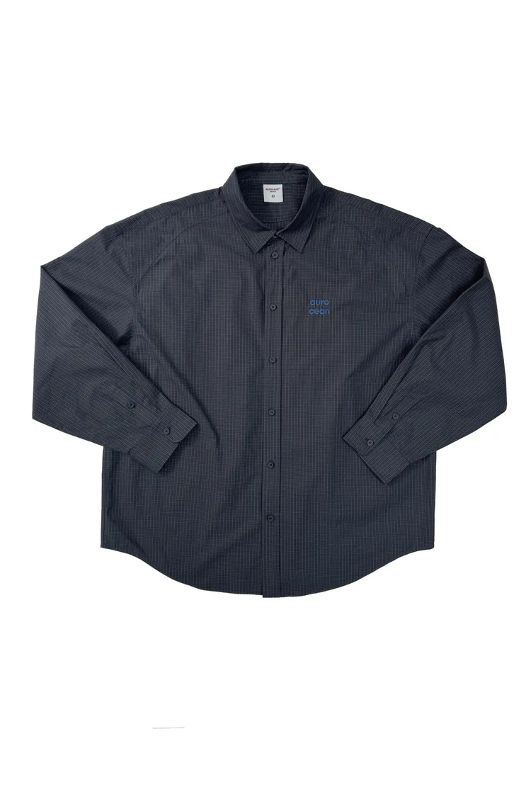 AUROCEAN 格紋肌理 撞色刺繡 寬肩 襯衫(黑色)