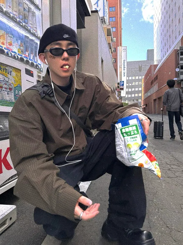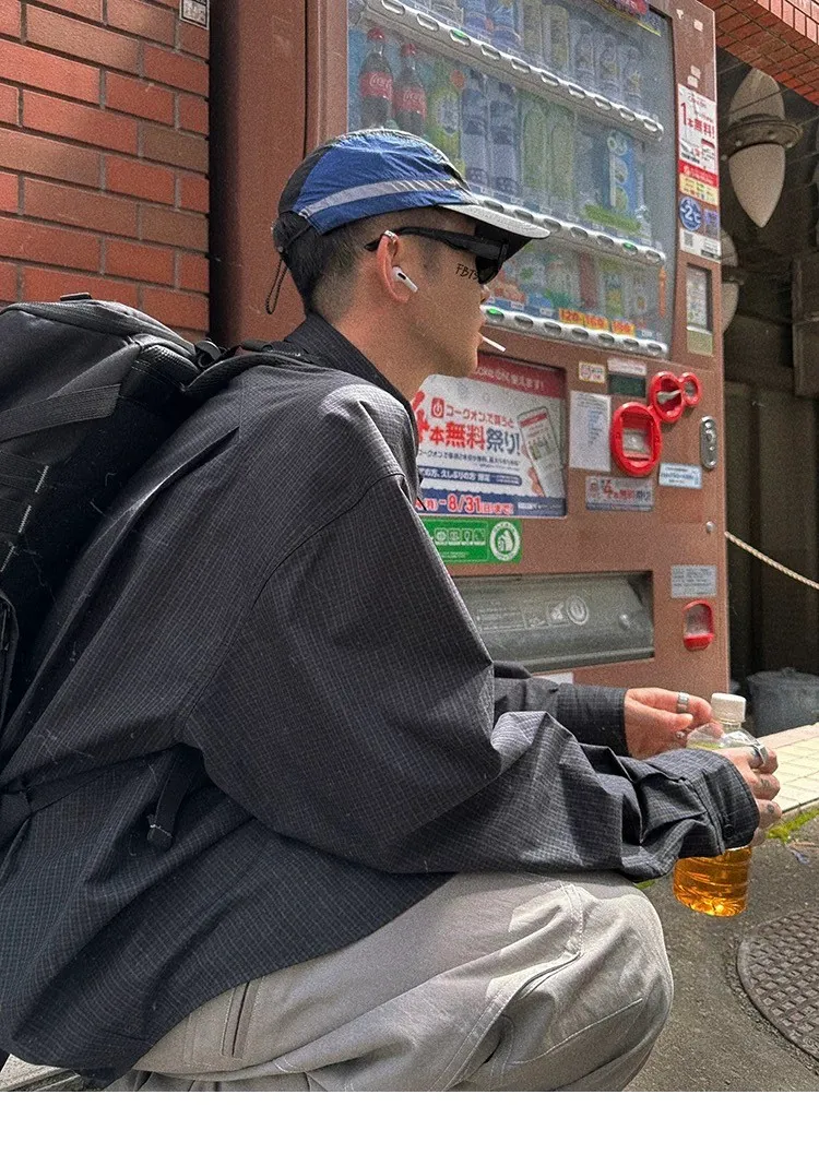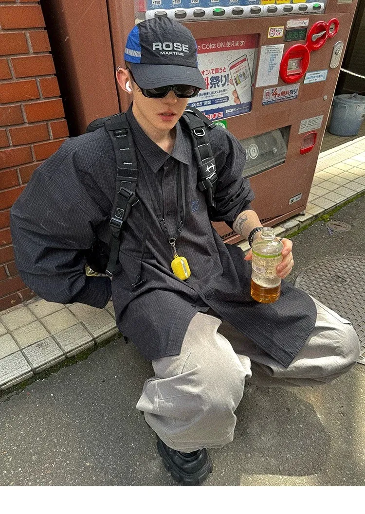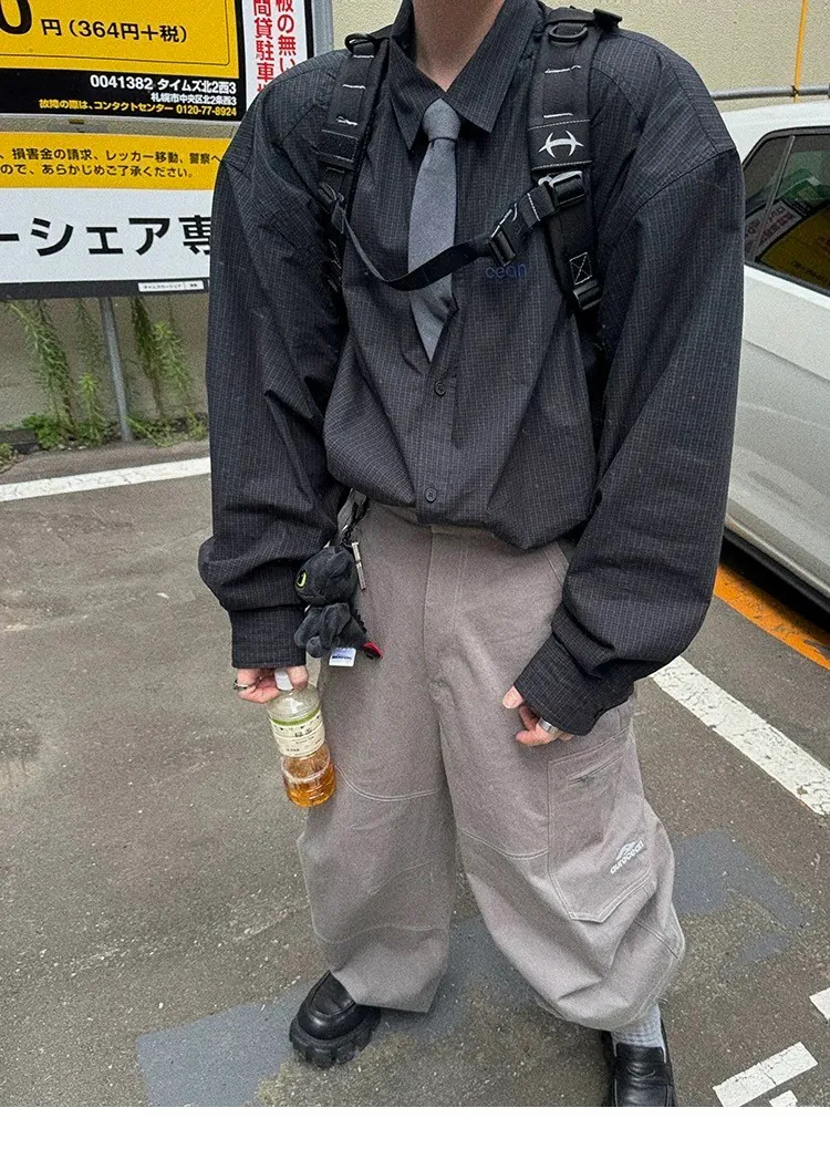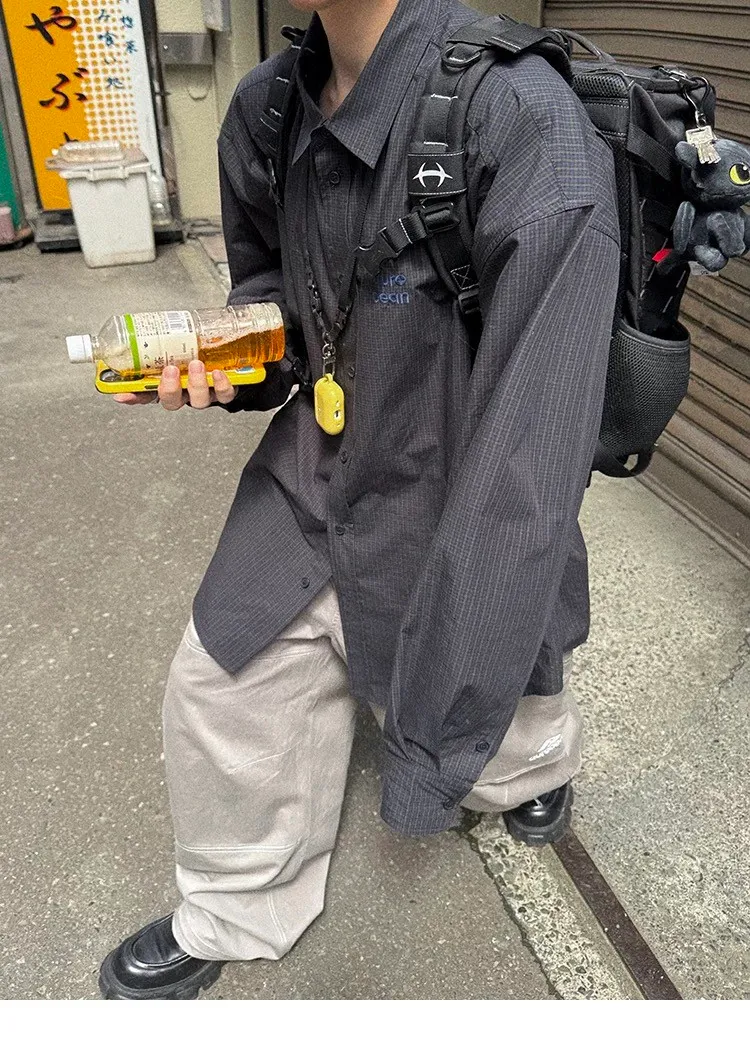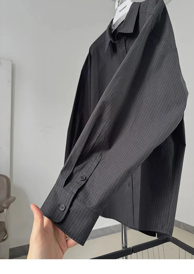 AUROCEAN 格紋肌理 撞色刺繡 寬肩 襯衫(黑色)