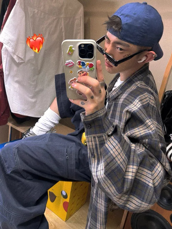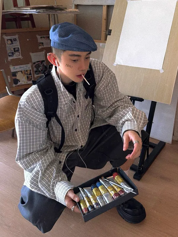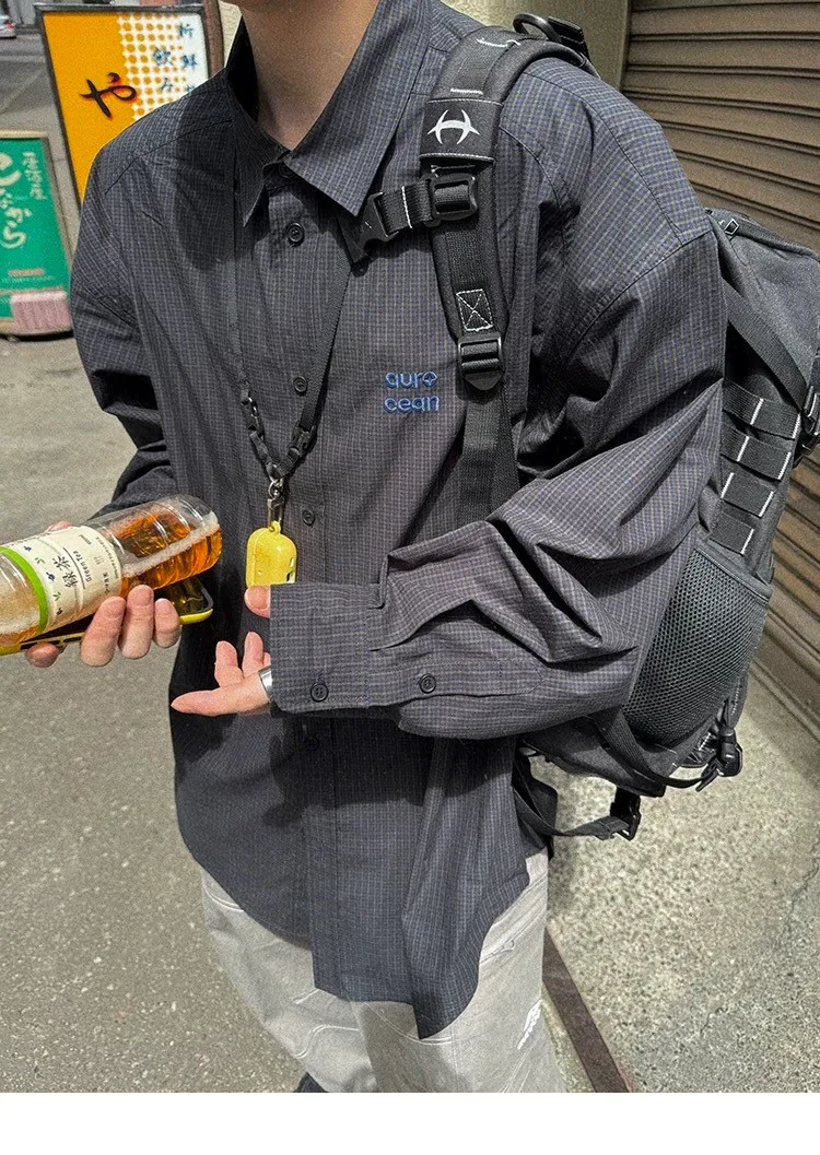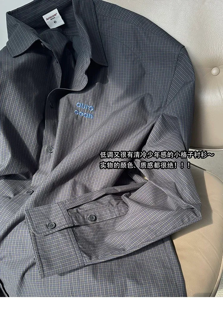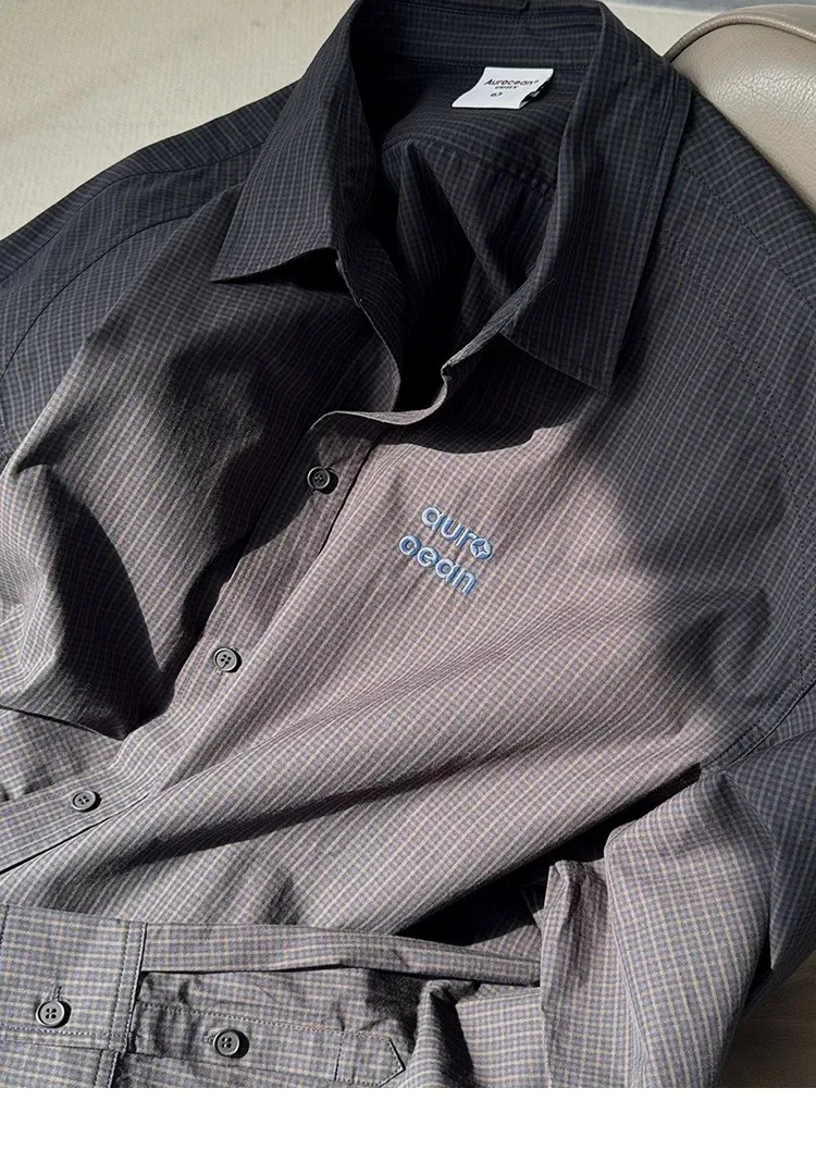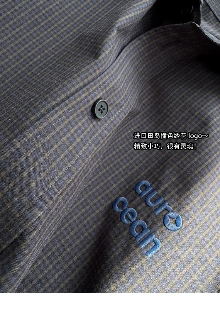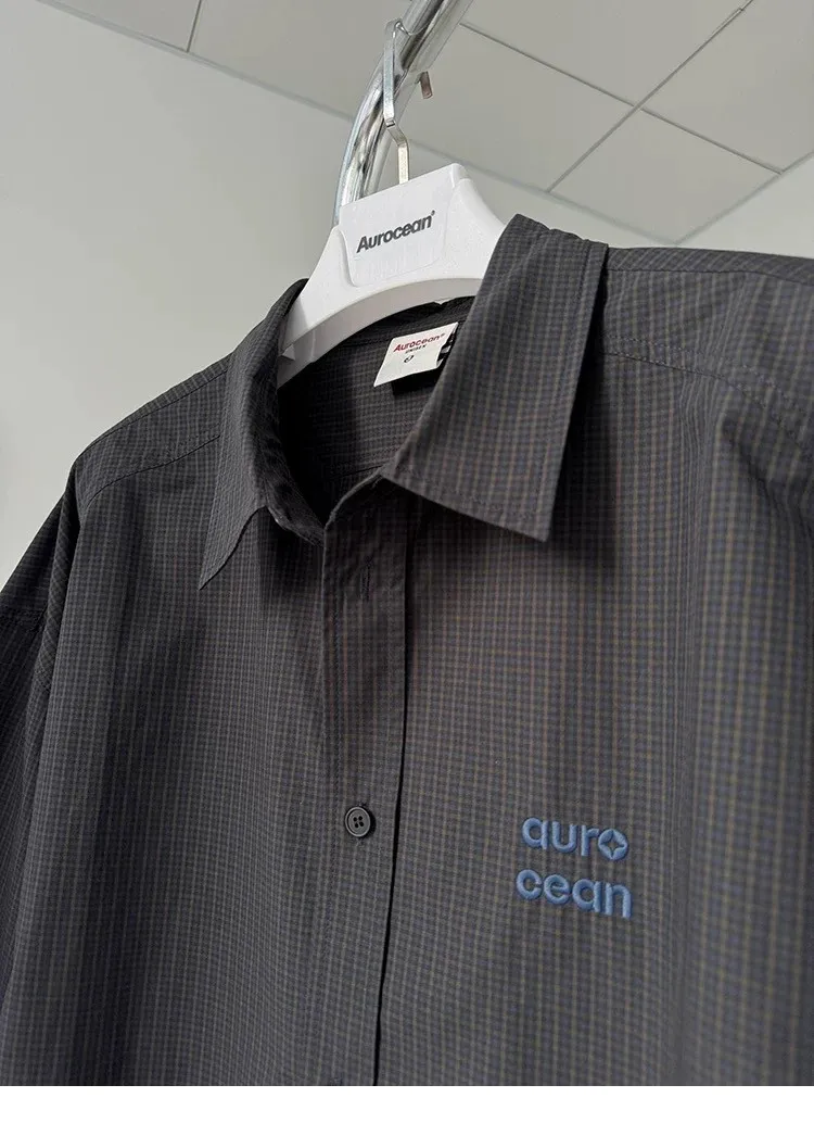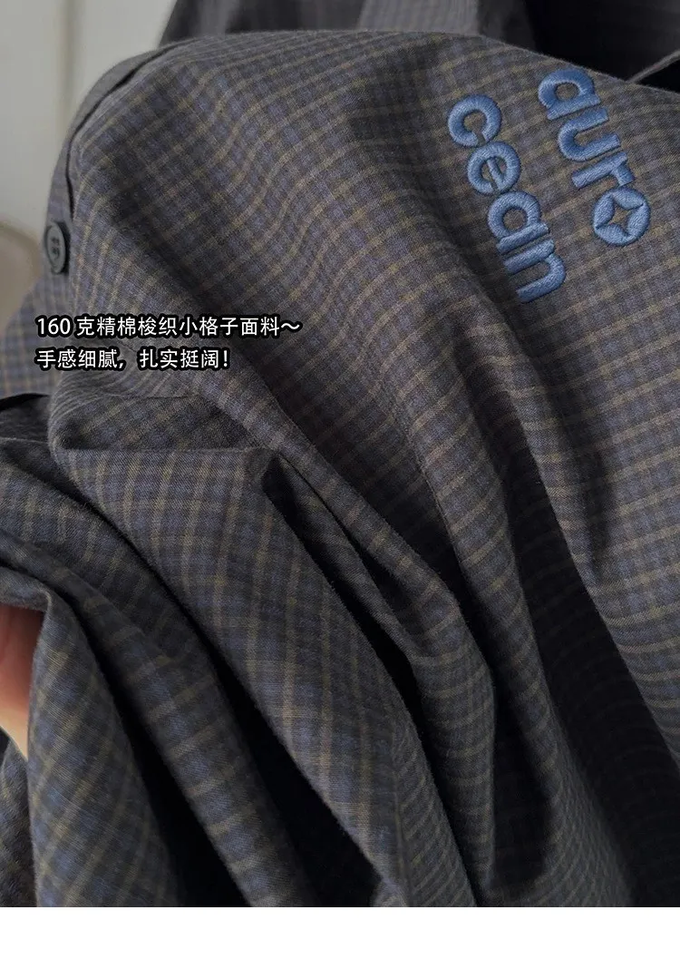 AUROCEAN 撞色刺繡 小格紋 學院 襯衫(藏青)