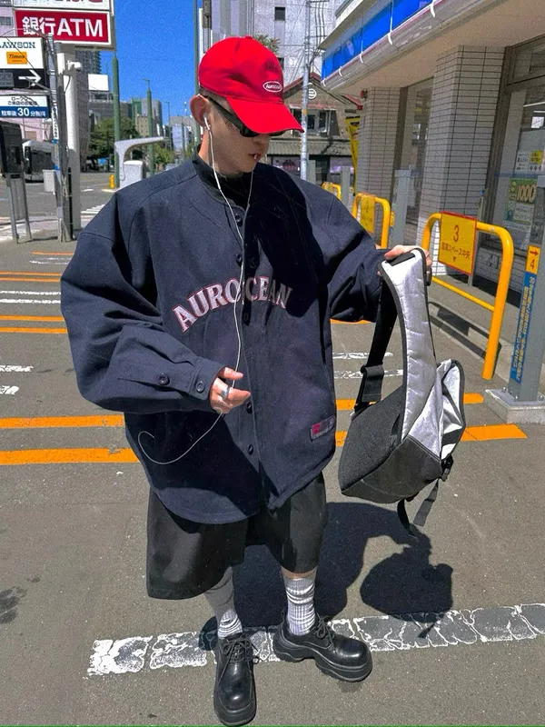 AUROCEAN 撞色刺繡 布章 棒球外套(藏青)
