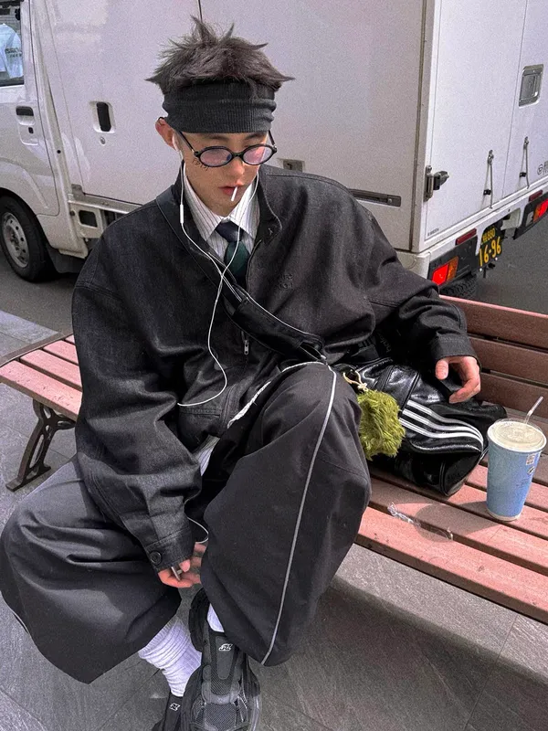 AUROCEAN 水洗丹寧 復古少年 小立領 外套(黑色)
