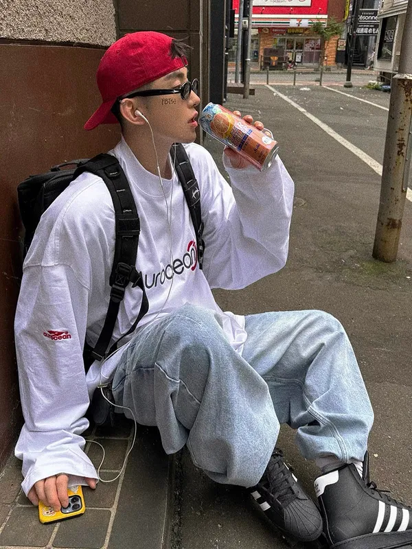 AUROCEAN 小高領 破壞水洗 LOGO 長袖(白色)
