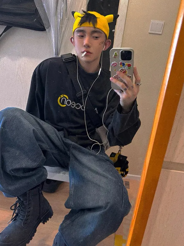 AUROCEAN 小高領 破壞水洗 LOGO 長袖(水洗黑)