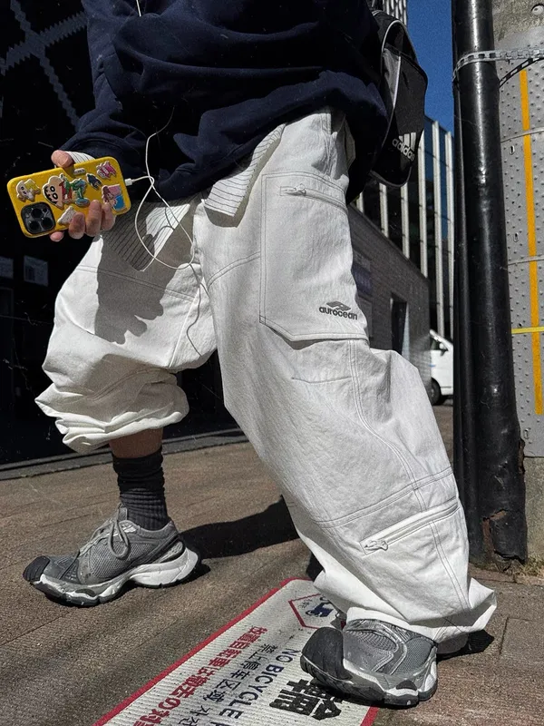 AUROCEAN 機能小子 多口袋縫線 寬鬆 長褲(白色)
