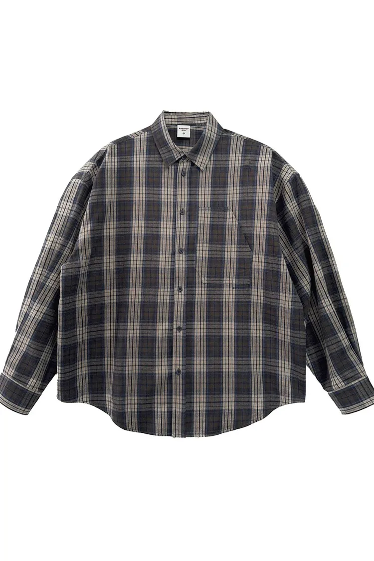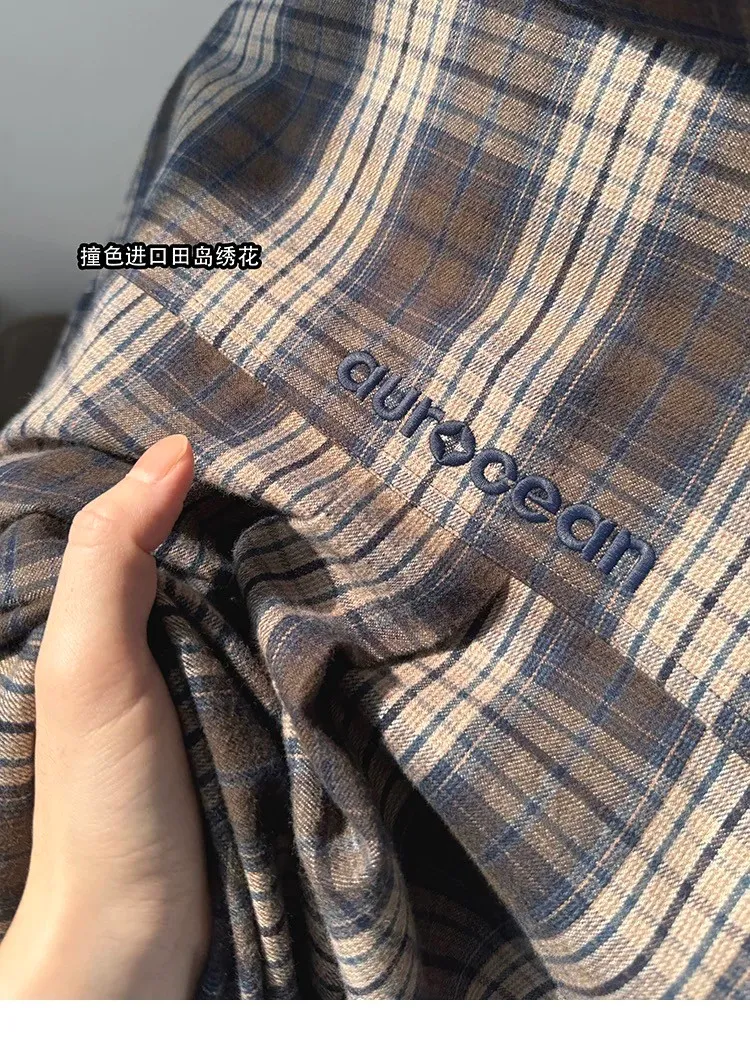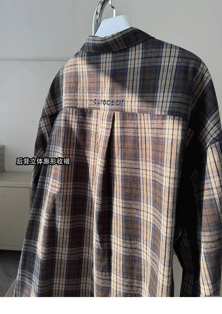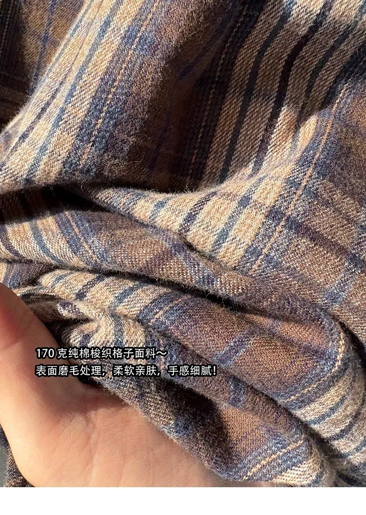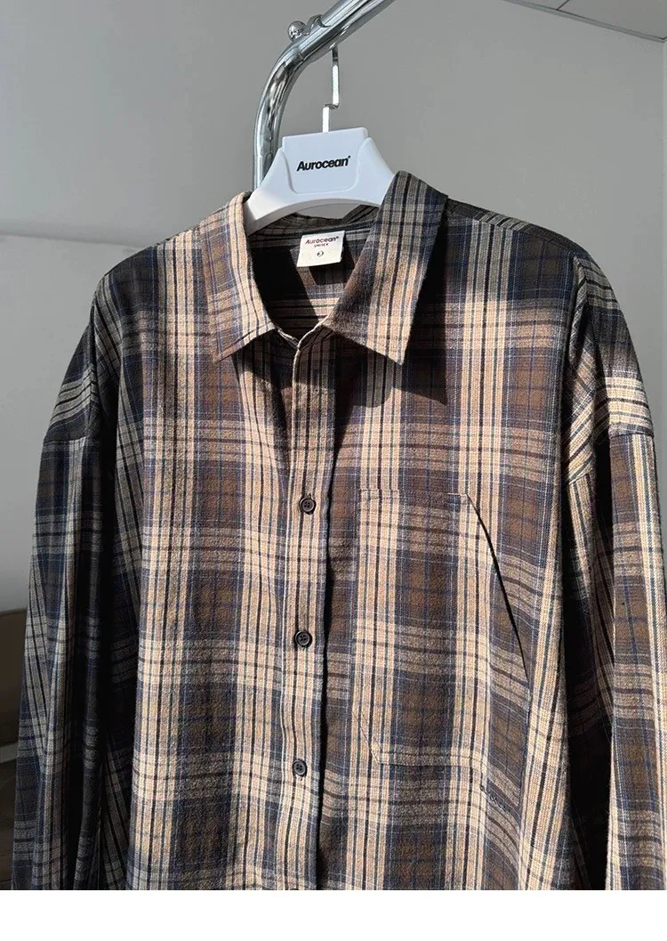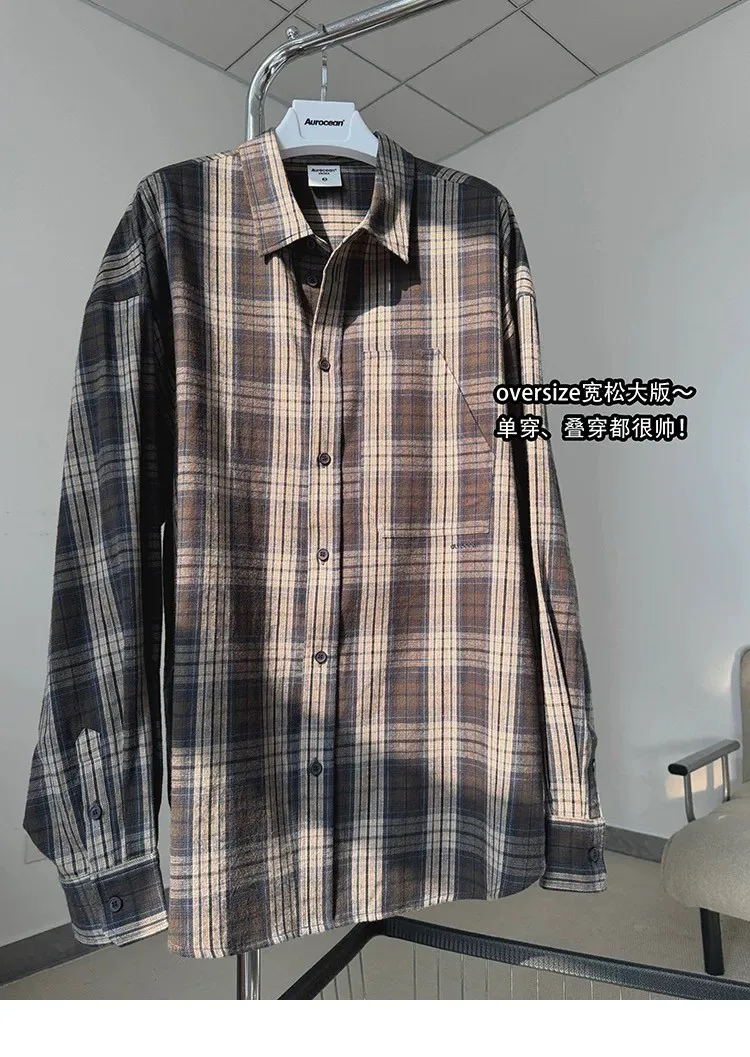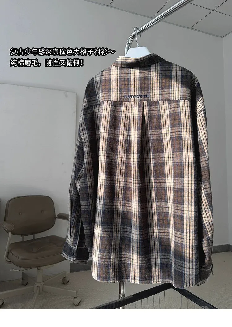 AUROCEAN 復古少年 大格紋 純棉磨毛 襯衫(深咖)