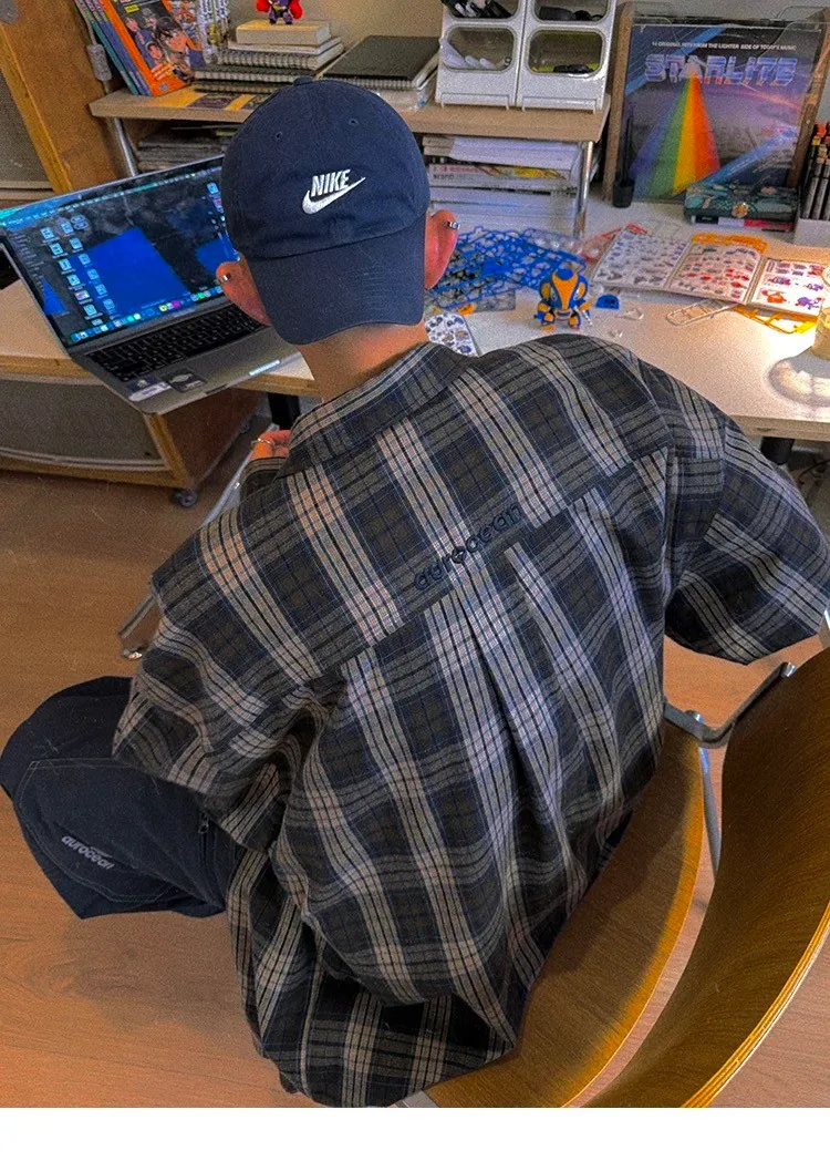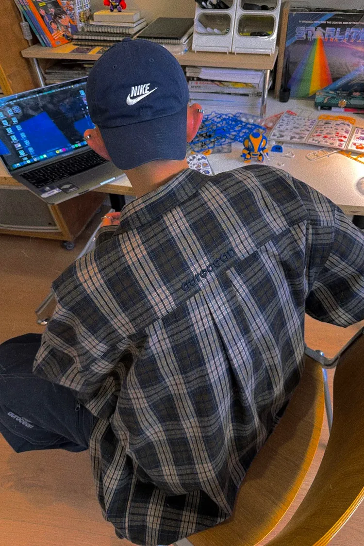 AUROCEAN 撞色刺繡 小格紋 學院 襯衫(藏青)