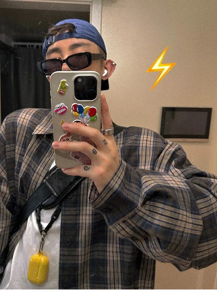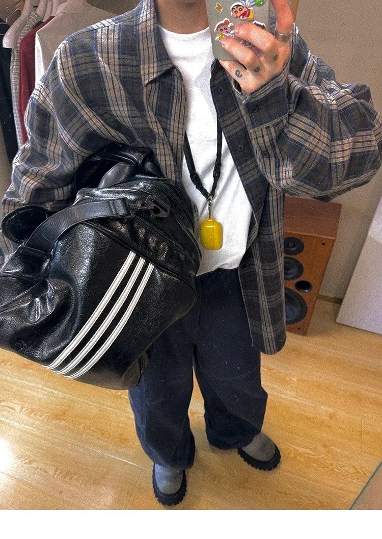 AUROCEAN 格紋肌理 撞色刺繡 寬肩 襯衫(黑色)