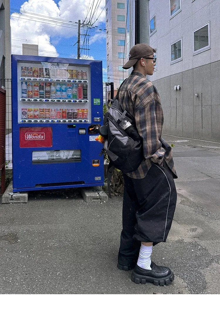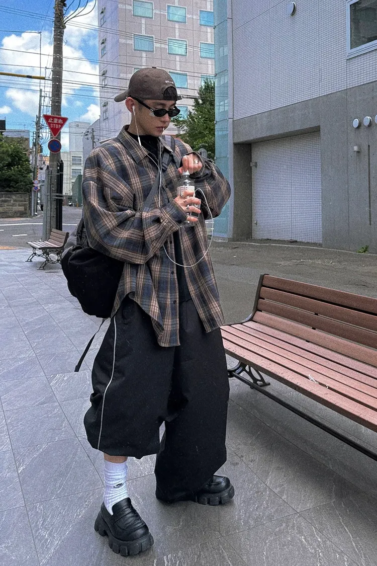AUROCEAN 格紋肌理 撞色刺繡 寬肩 襯衫(黑色)