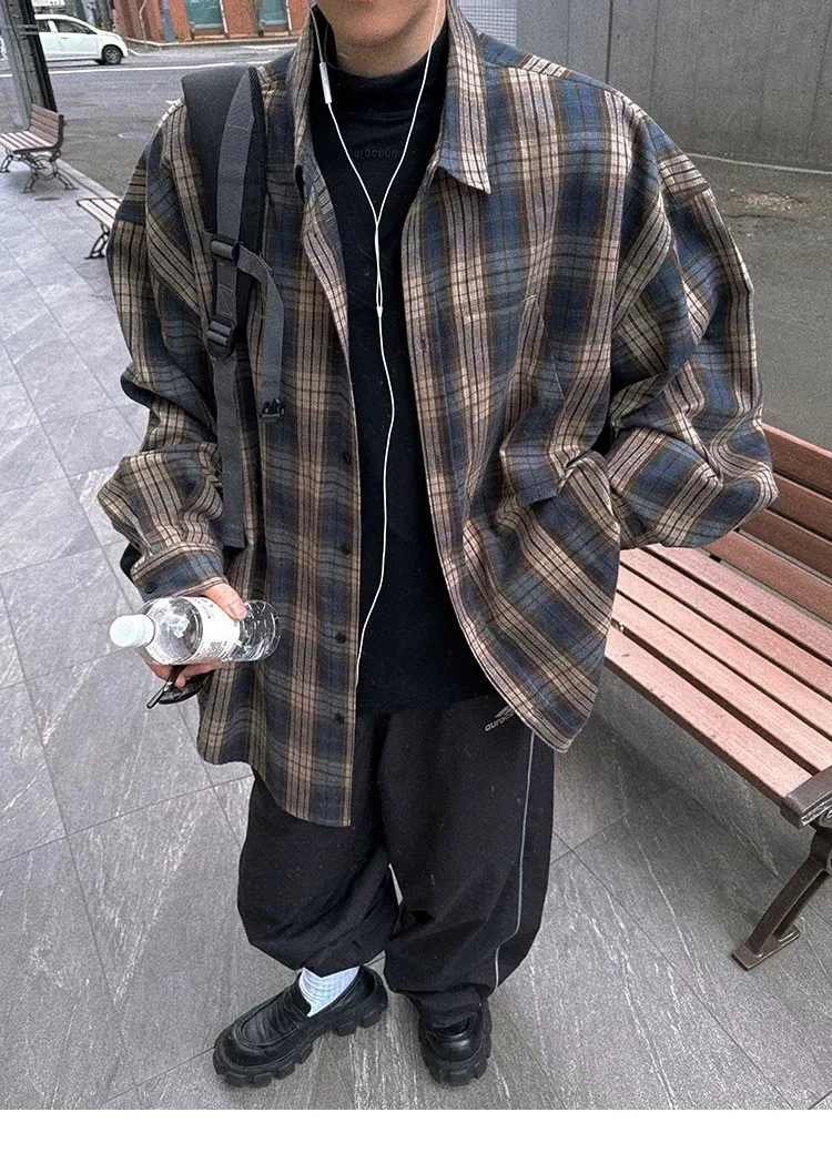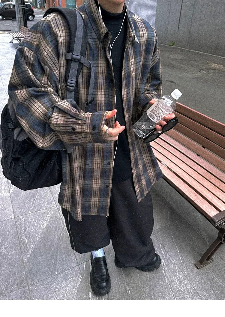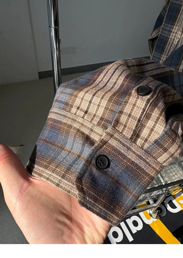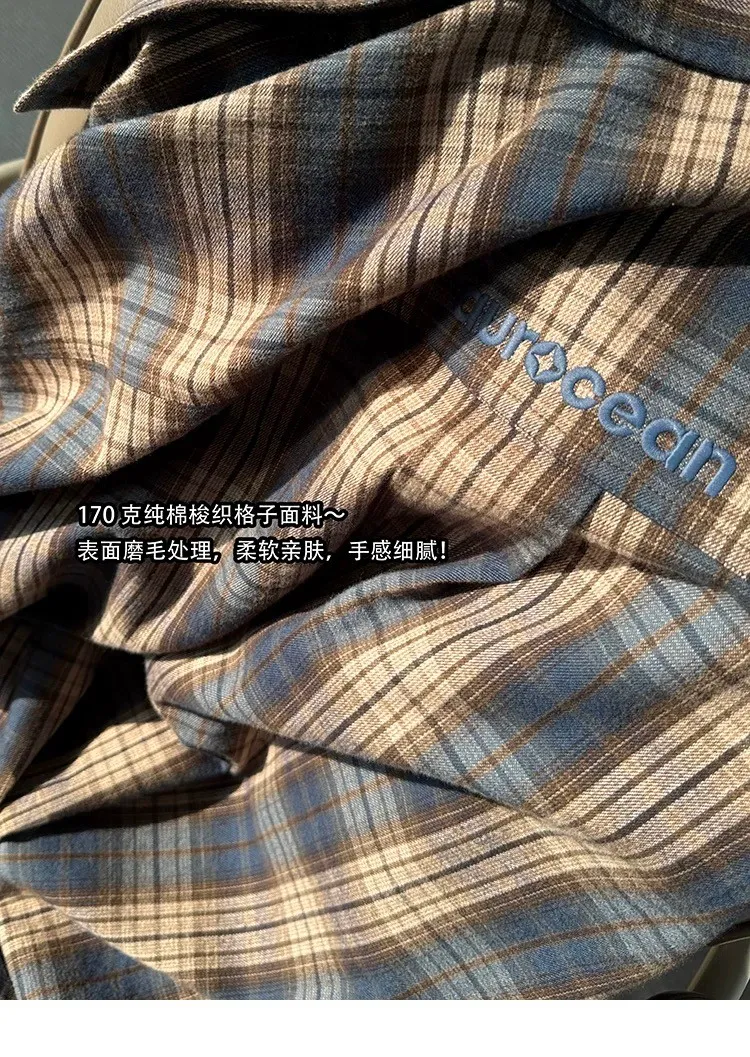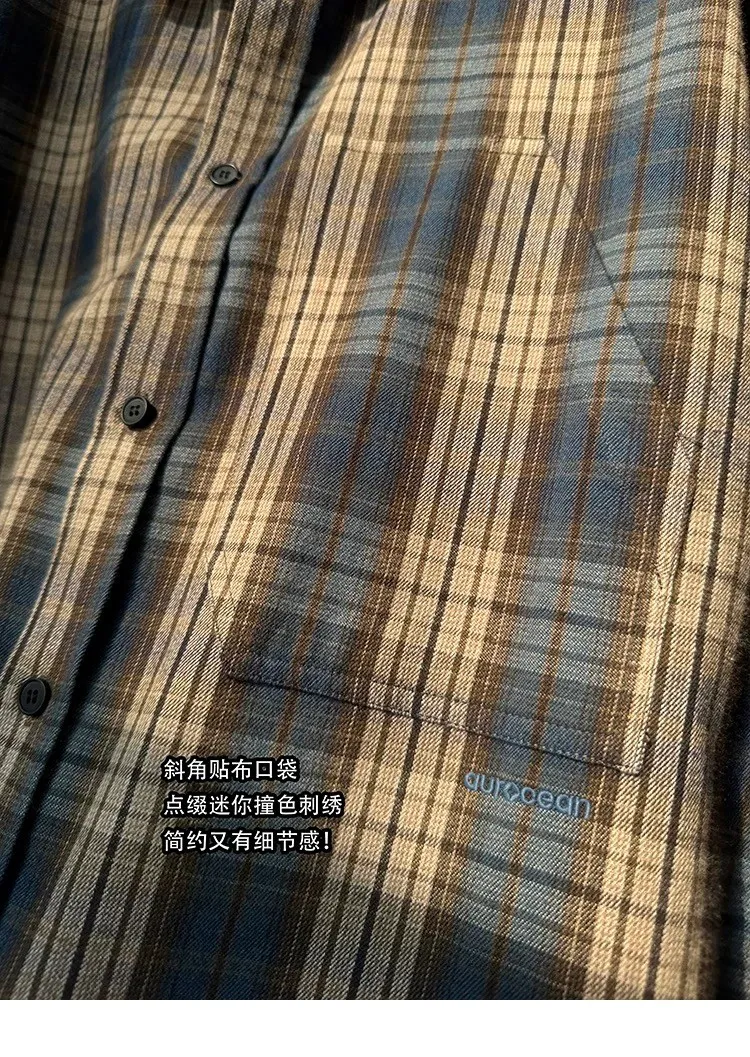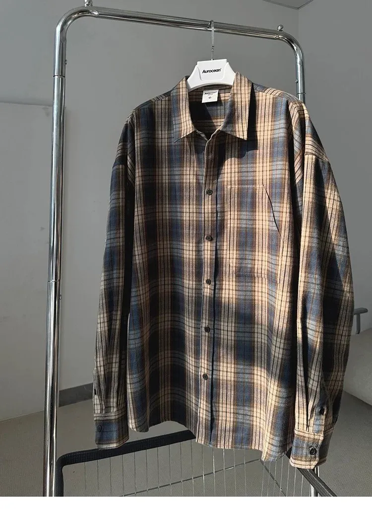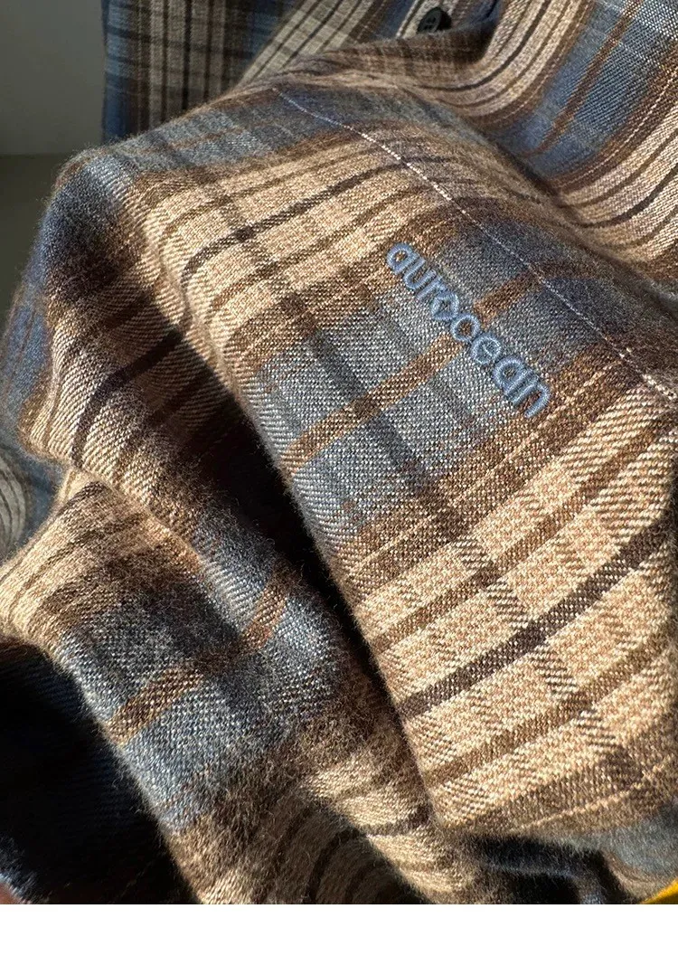 AUROCEAN 復古少年 大格紋 純棉磨毛 襯衫(深咖)