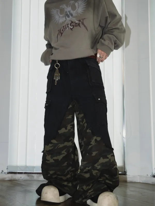 重工臘感 迷彩拼接 可拆褲管 牛仔褲(迷彩綠)