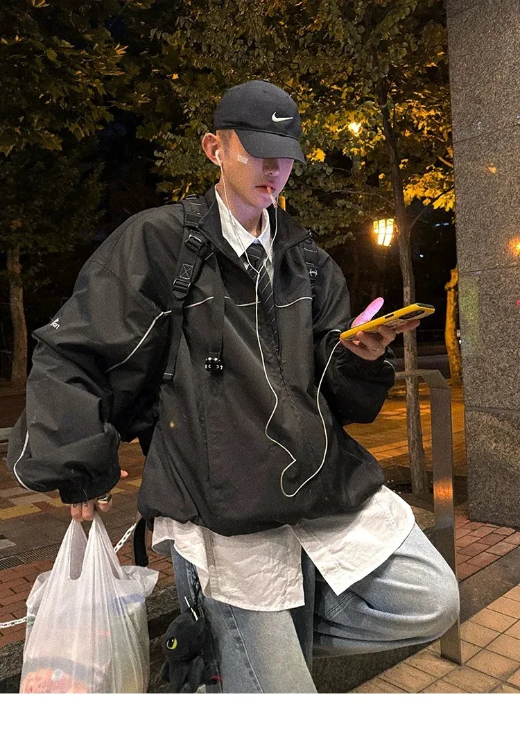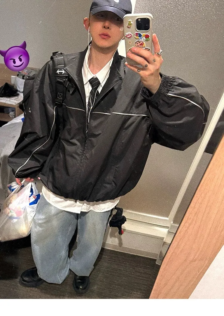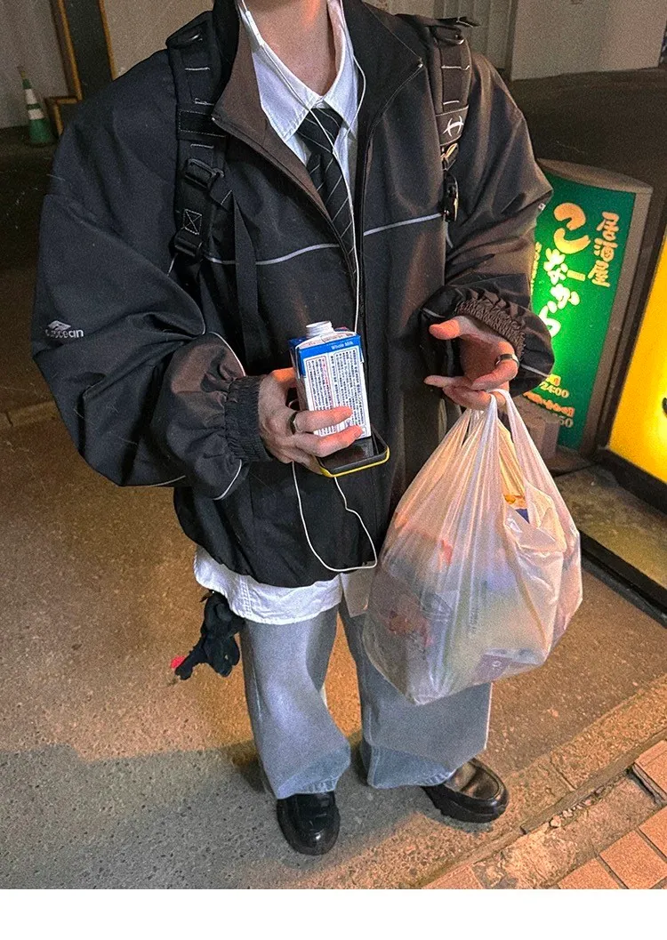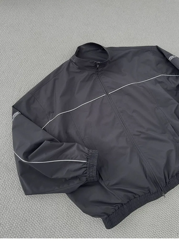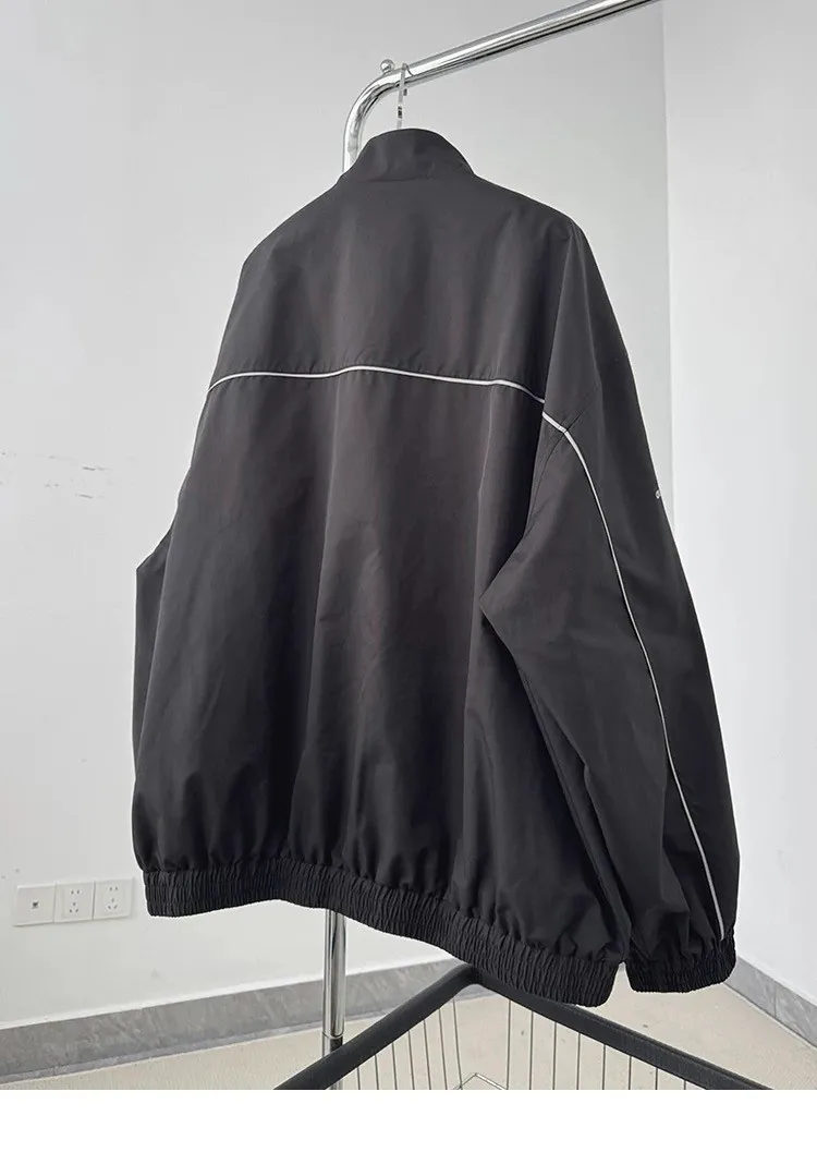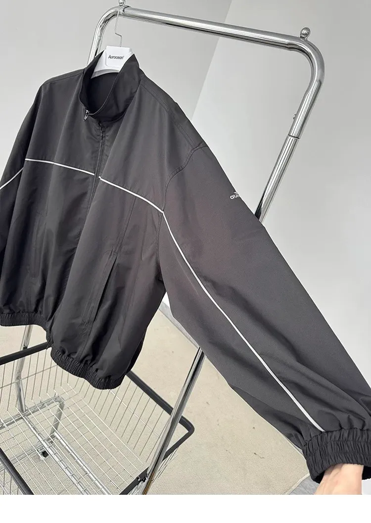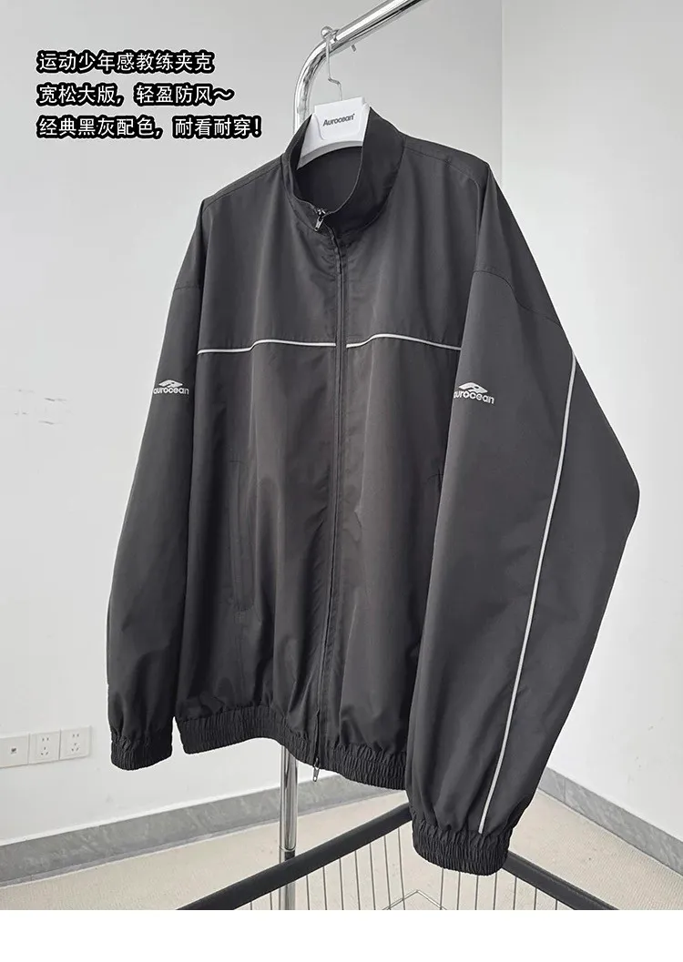 AUROCEAN 復古 撞色邊條 寬松大版 教練外套(黑色)