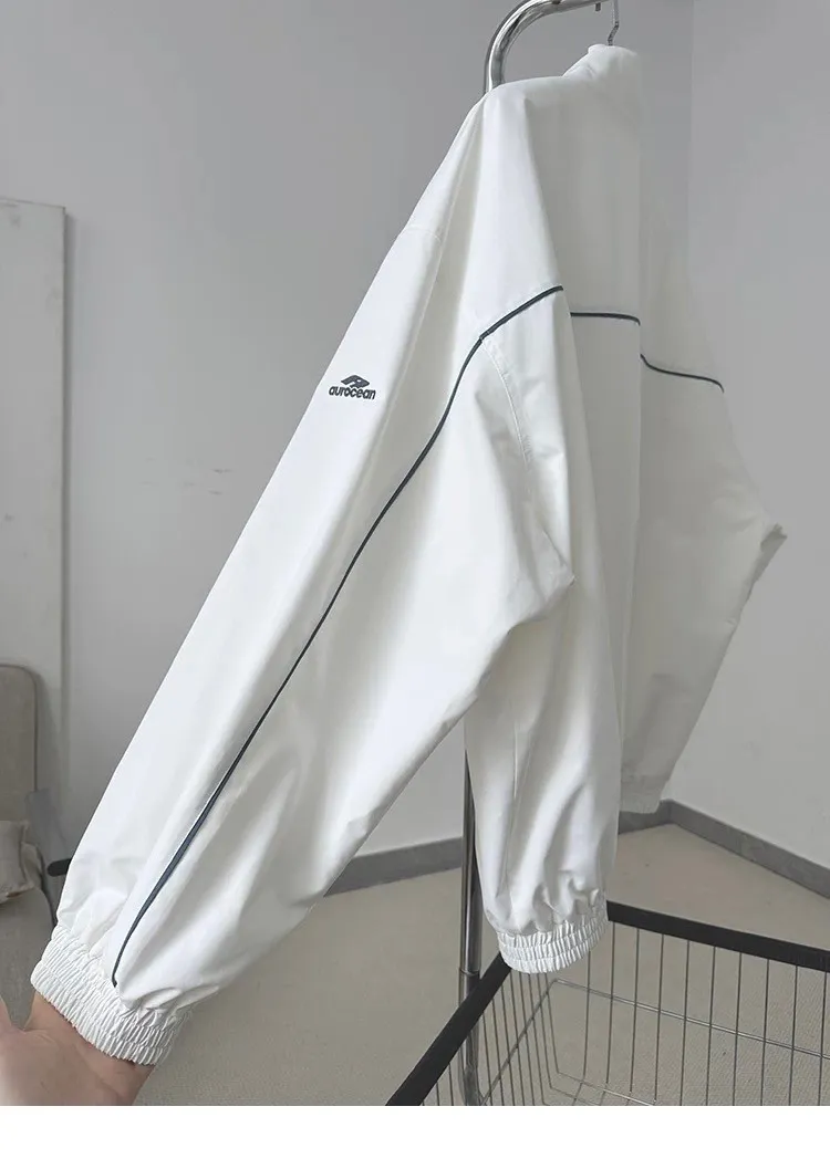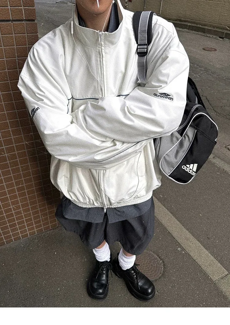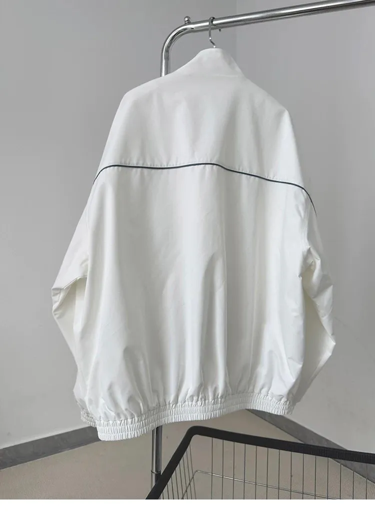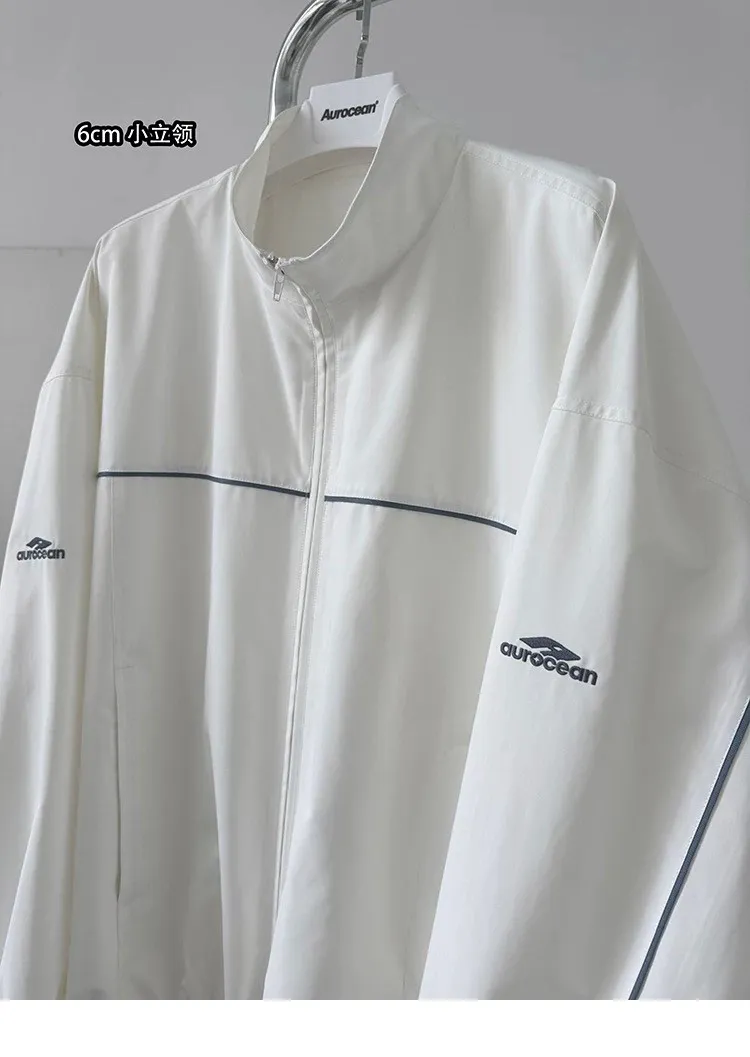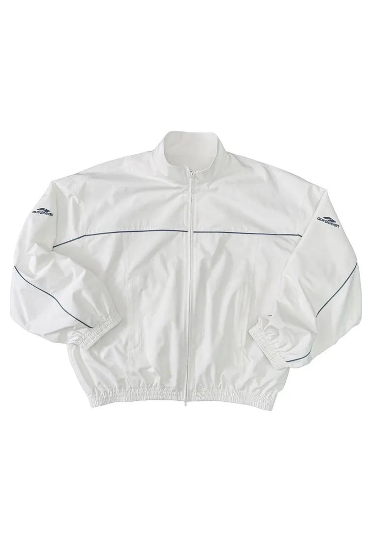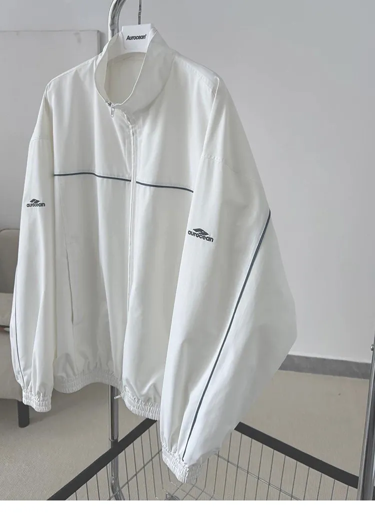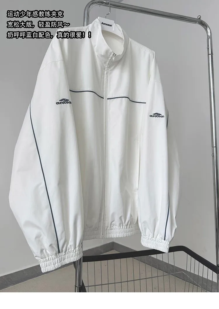 AUROCEAN 復古 撞色邊條 寬松大版 教練外套(白色)