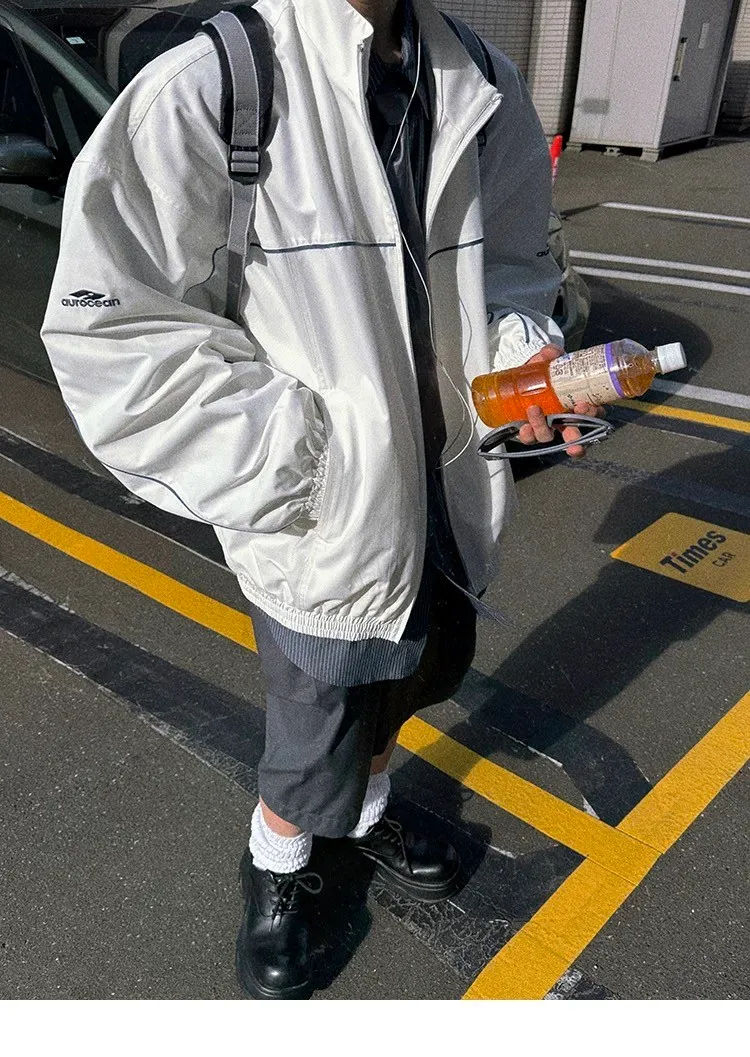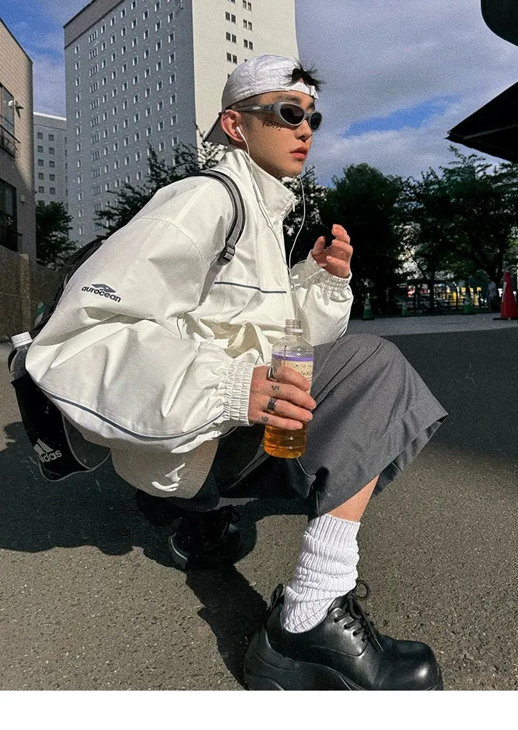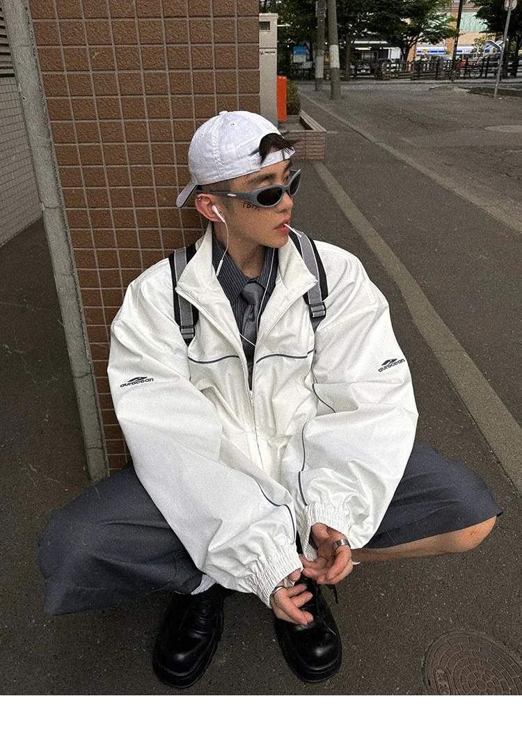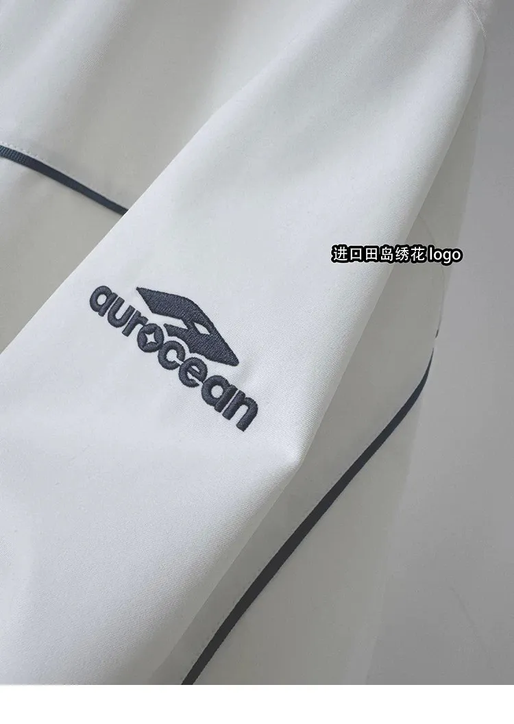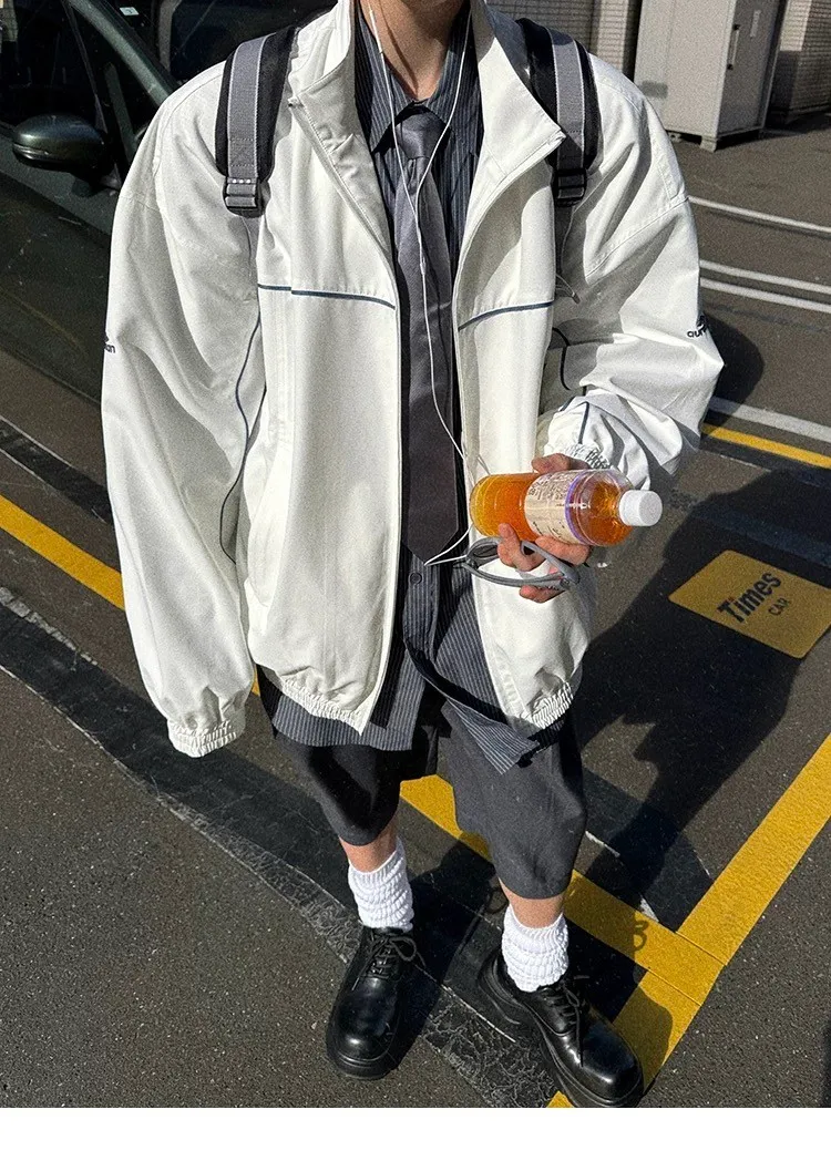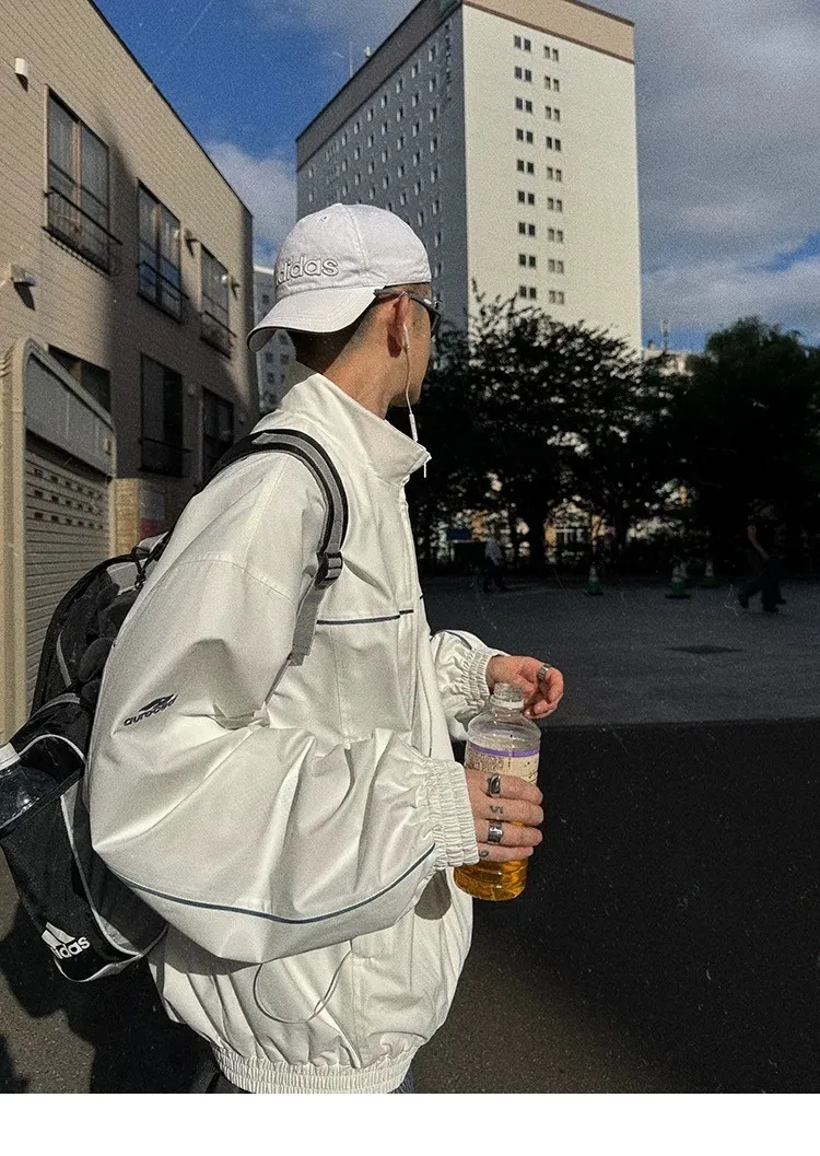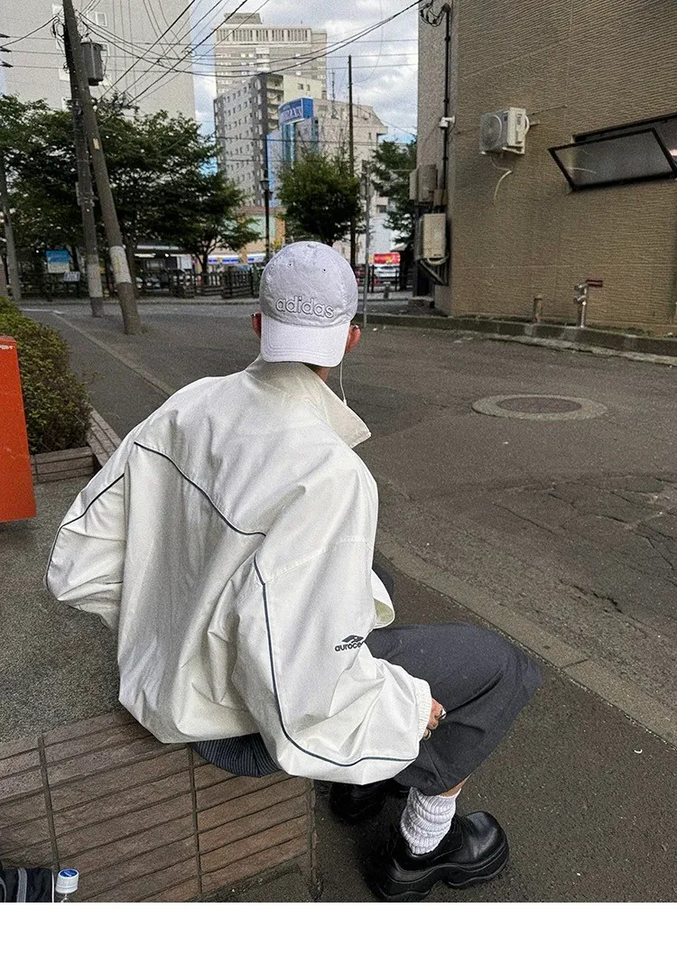 AUROCEAN 復古 撞色邊條 寬松大版 教練外套(白色)