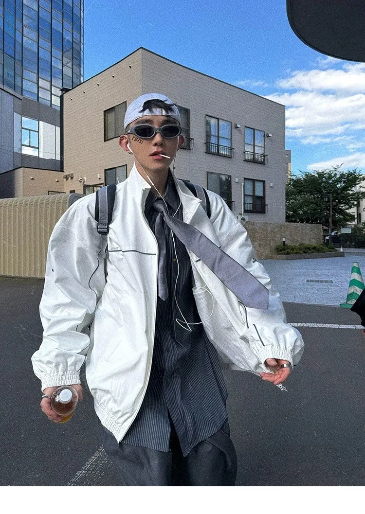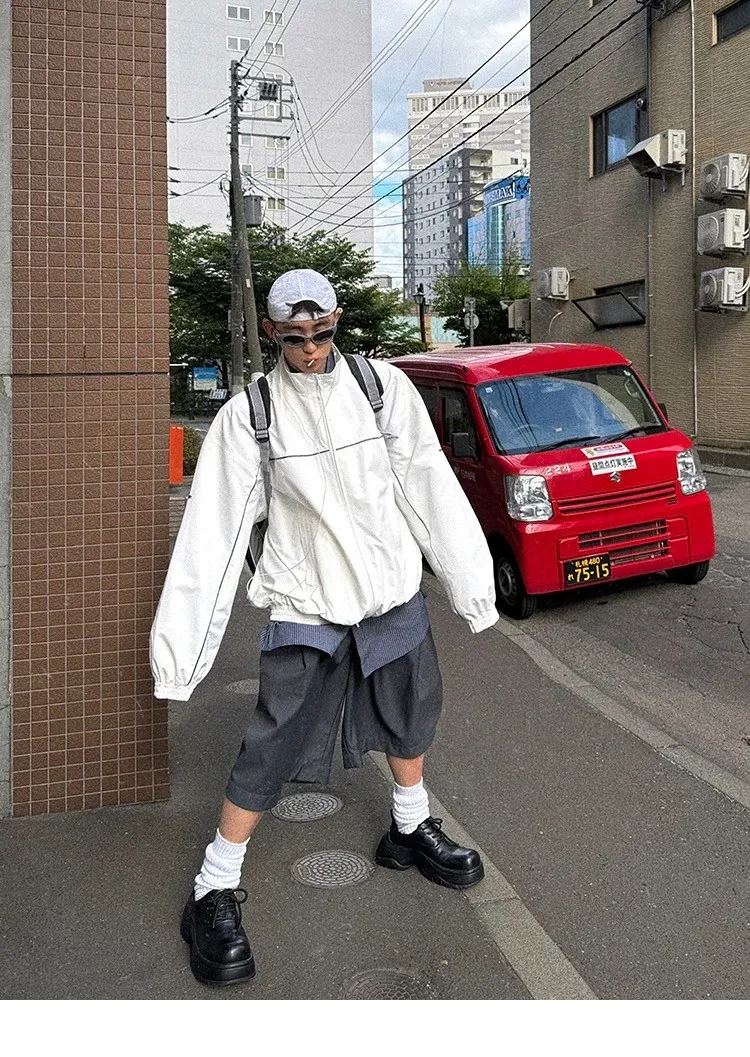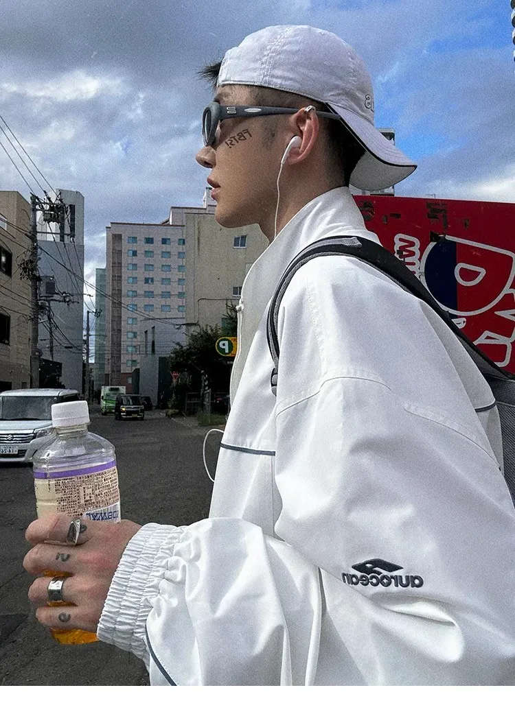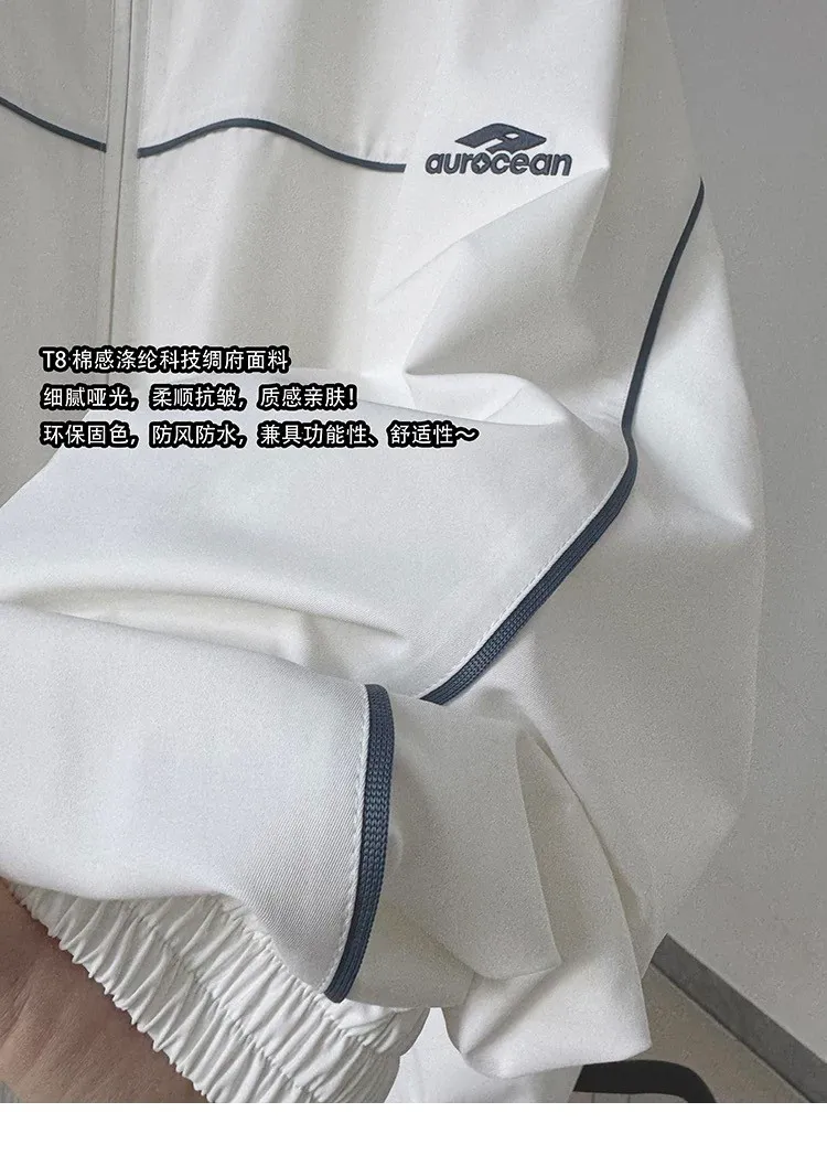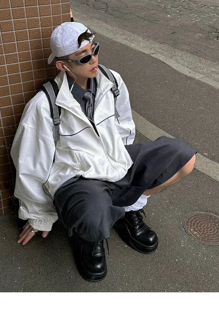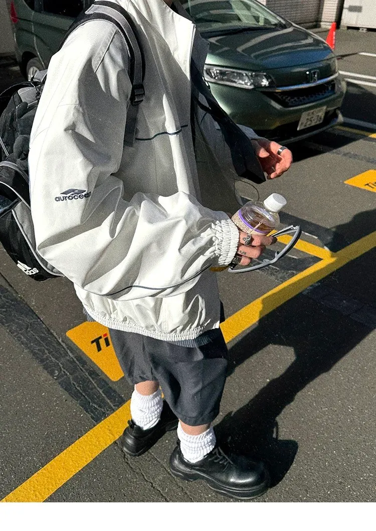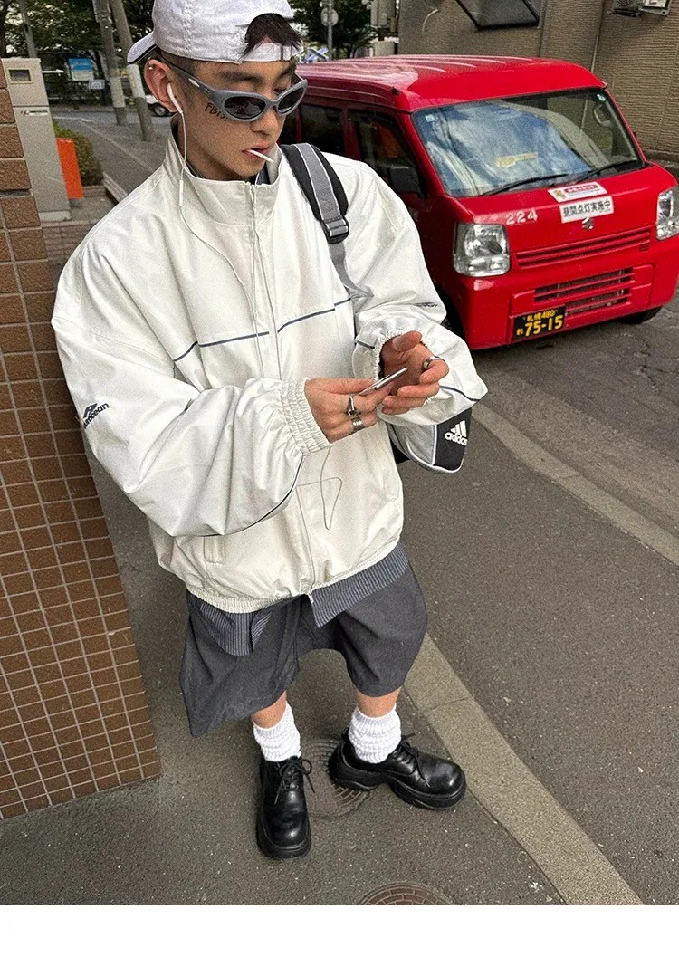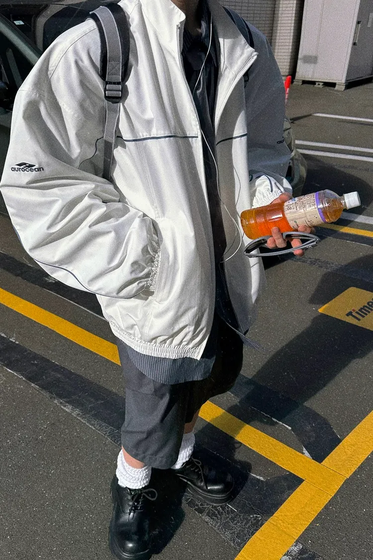 AUROCEAN 復古 撞色邊條 寬松大版 教練外套(白色)