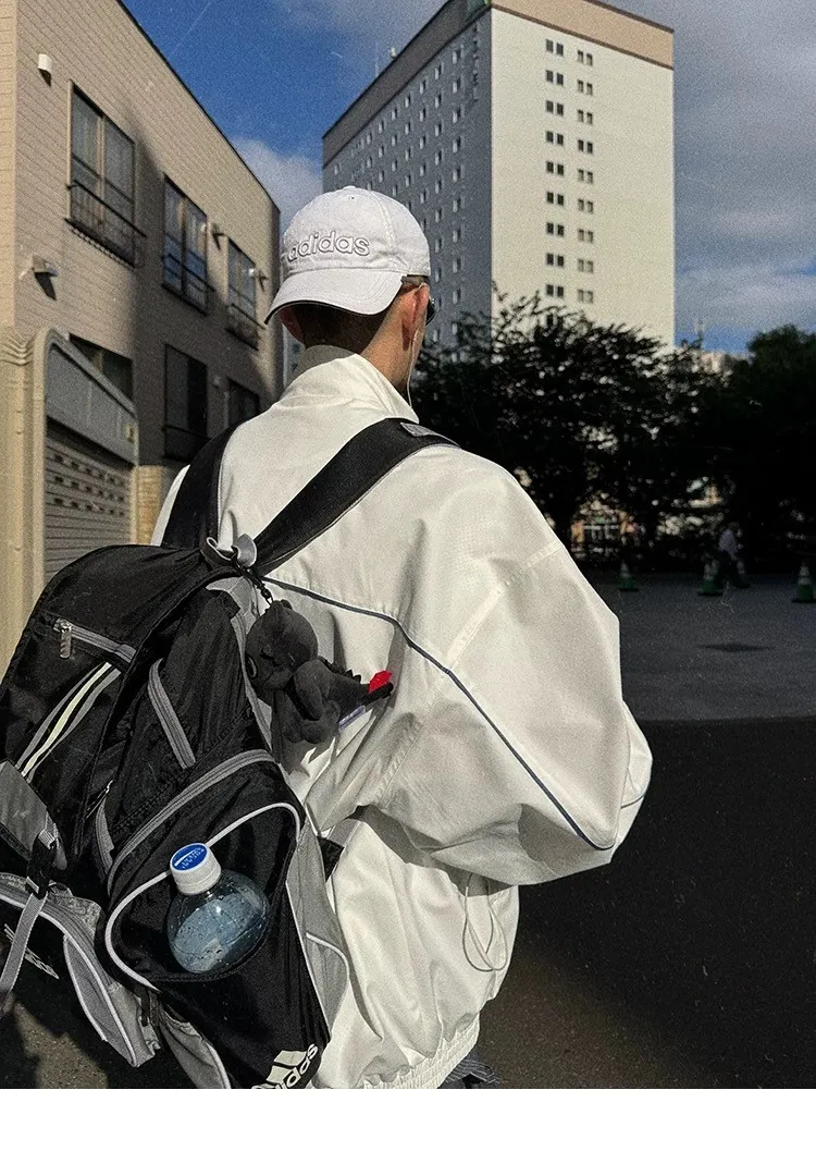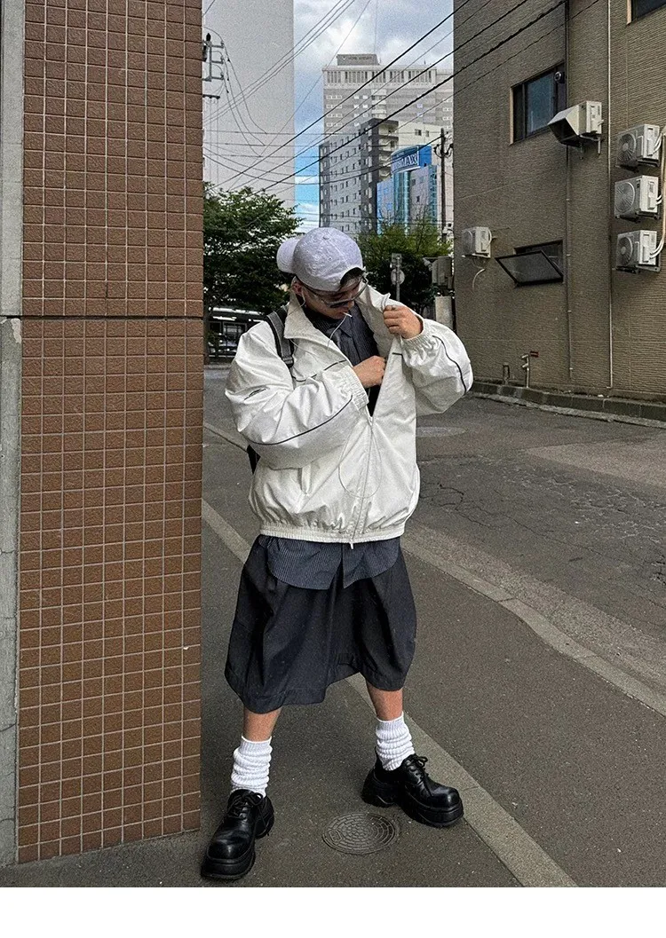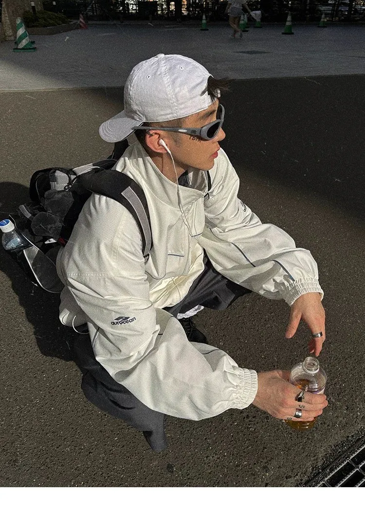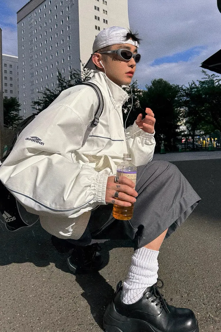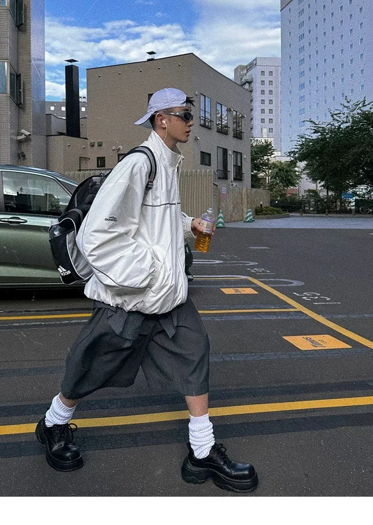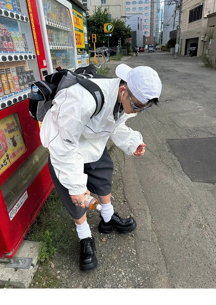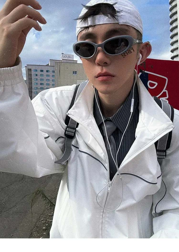 AUROCEAN 復古 撞色邊條 寬松大版 教練外套(白色)