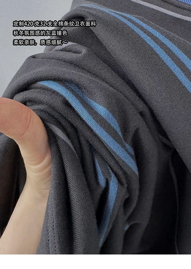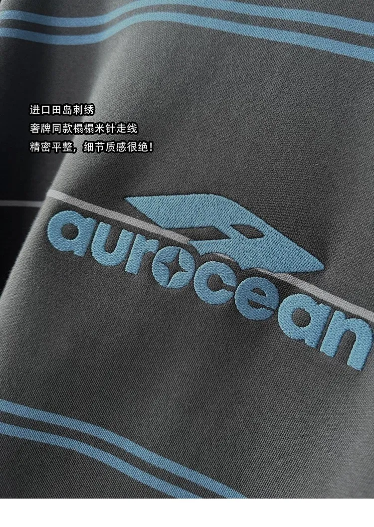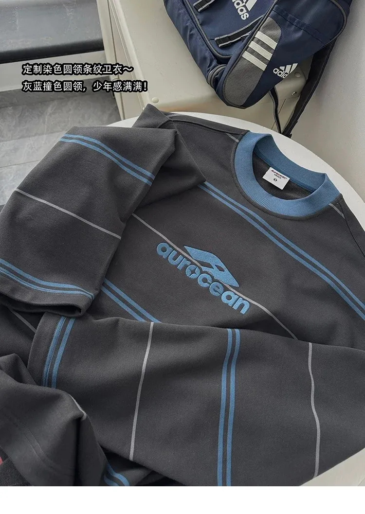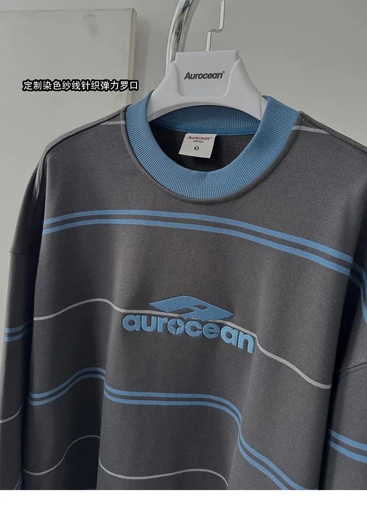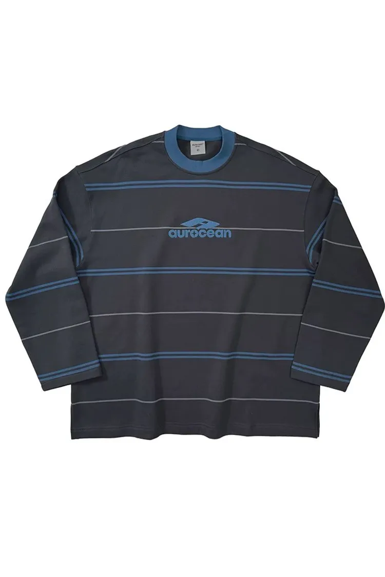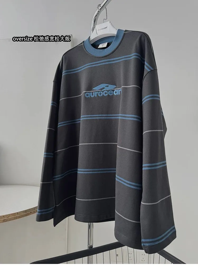 AUROCEAN 訂製條紋 420G重磅 OS 長袖(灰藍條紋)