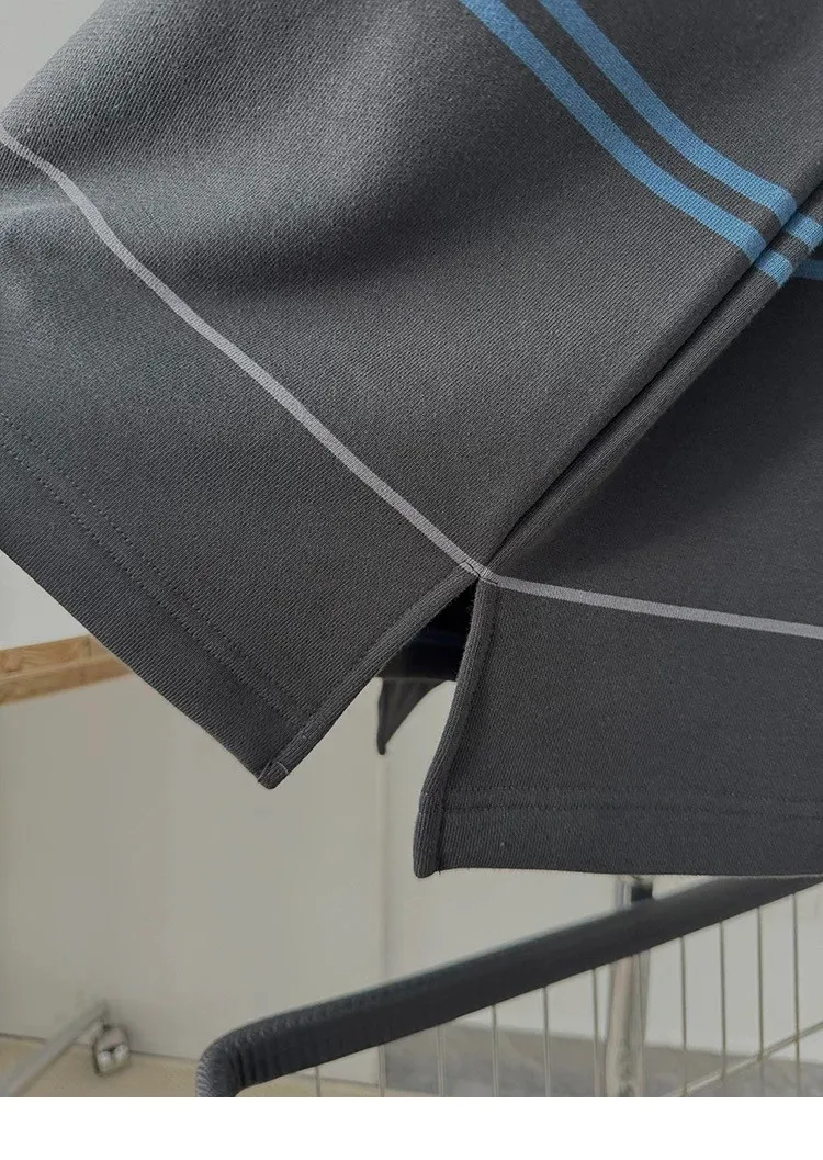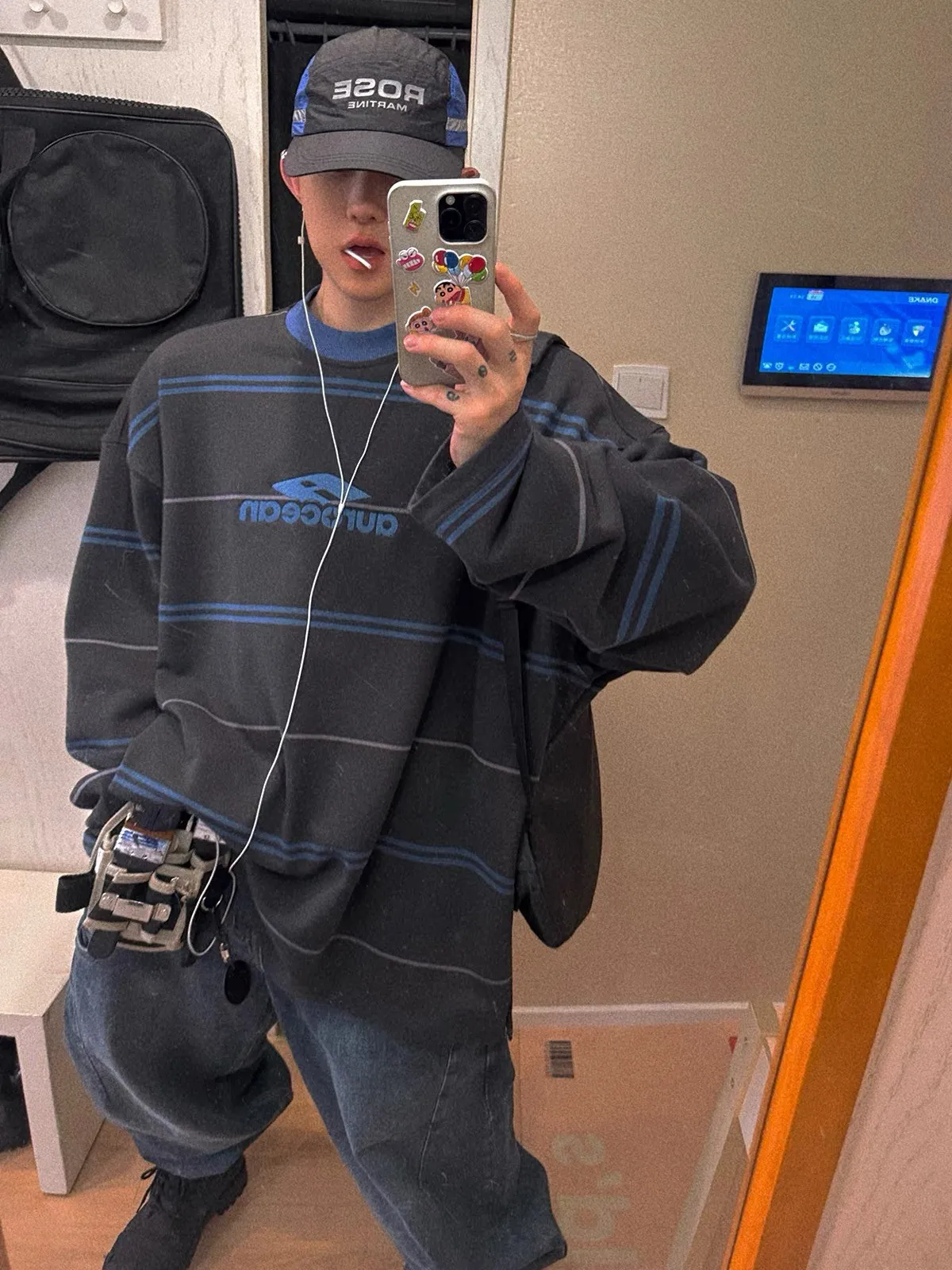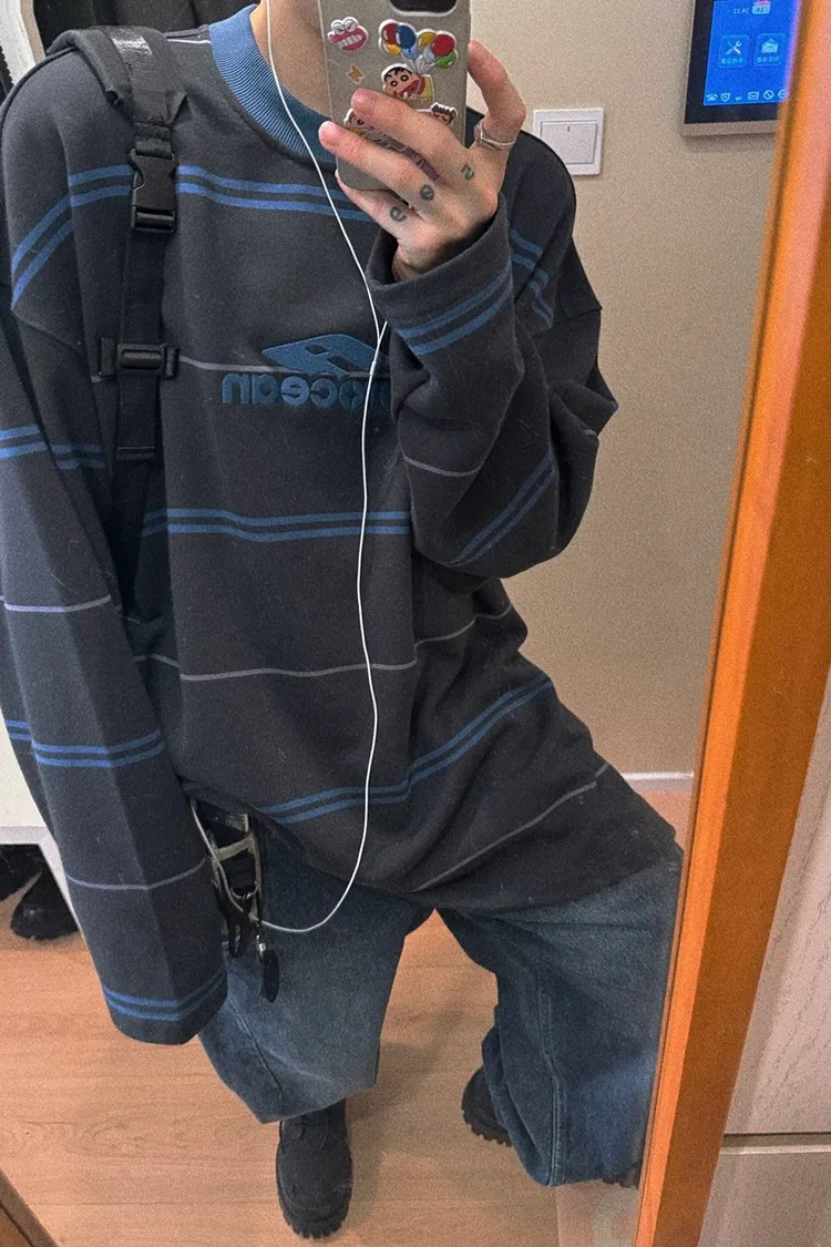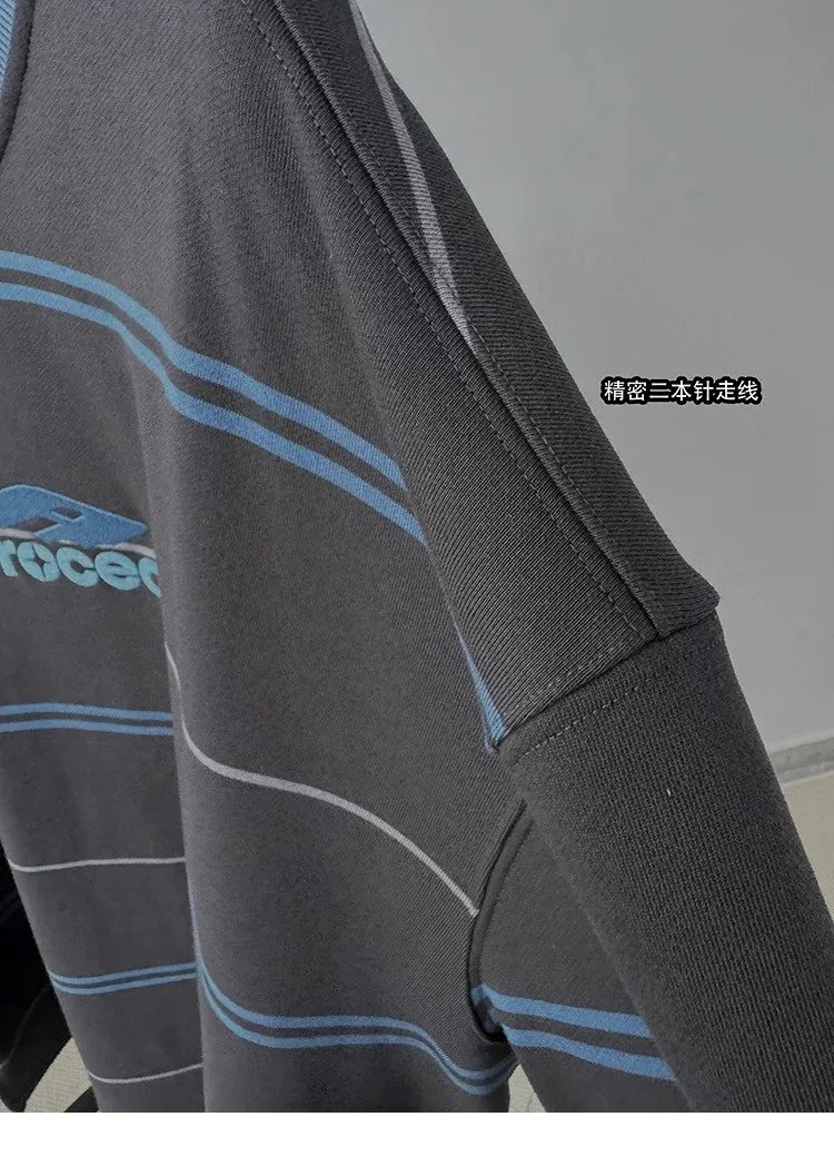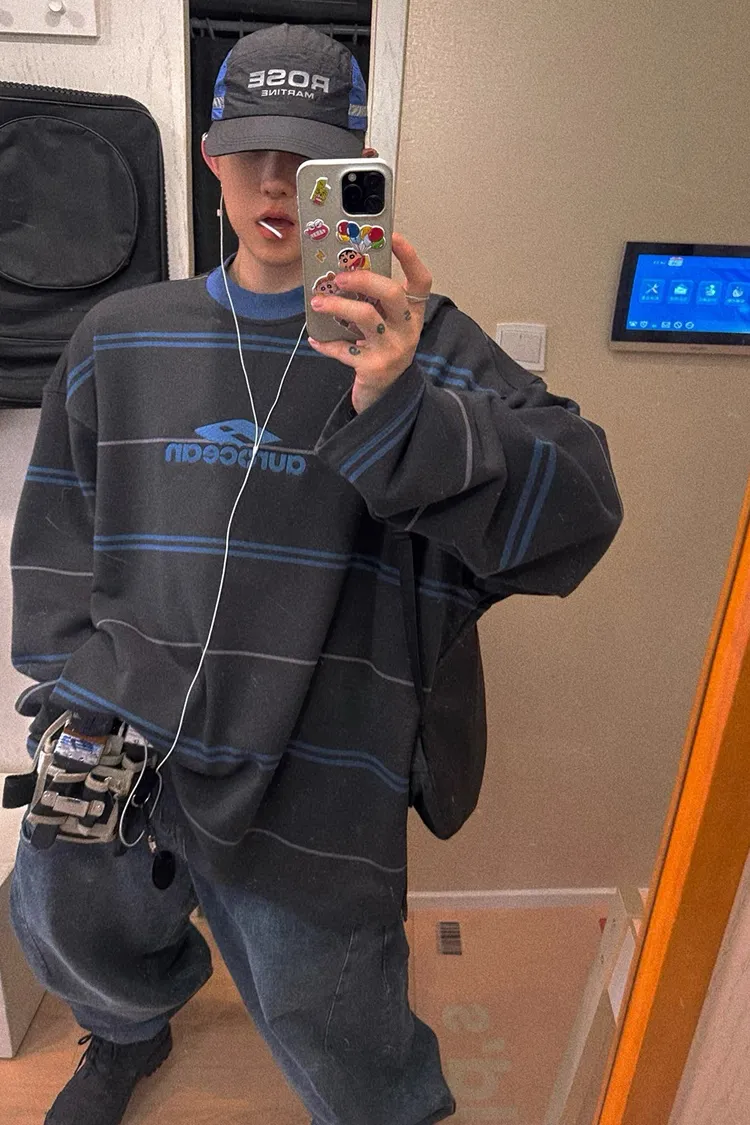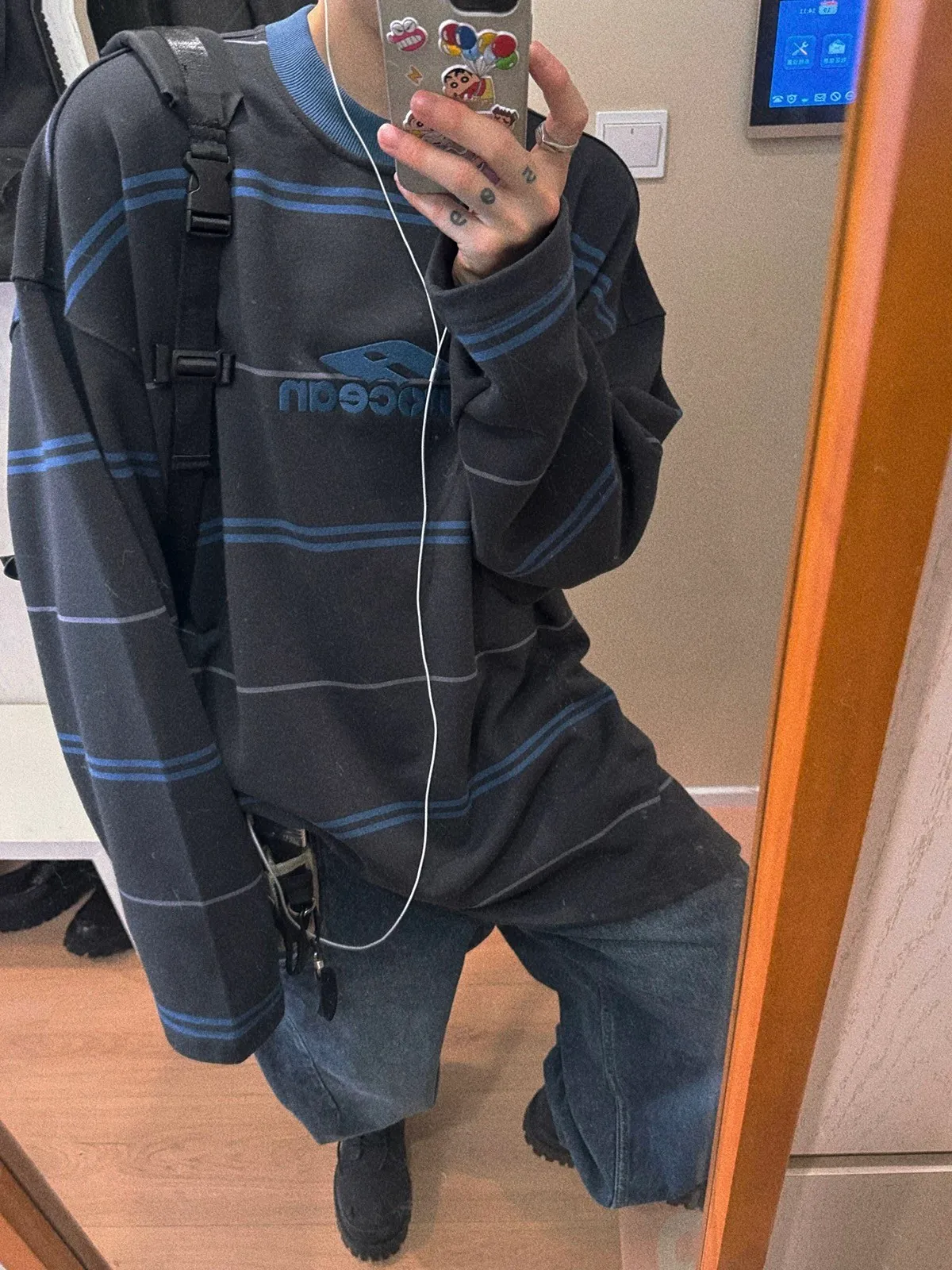AUROCEAN 訂製條紋 420G重磅 OS 長袖(灰藍條紋)