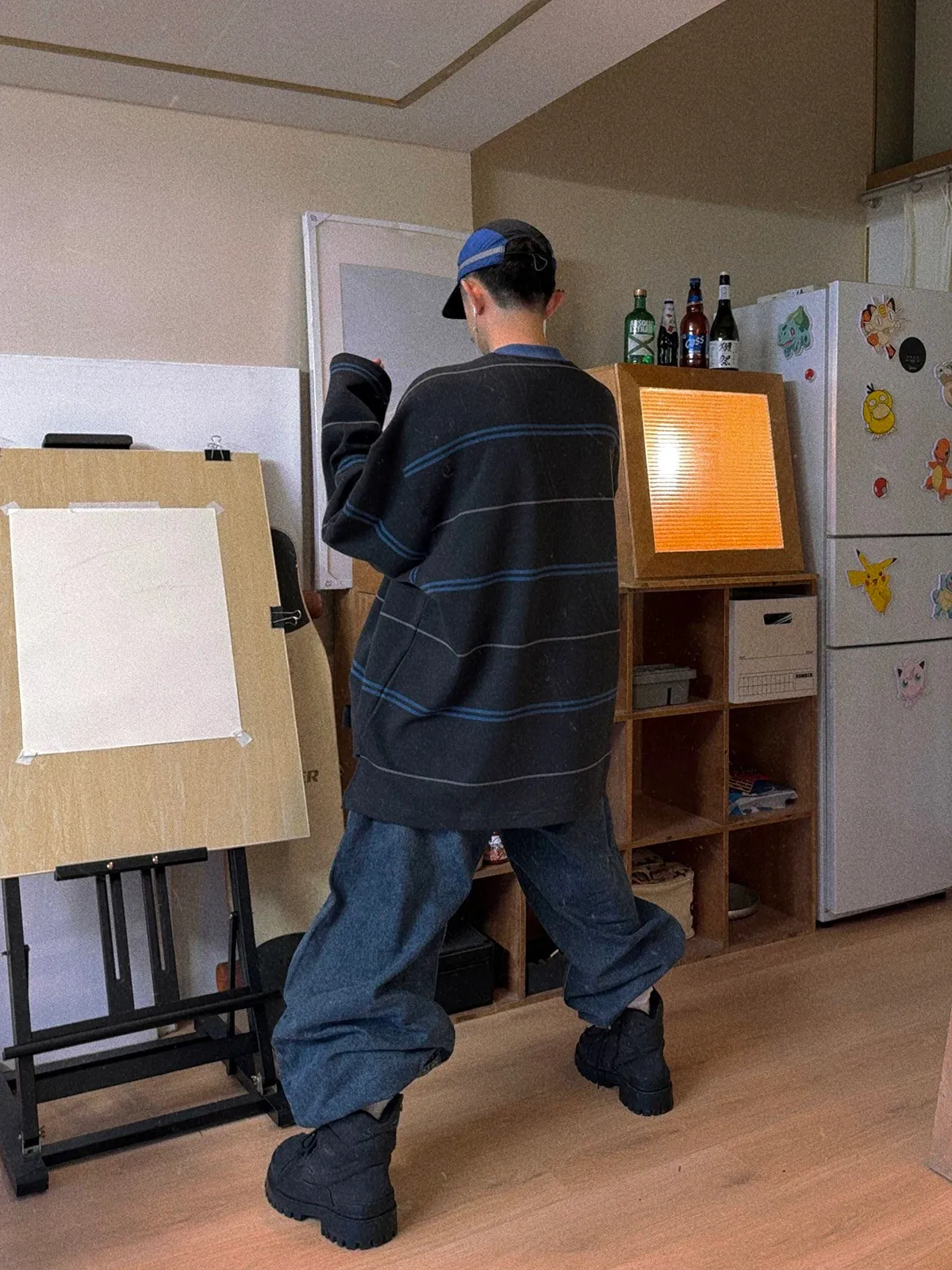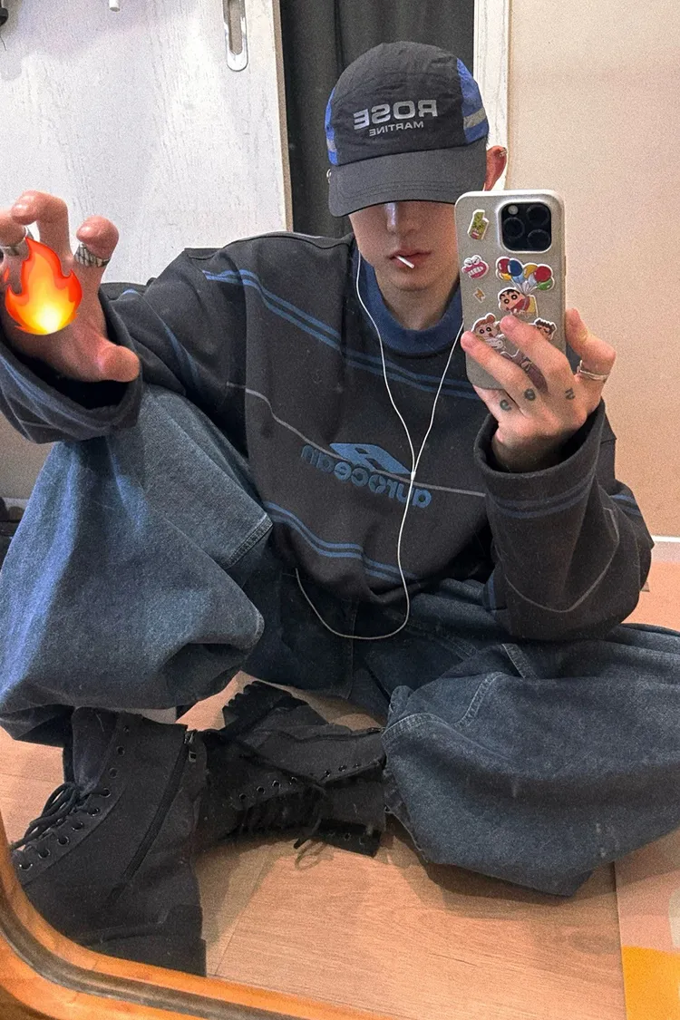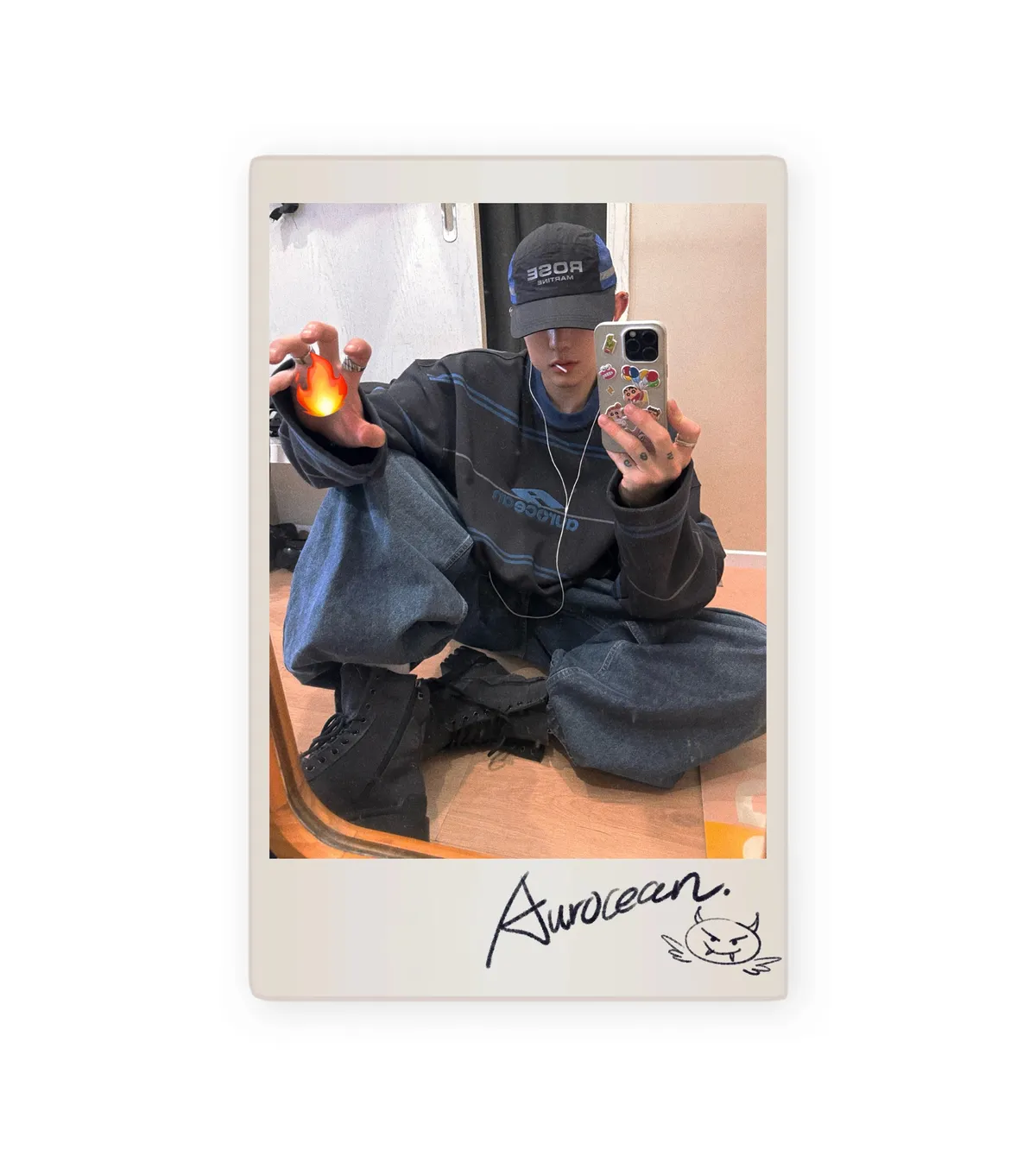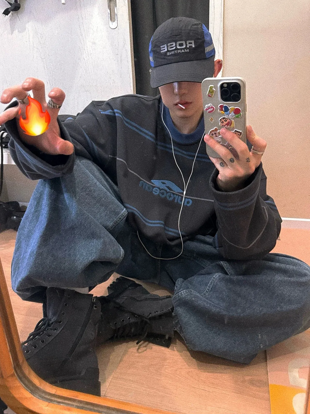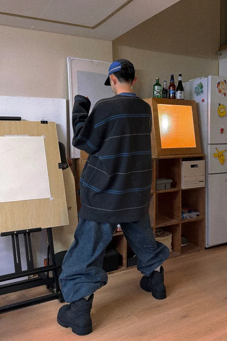 AUROCEAN 訂製條紋 420G重磅 OS 長袖(灰藍條紋)