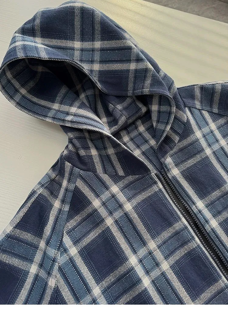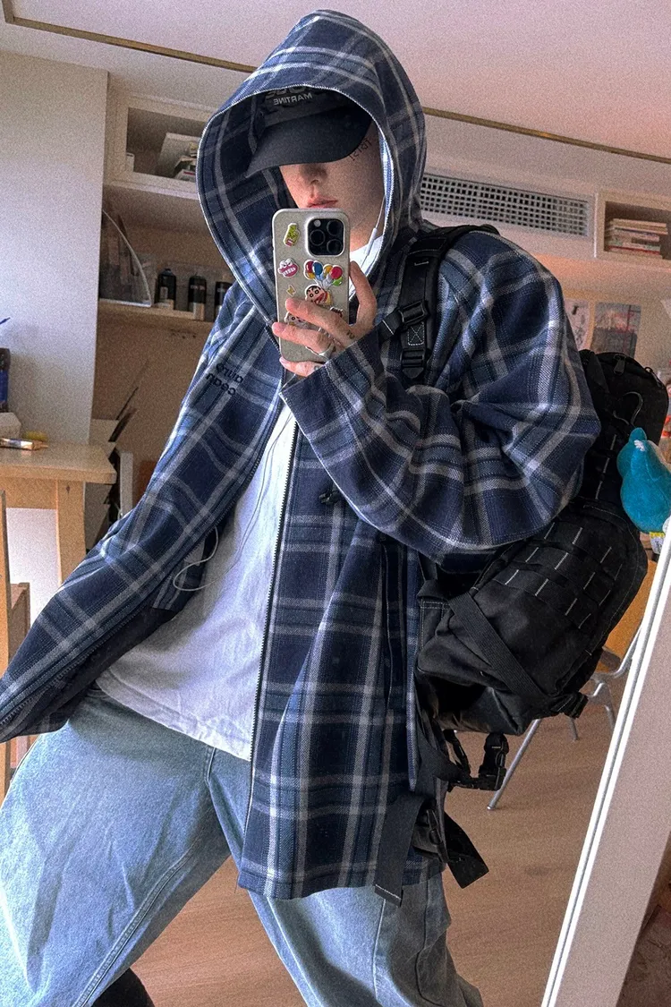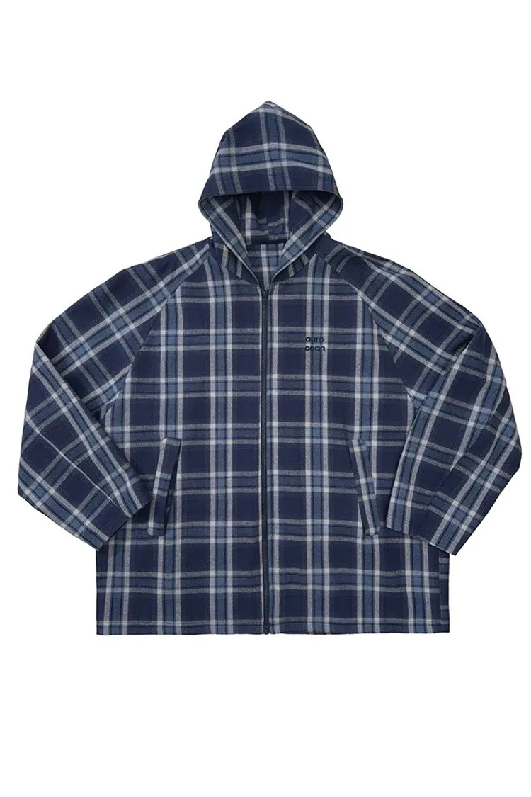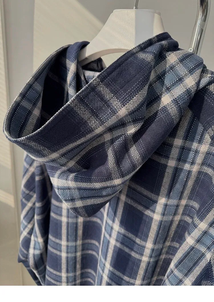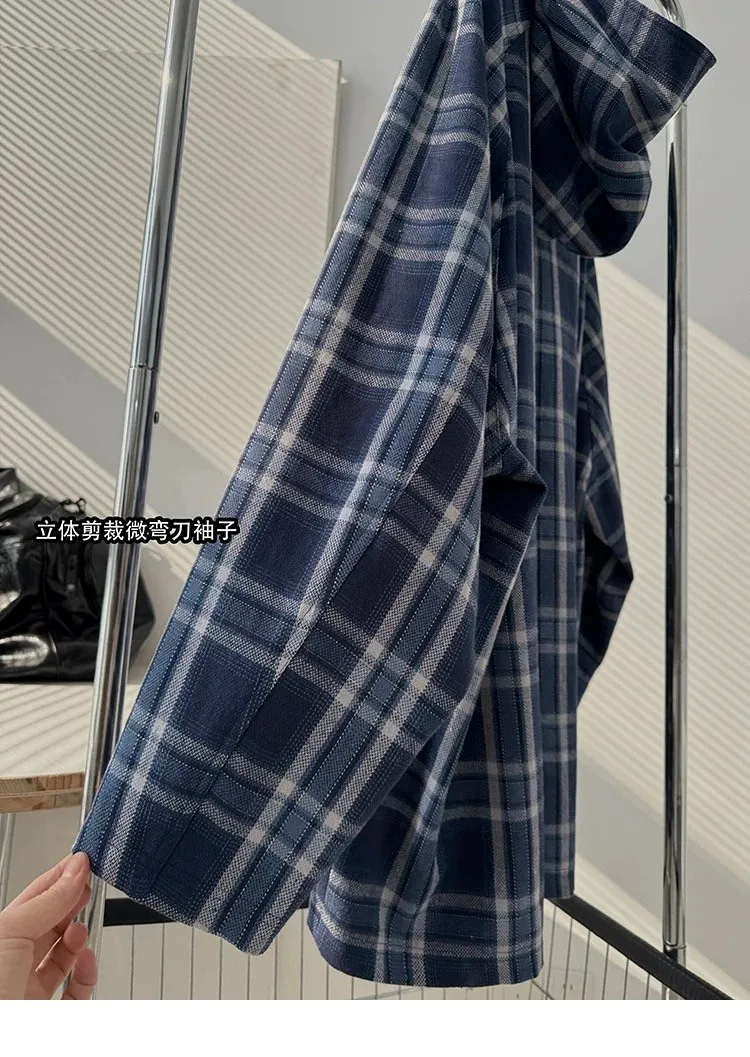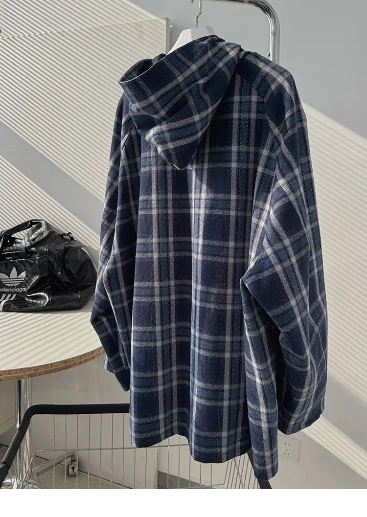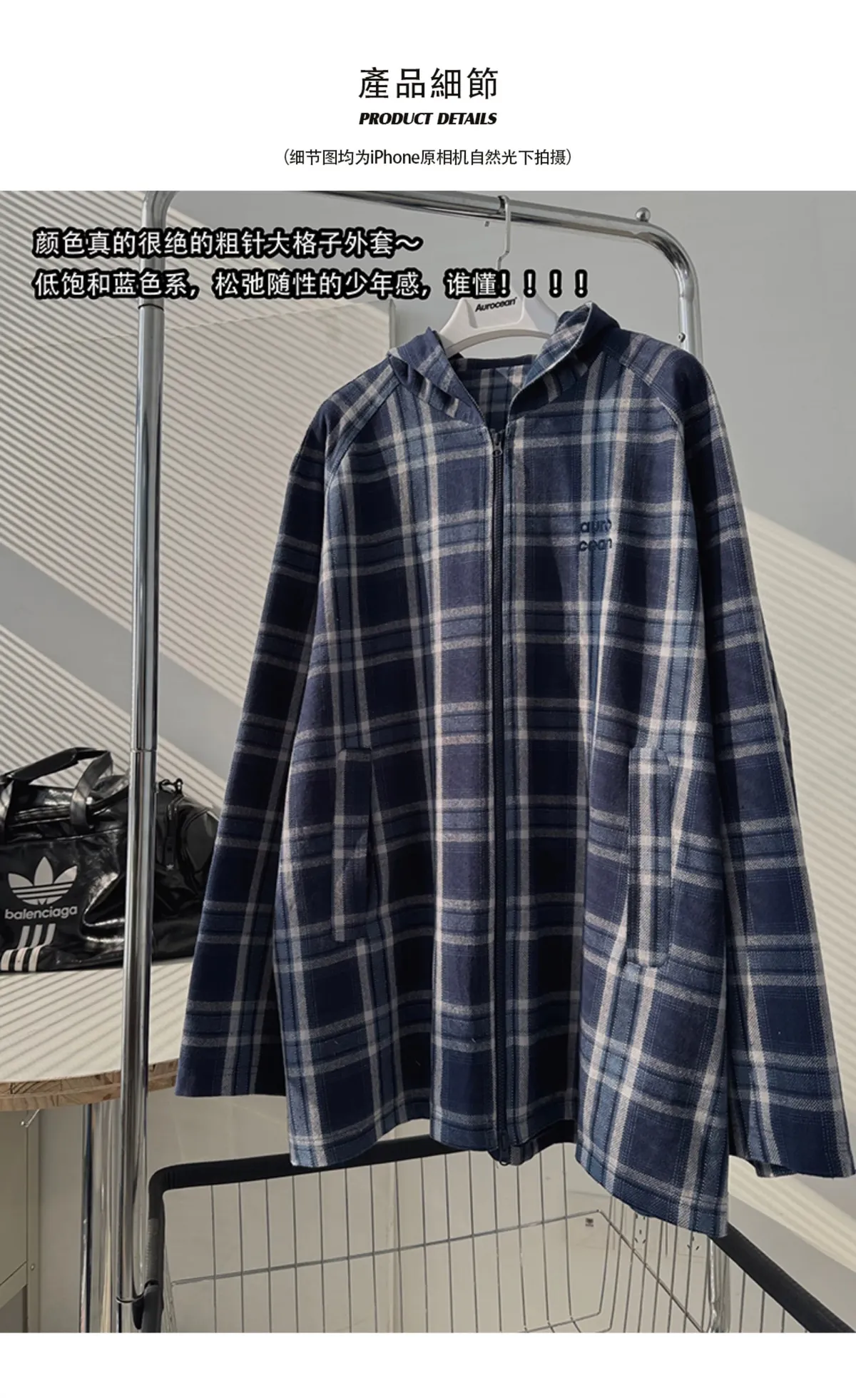 AUROCEAN 廓形OS 格紋連帽 風衣外套(藍色)