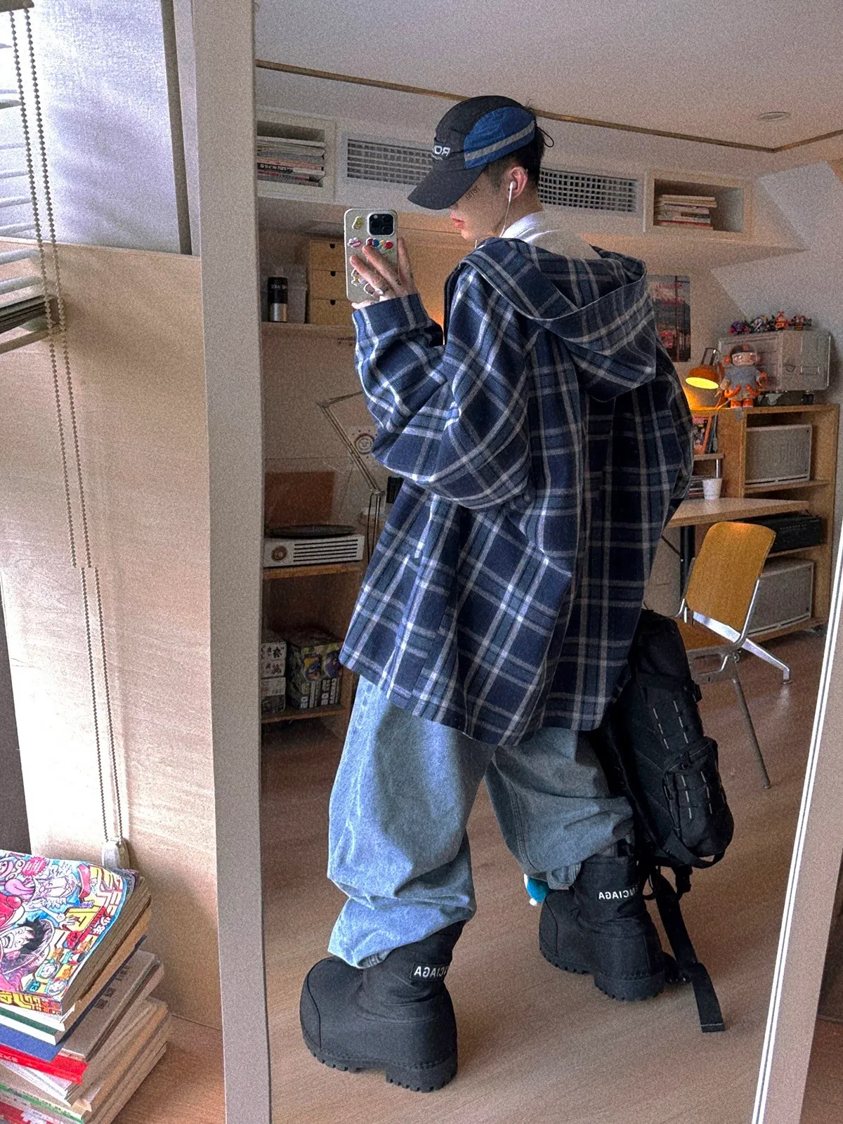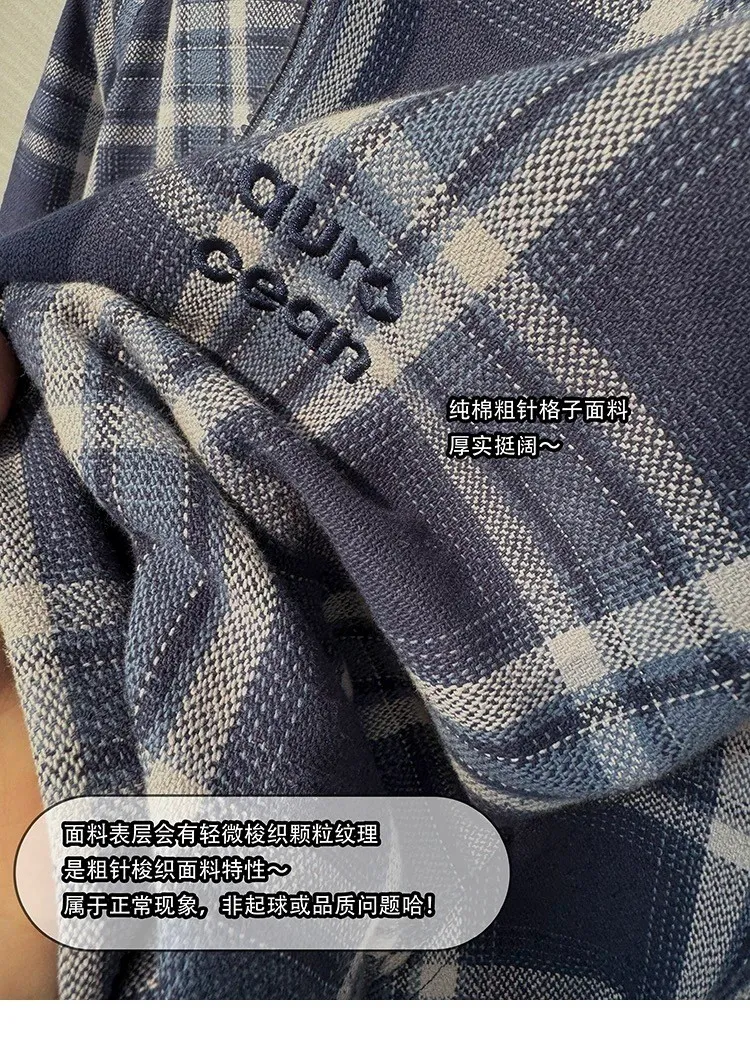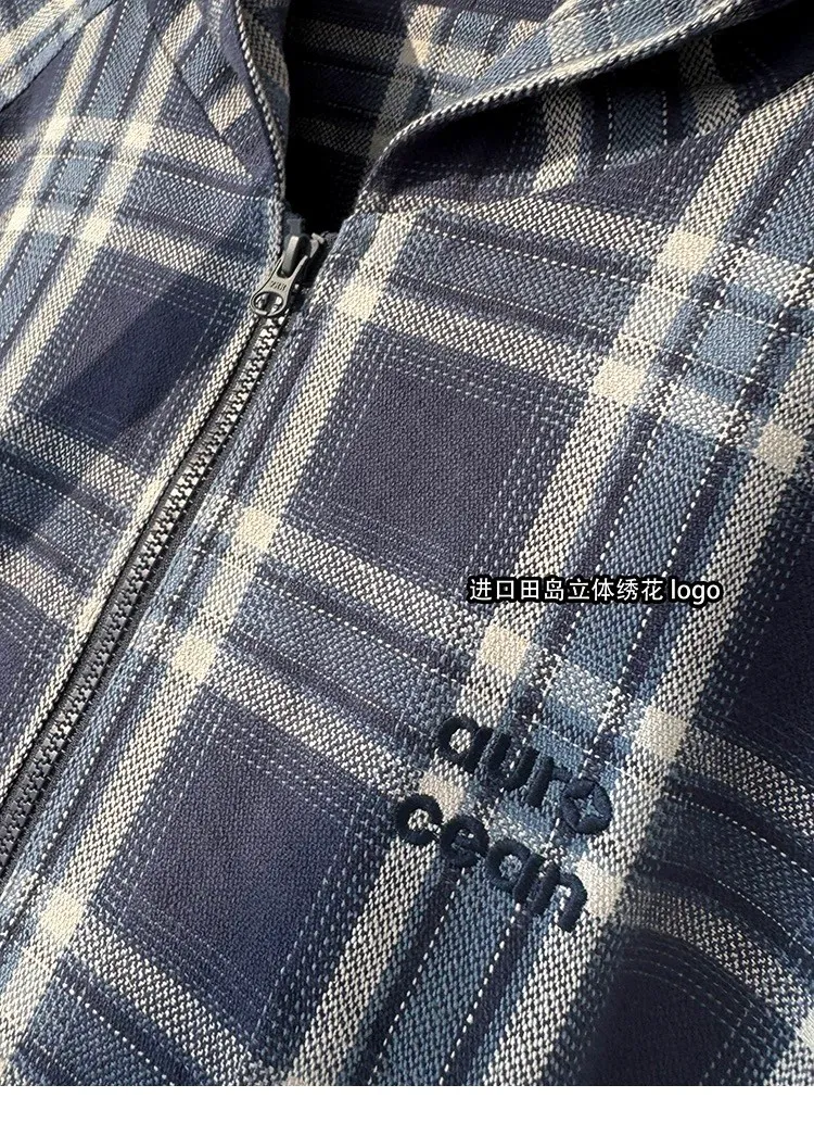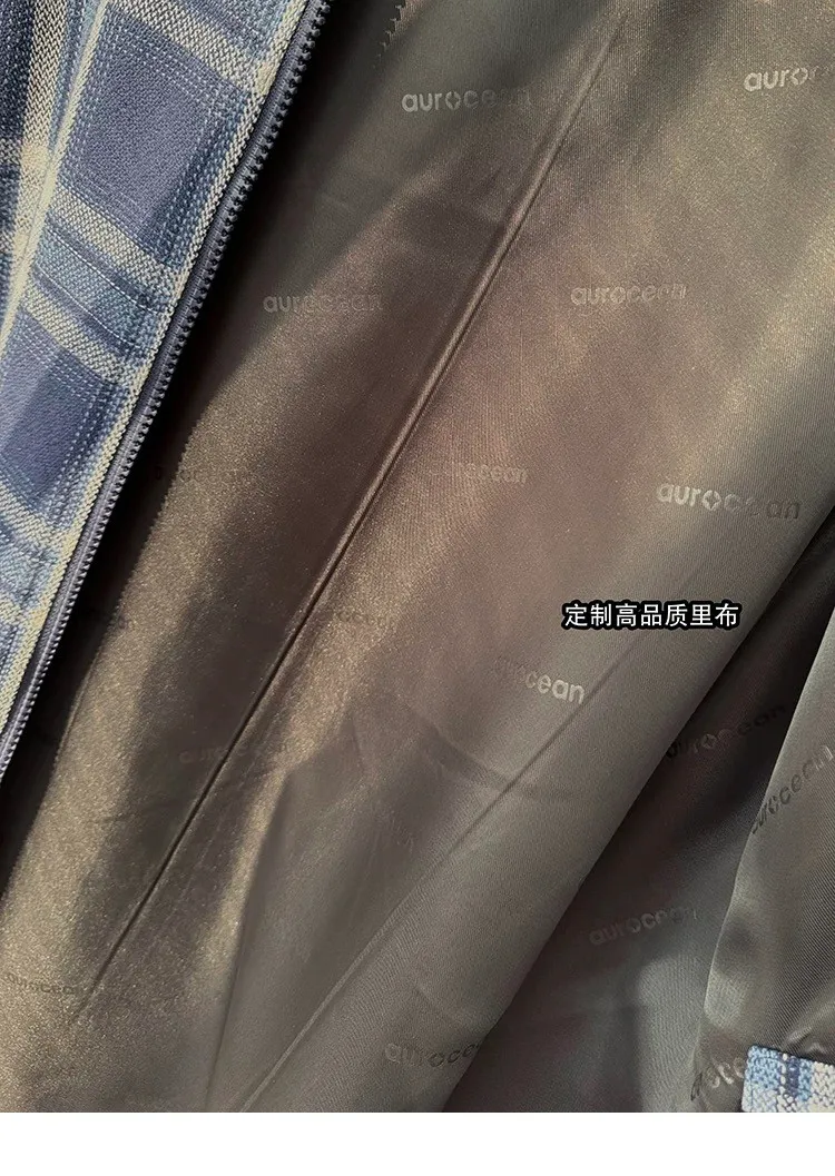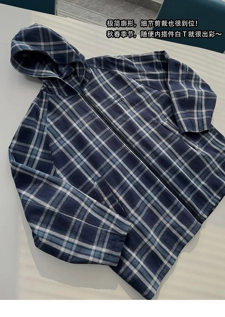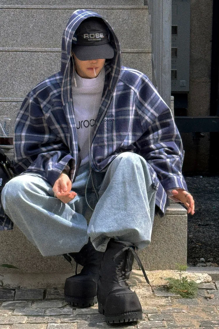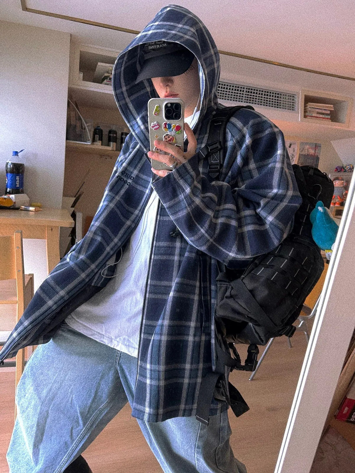 AUROCEAN 廓形OS 格紋連帽 風衣外套(藍色)