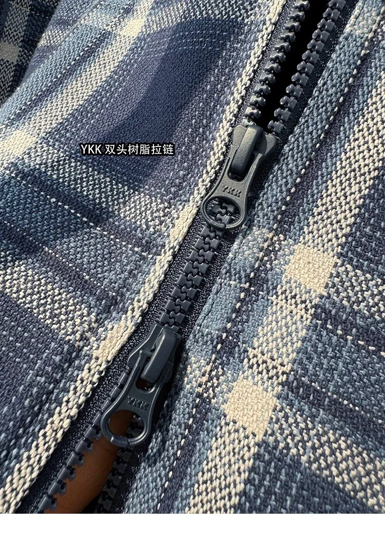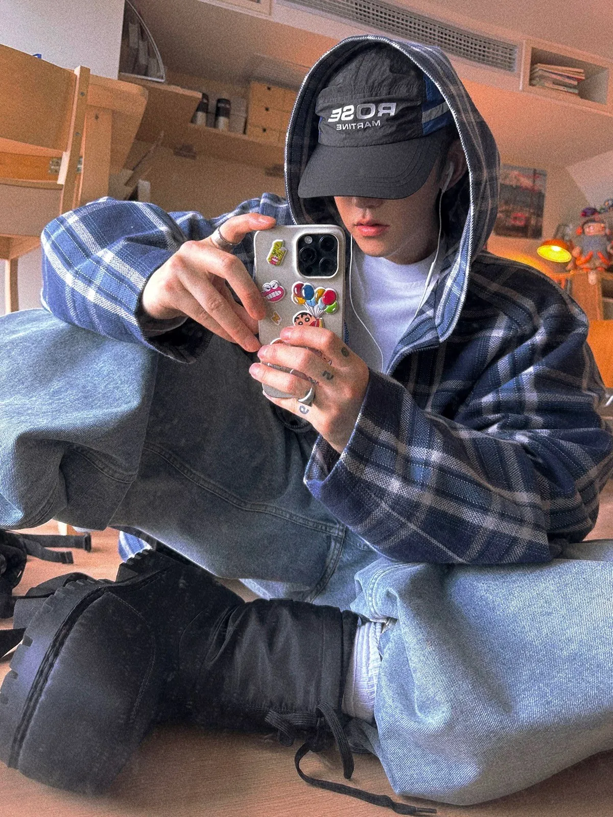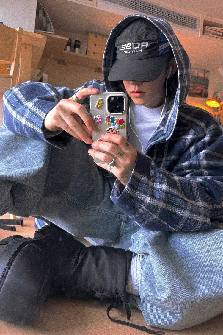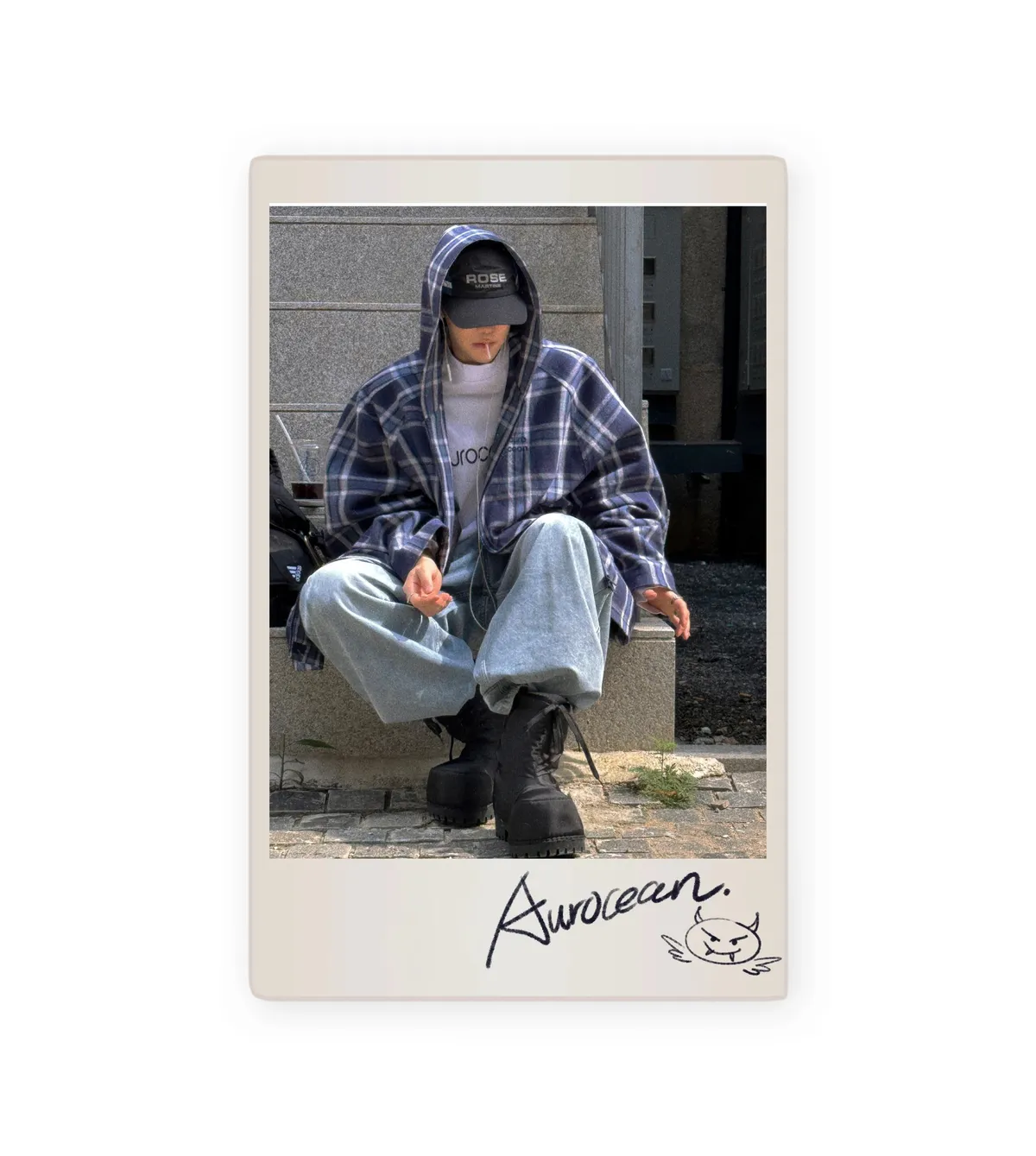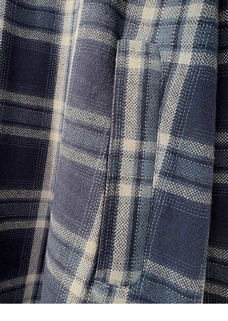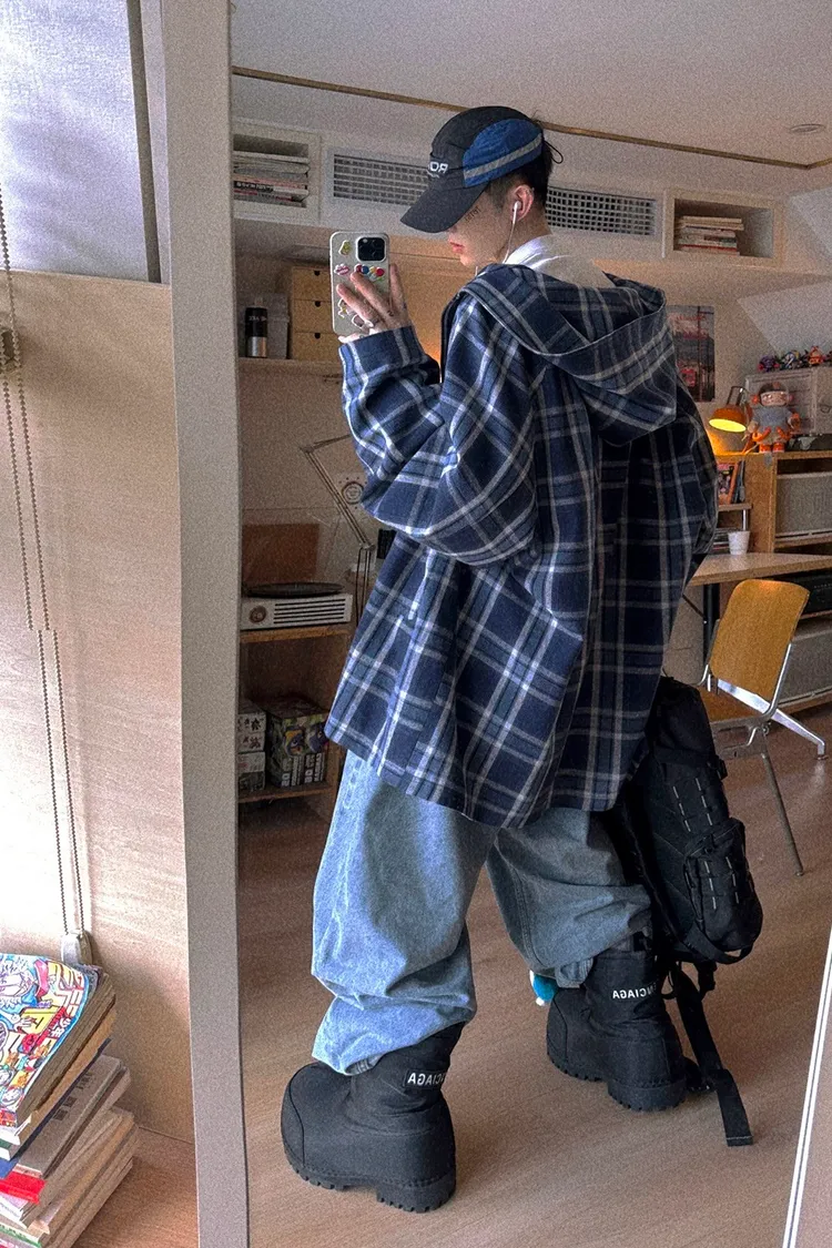 AUROCEAN 廓形OS 格紋連帽 風衣外套(藍色)