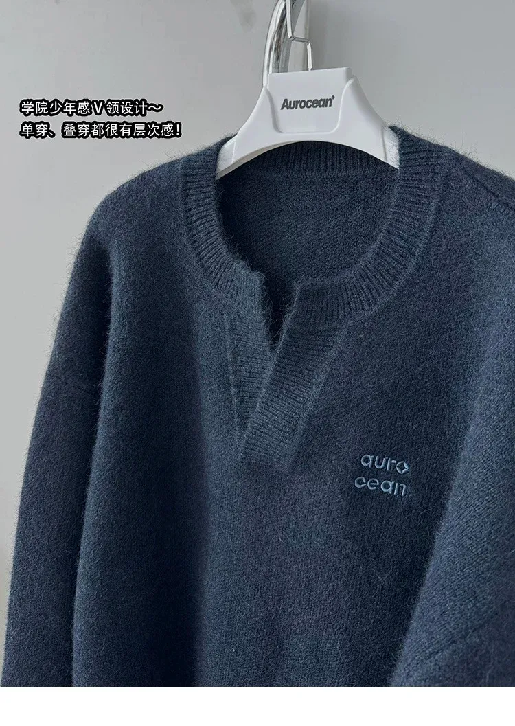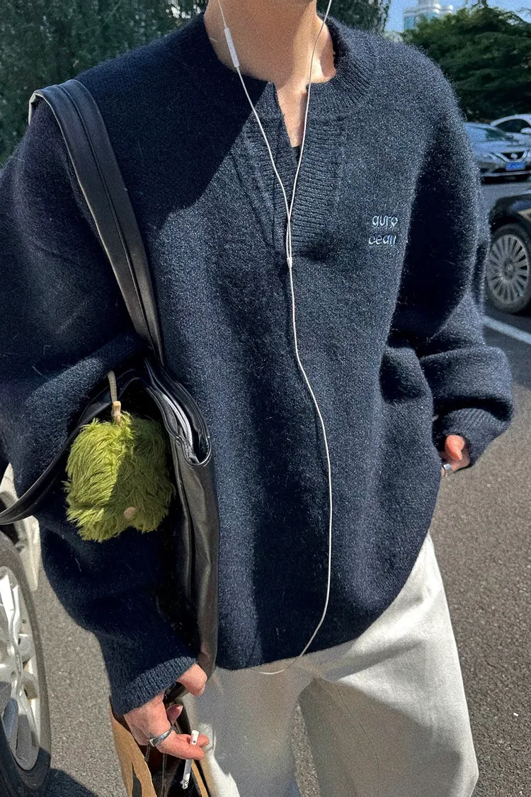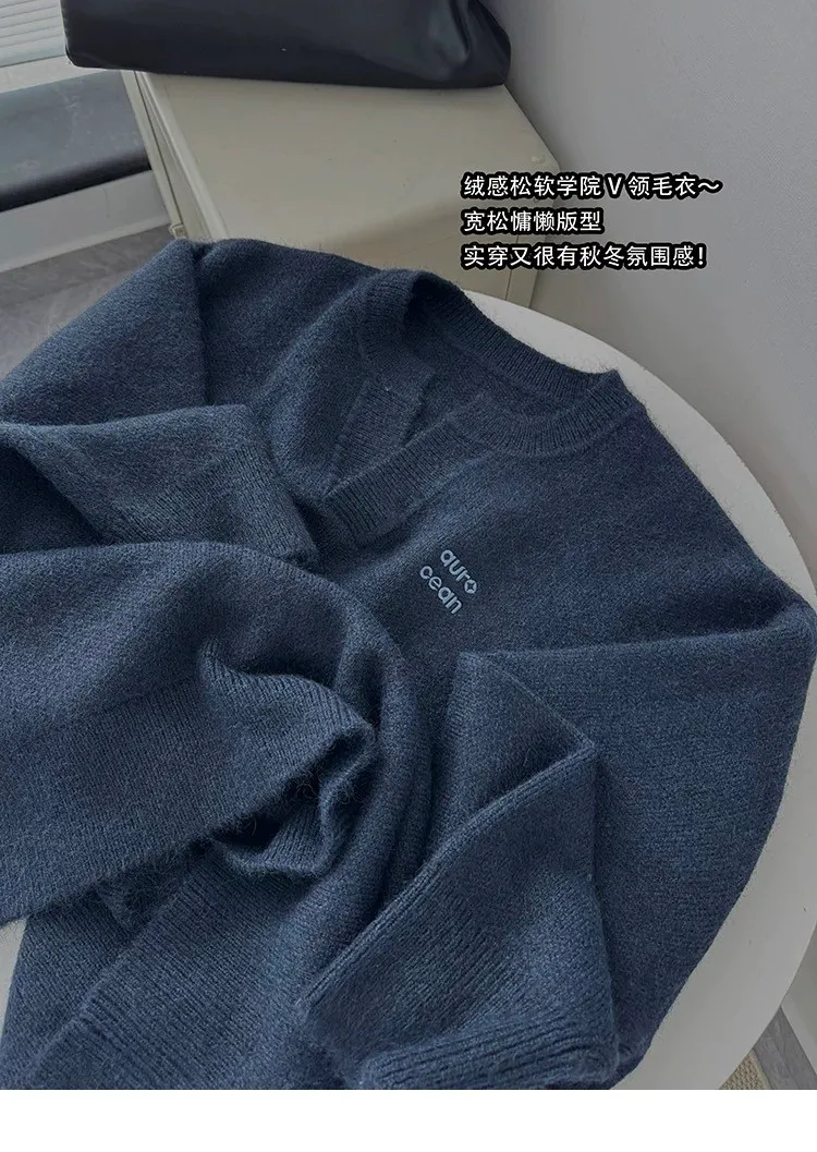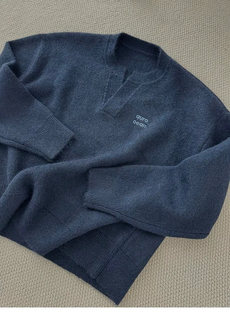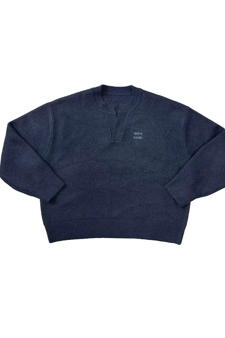 AUROCEAN 絨感學院 V領 撞色刺繡 毛衣(藏青)