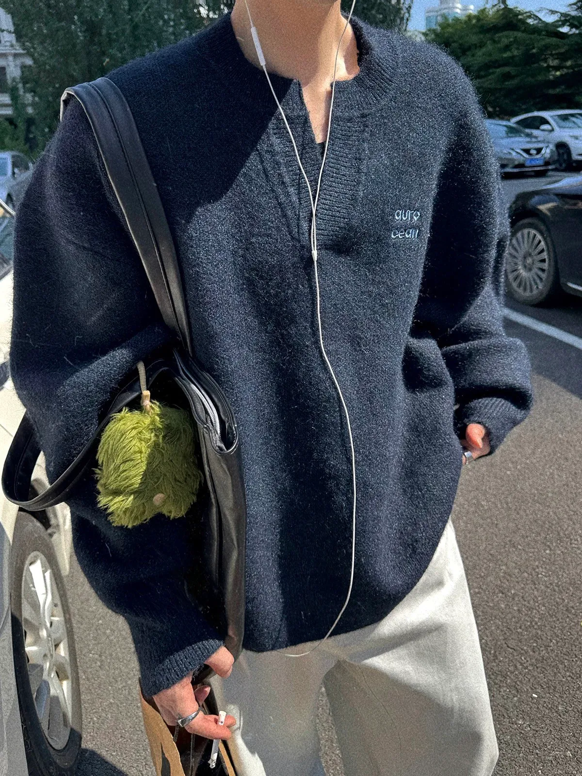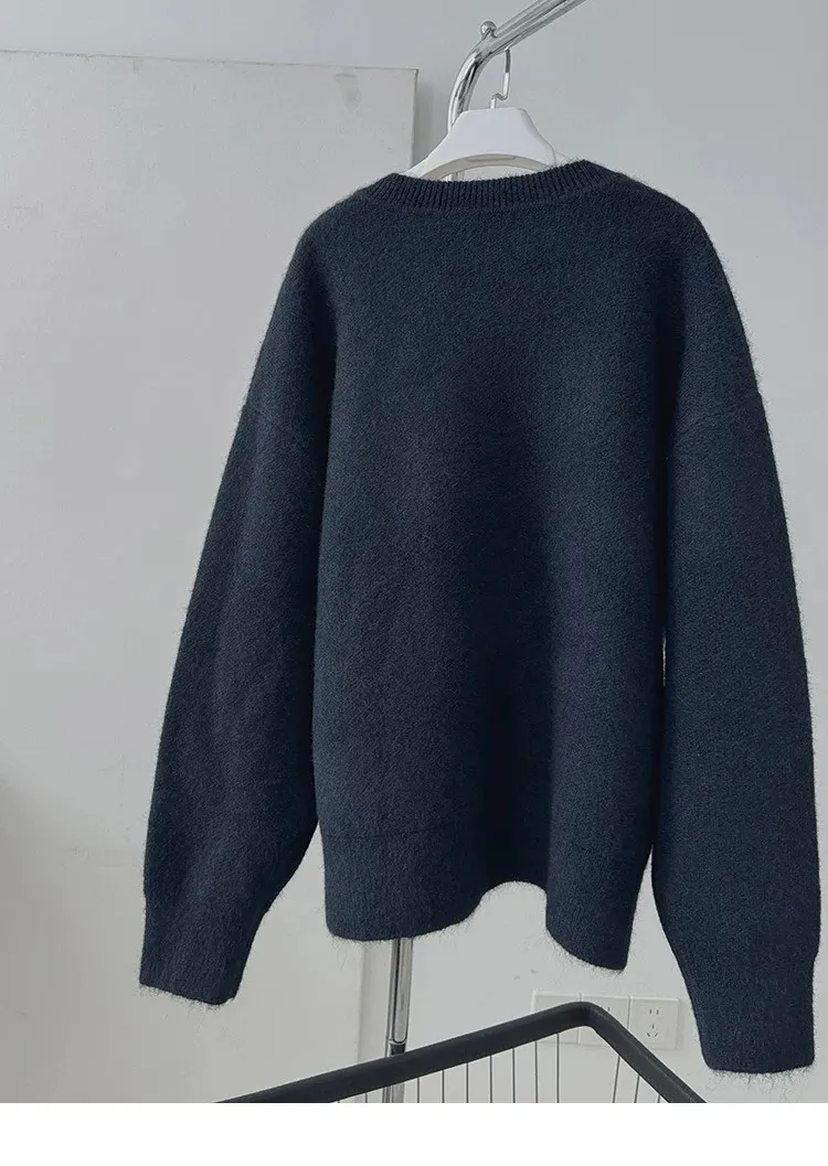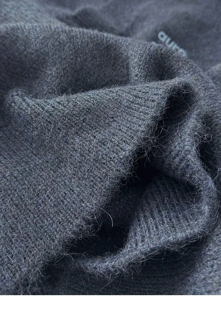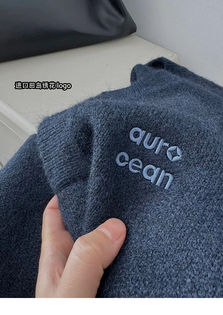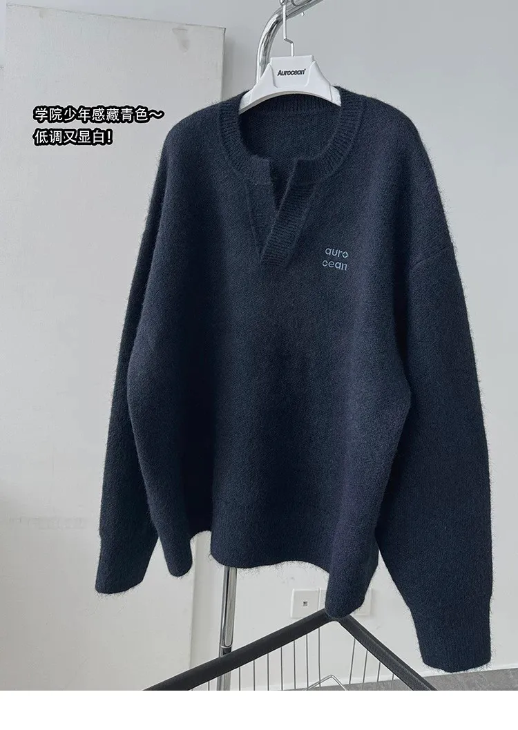 AUROCEAN 絨感學院 V領 撞色刺繡 毛衣(藏青)