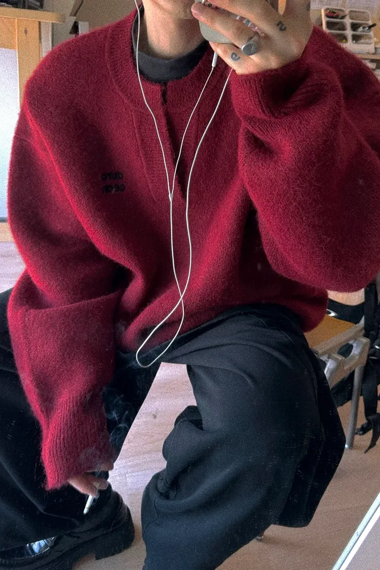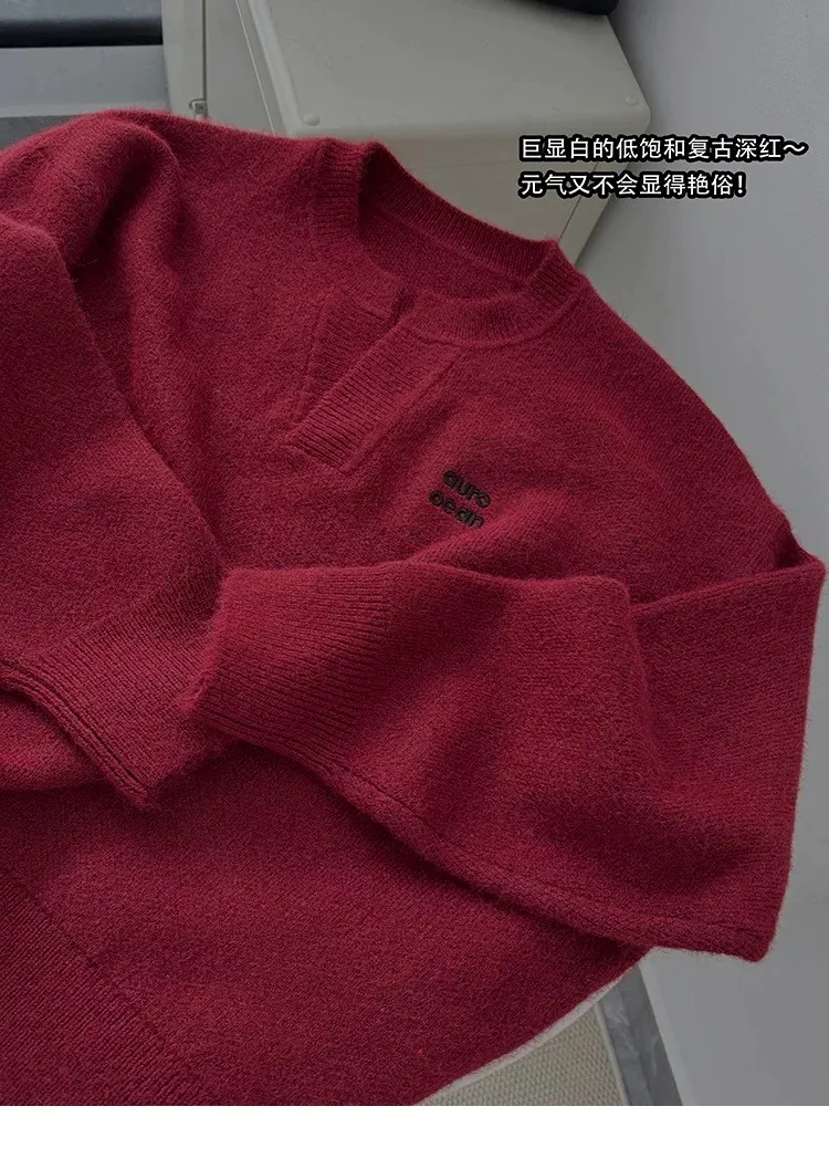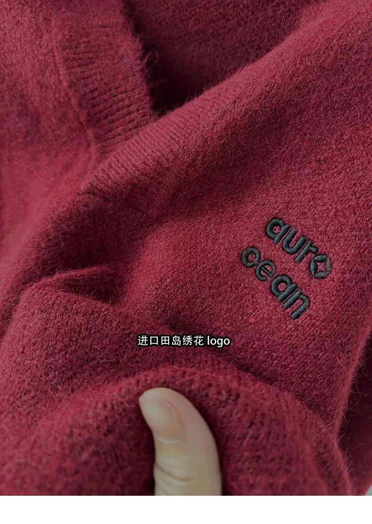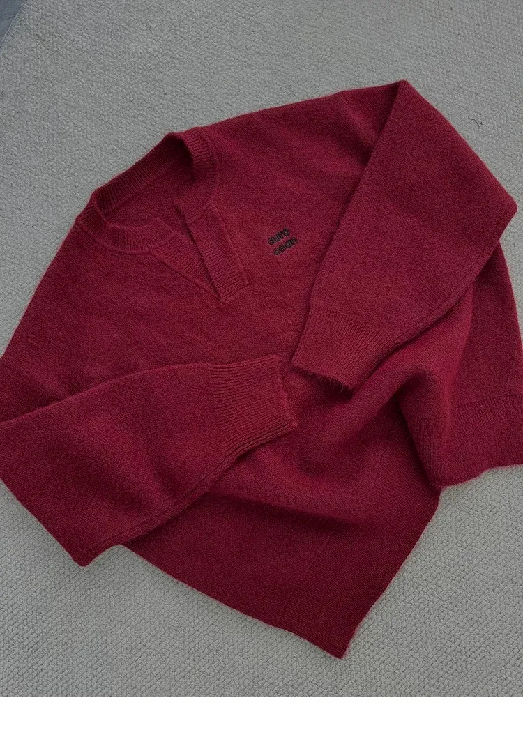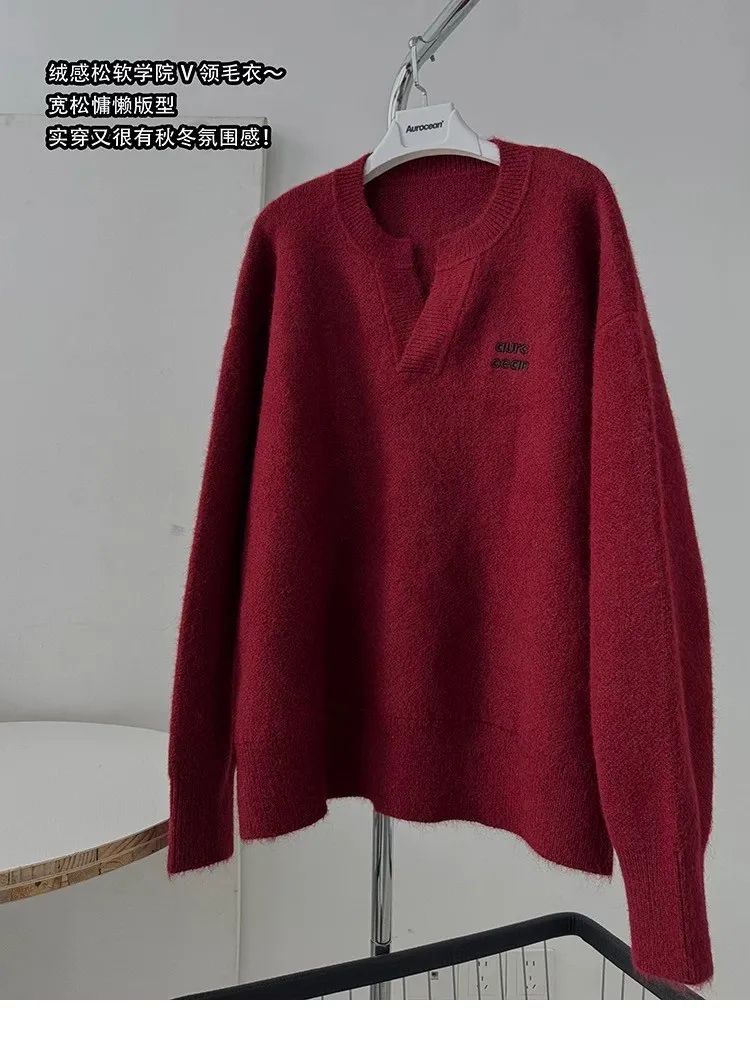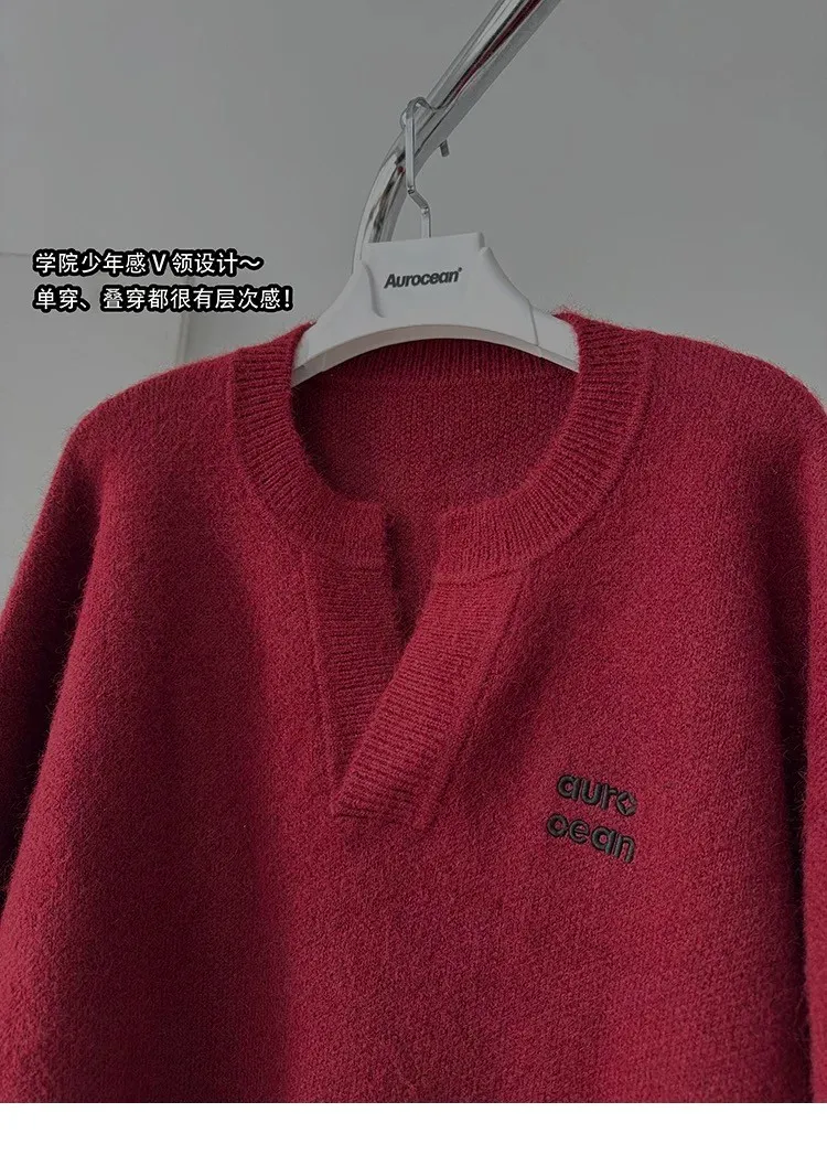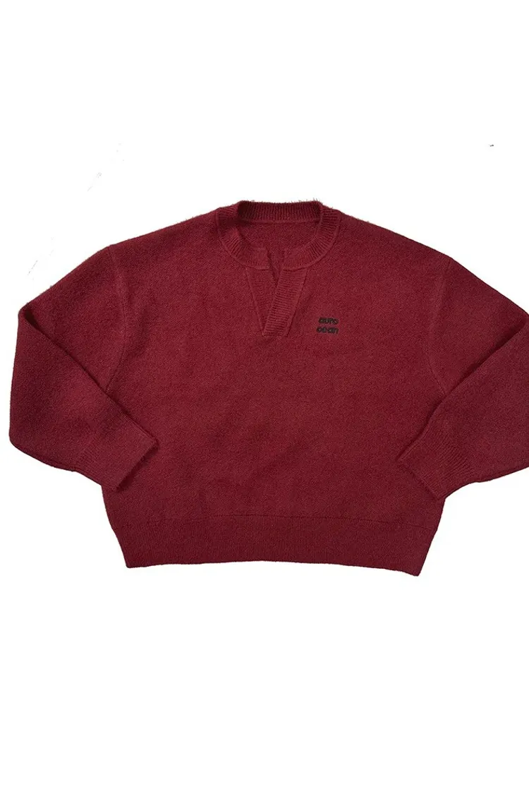 AUROCEAN 絨感學院 V領 撞色刺繡 毛衣(深紅)