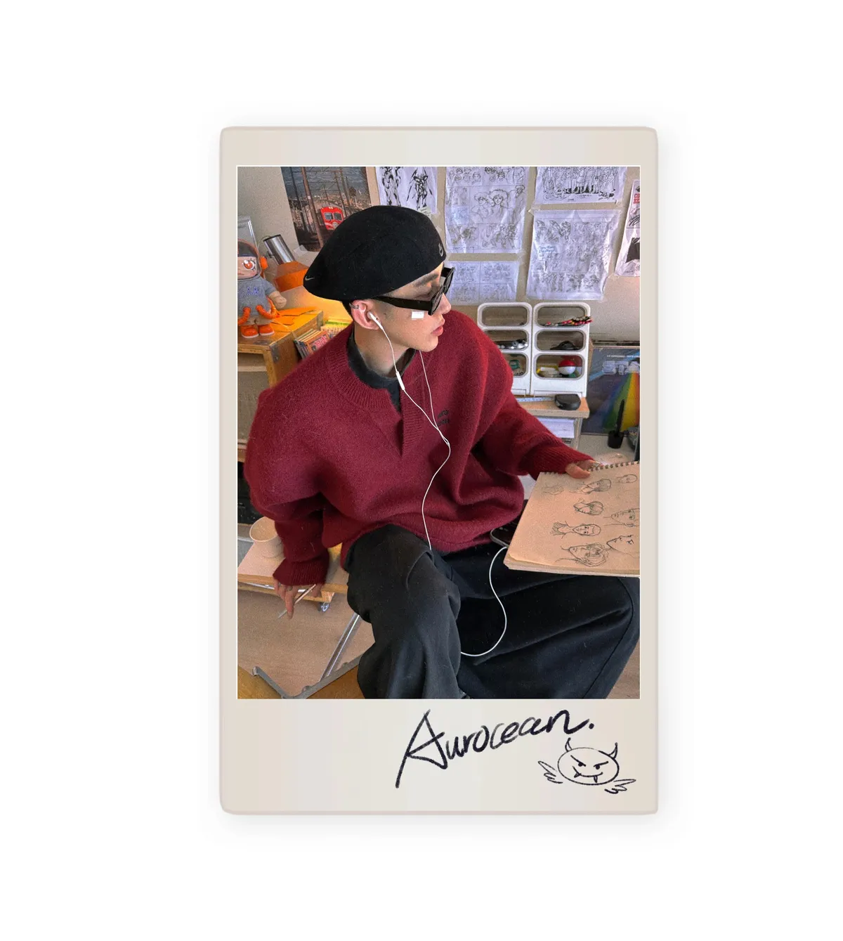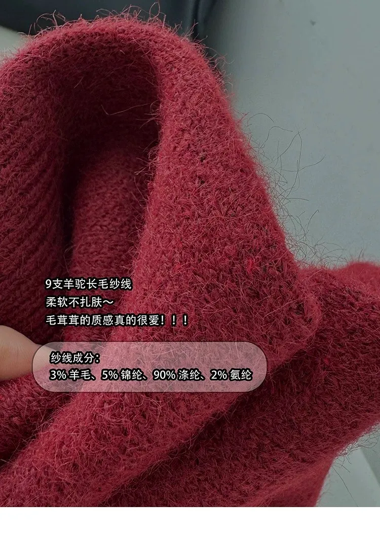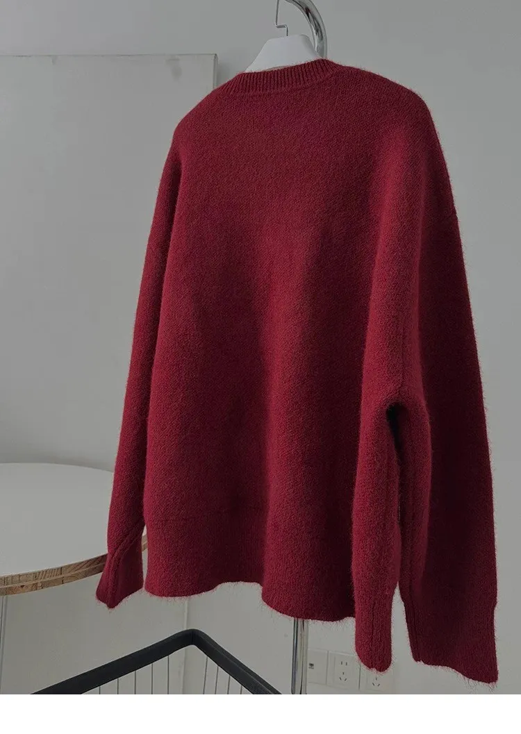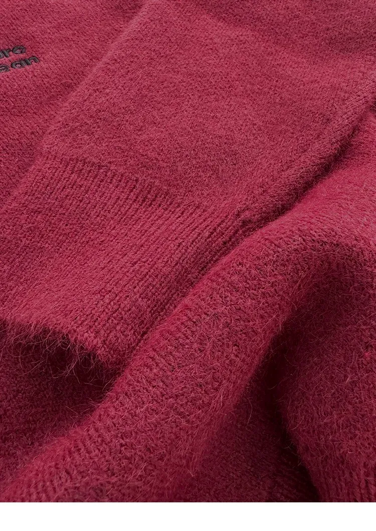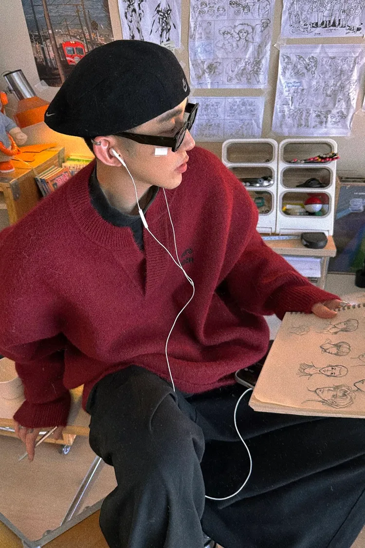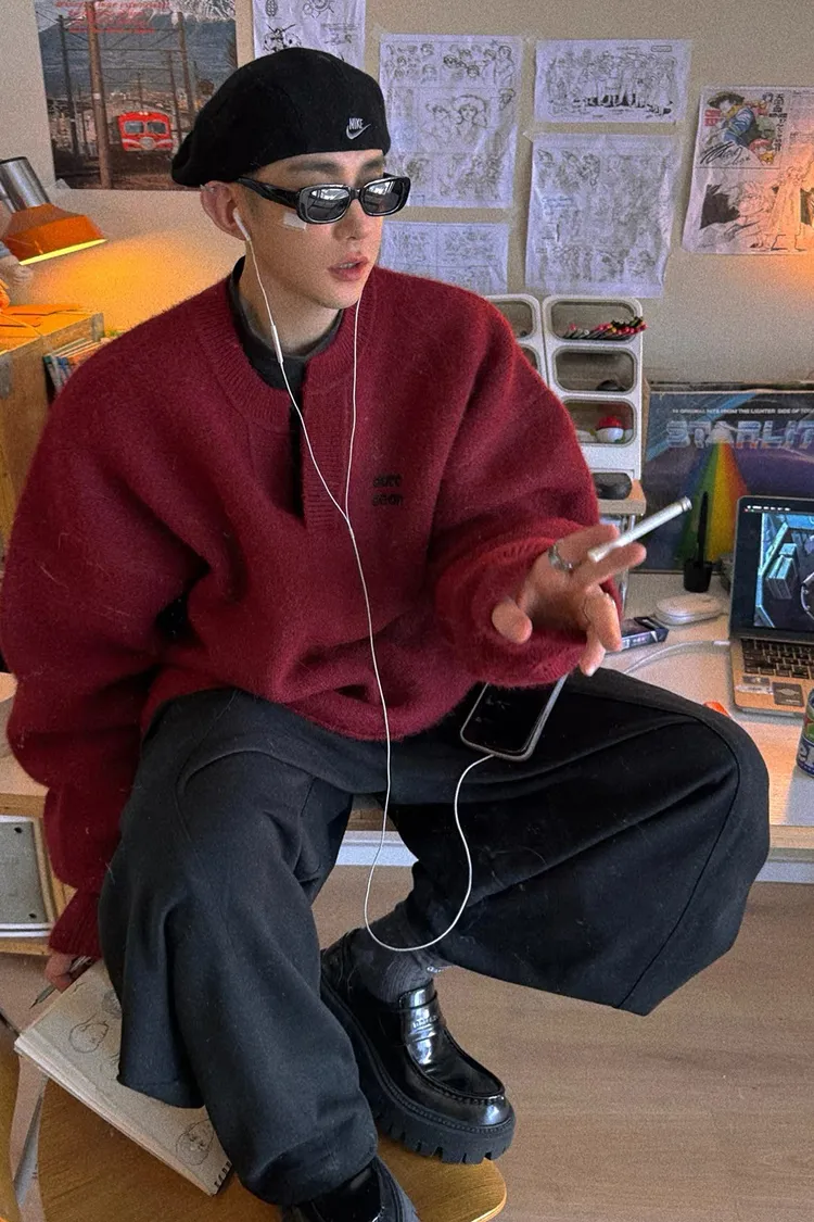 AUROCEAN 絨感學院 V領 撞色刺繡 毛衣(深紅)