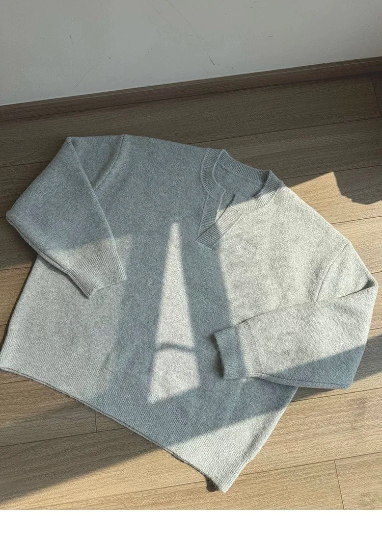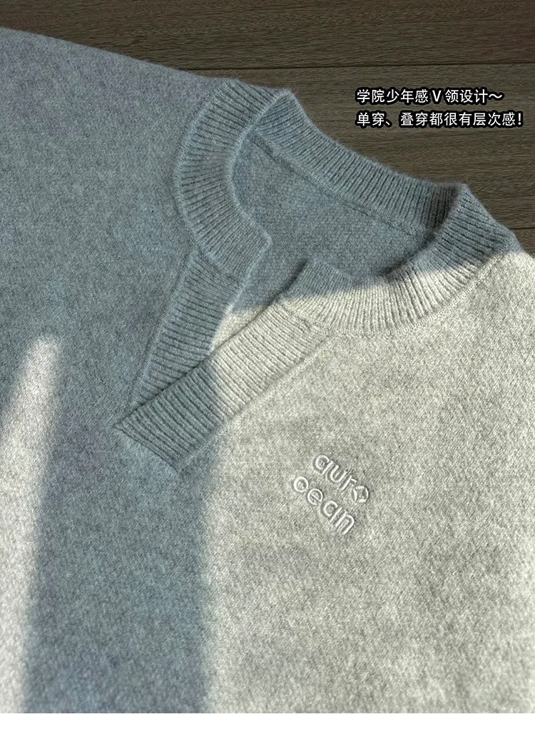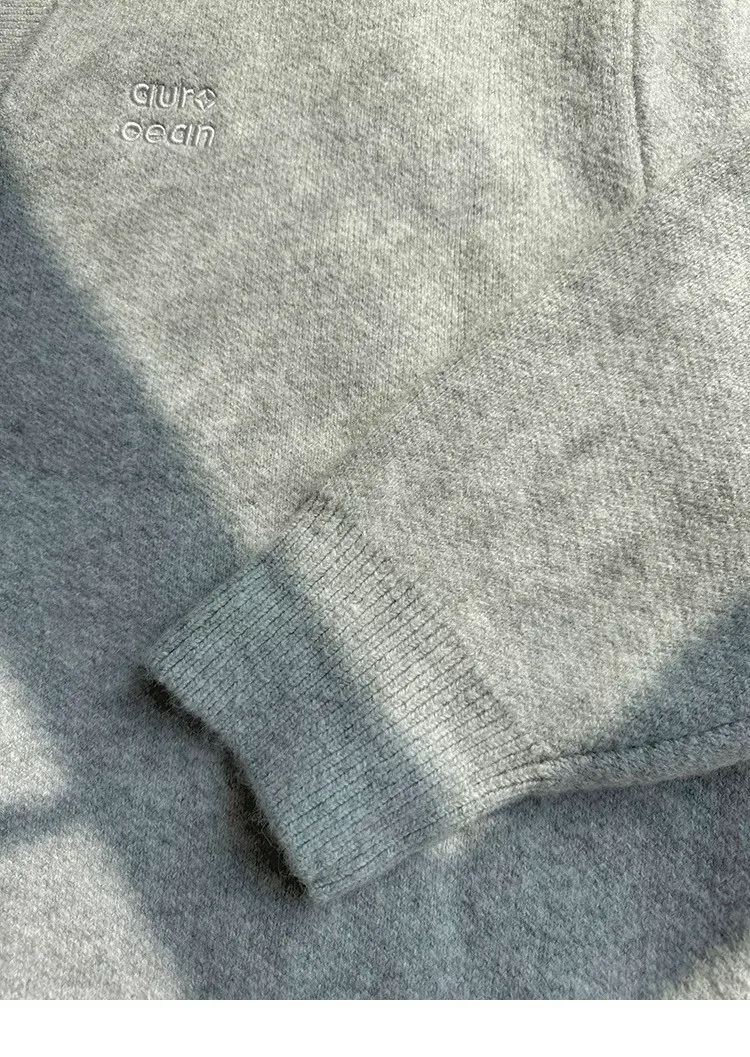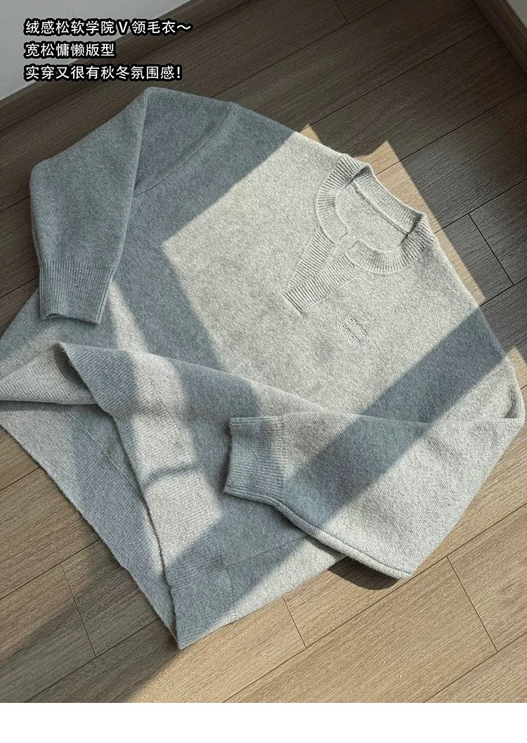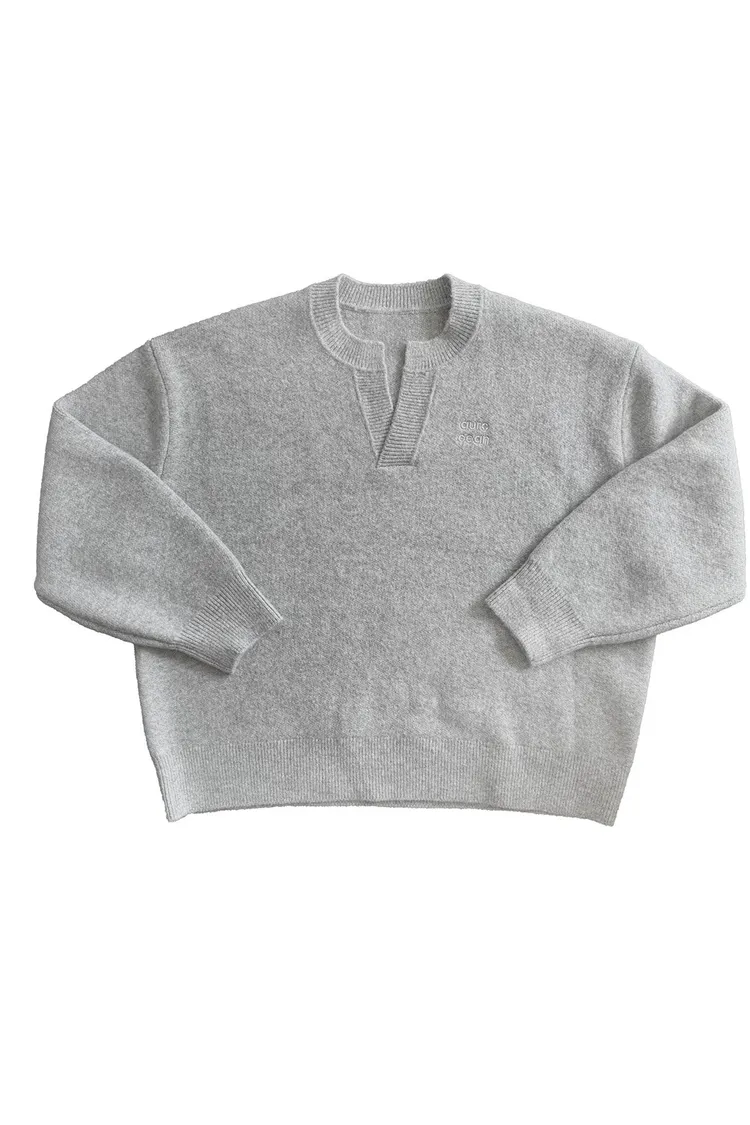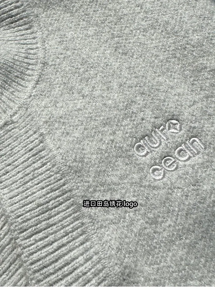 AUROCEAN 絨感學院 V領 撞色刺繡 毛衣(花灰)