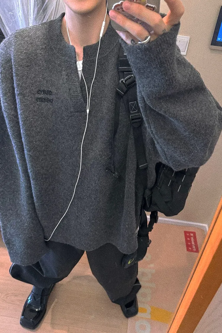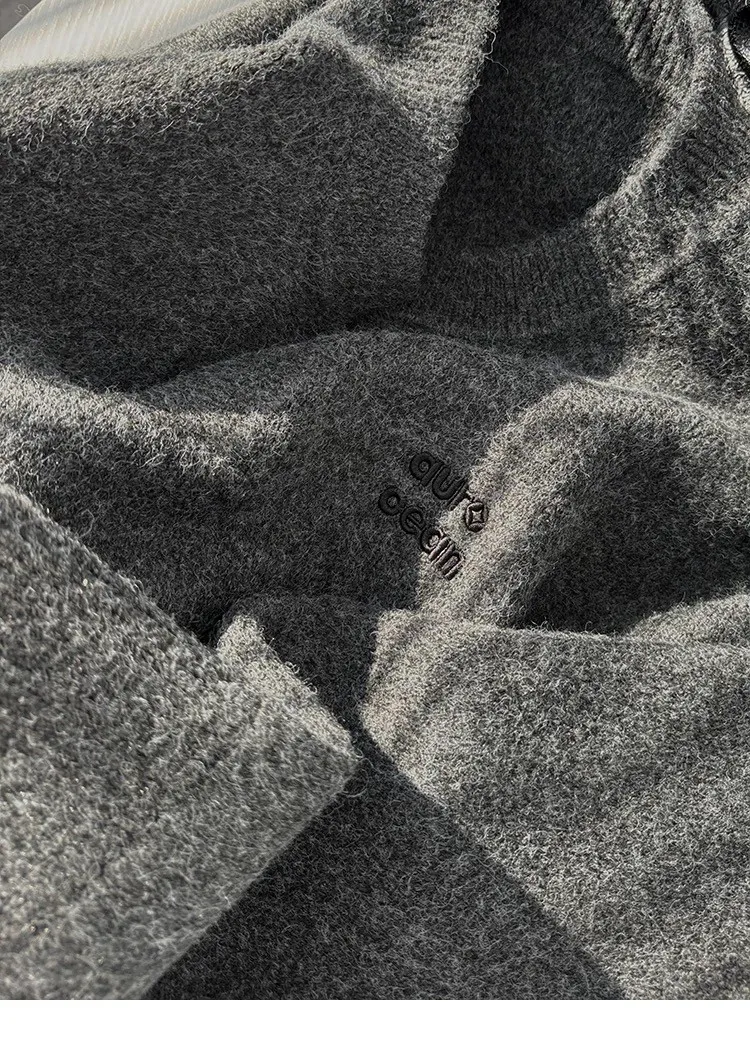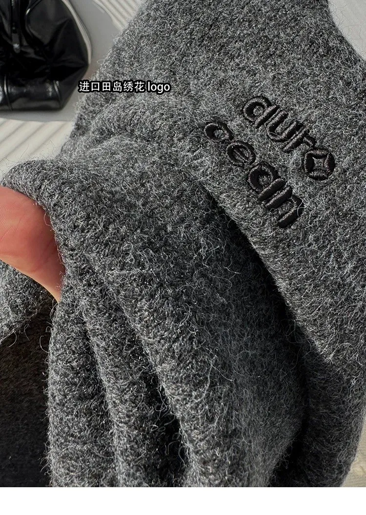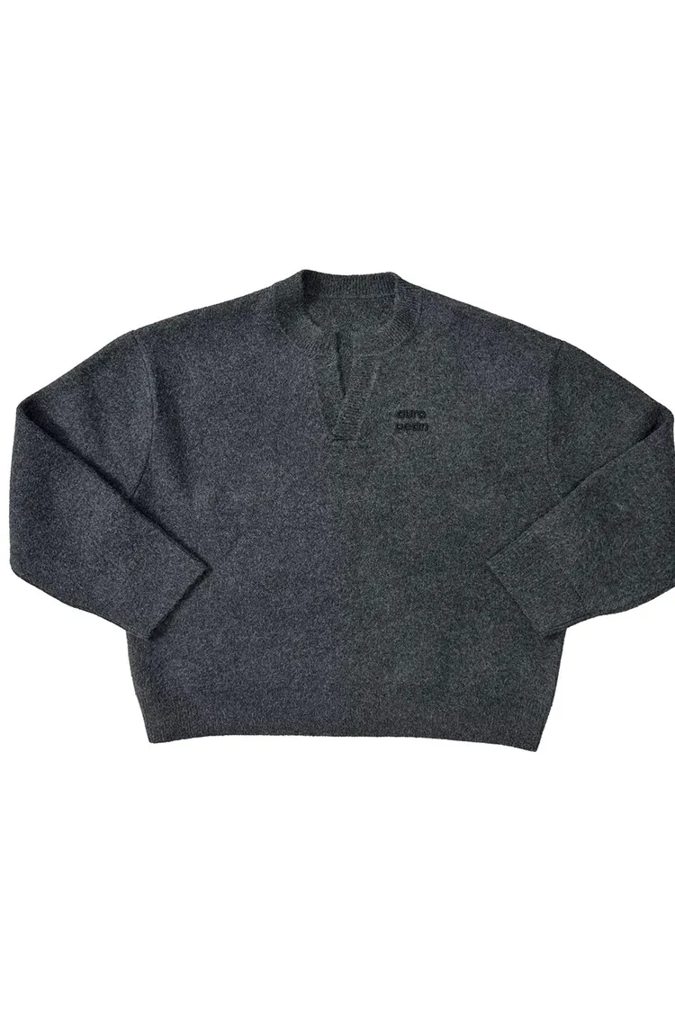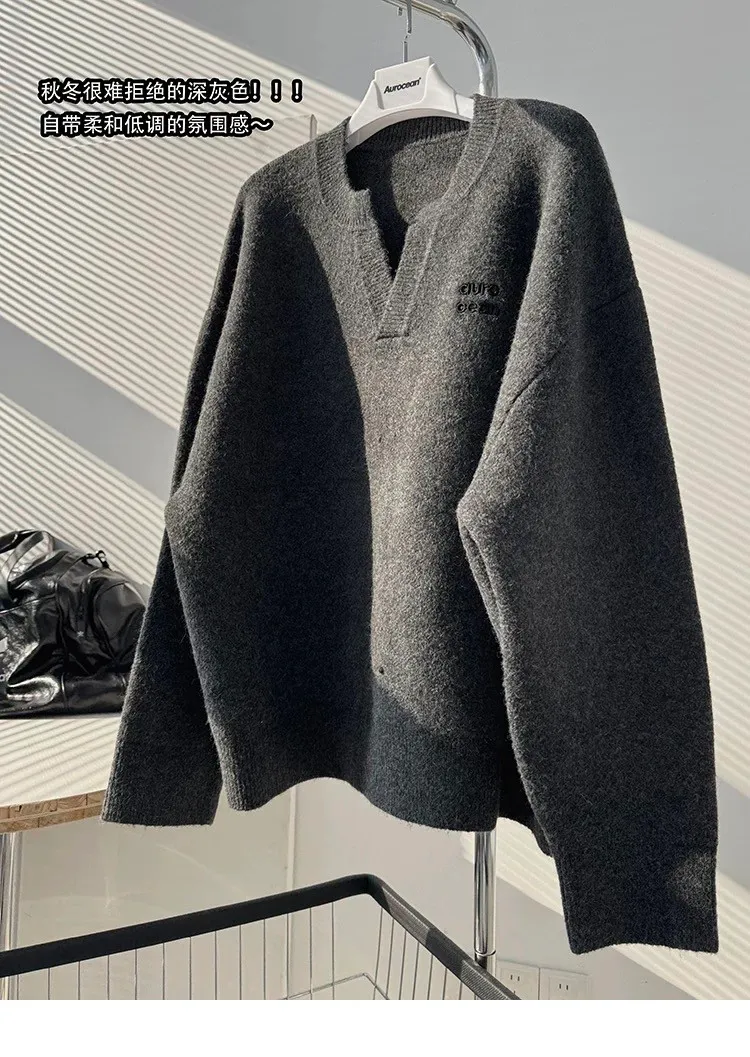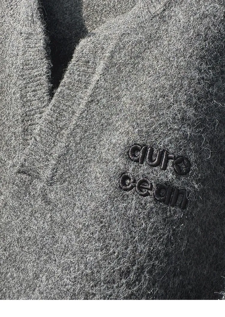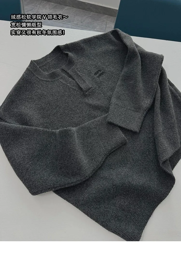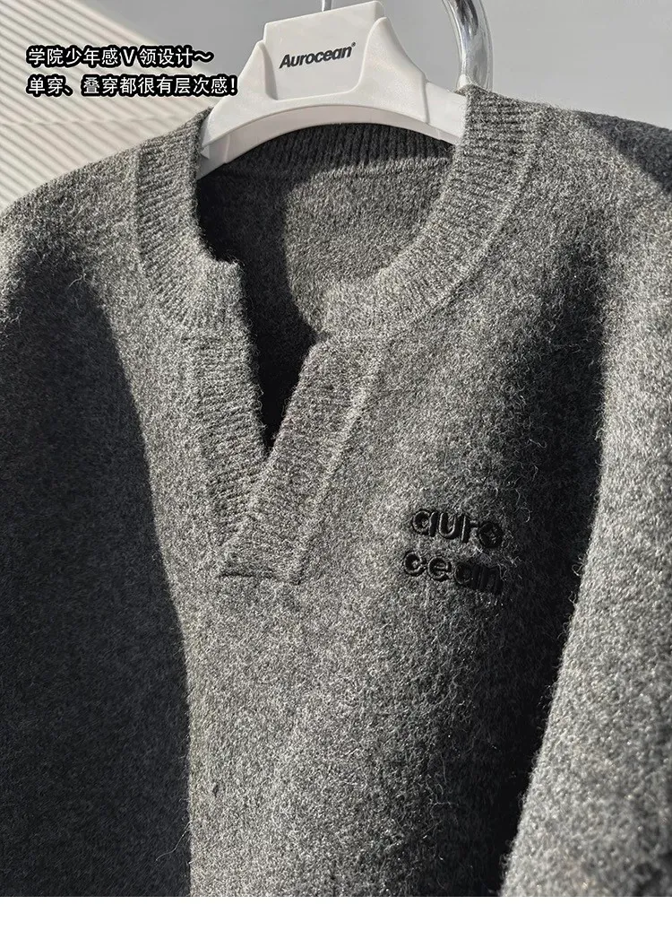 AUROCEAN 絨感學院 V領 撞色刺繡 毛衣(深灰)