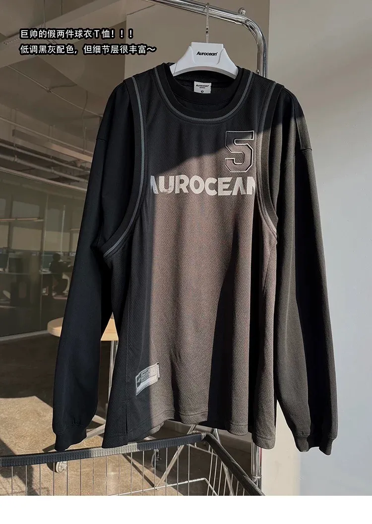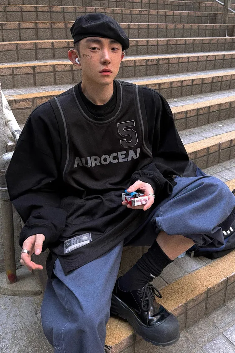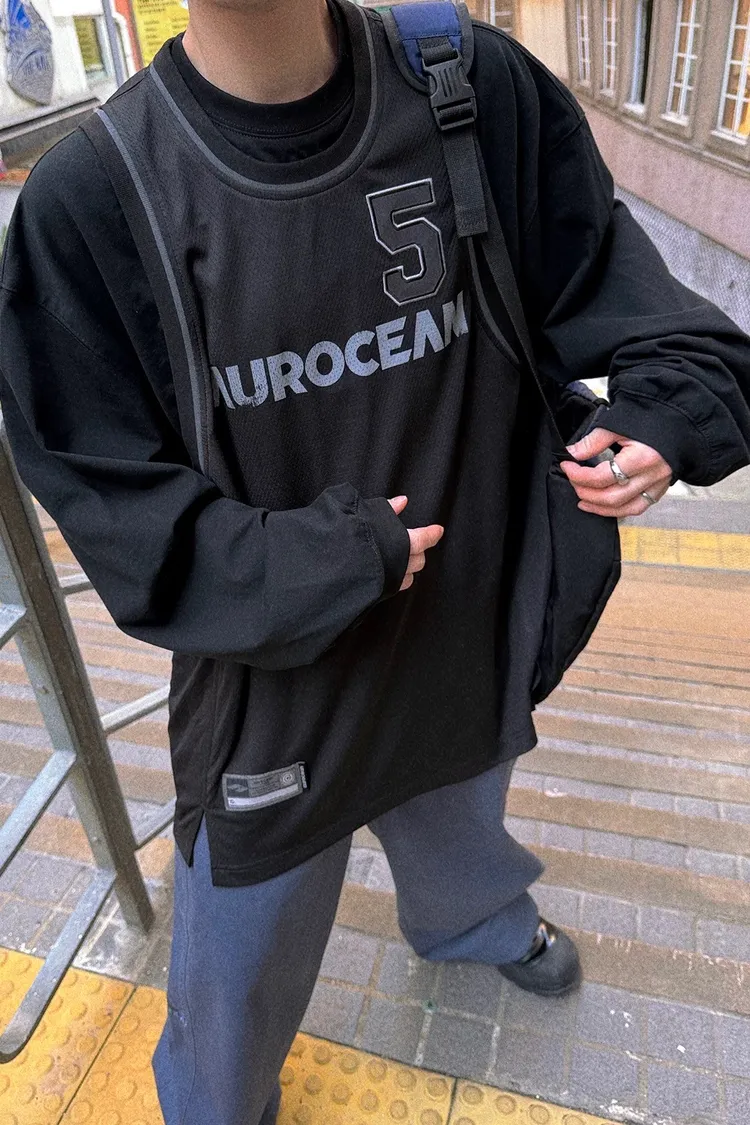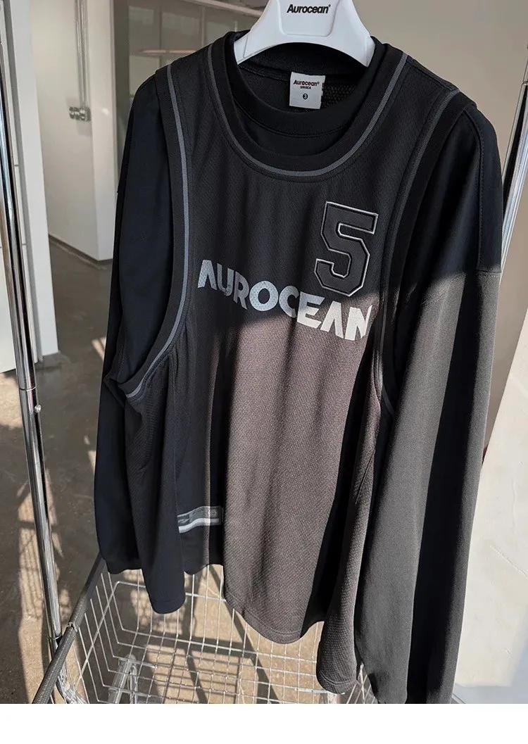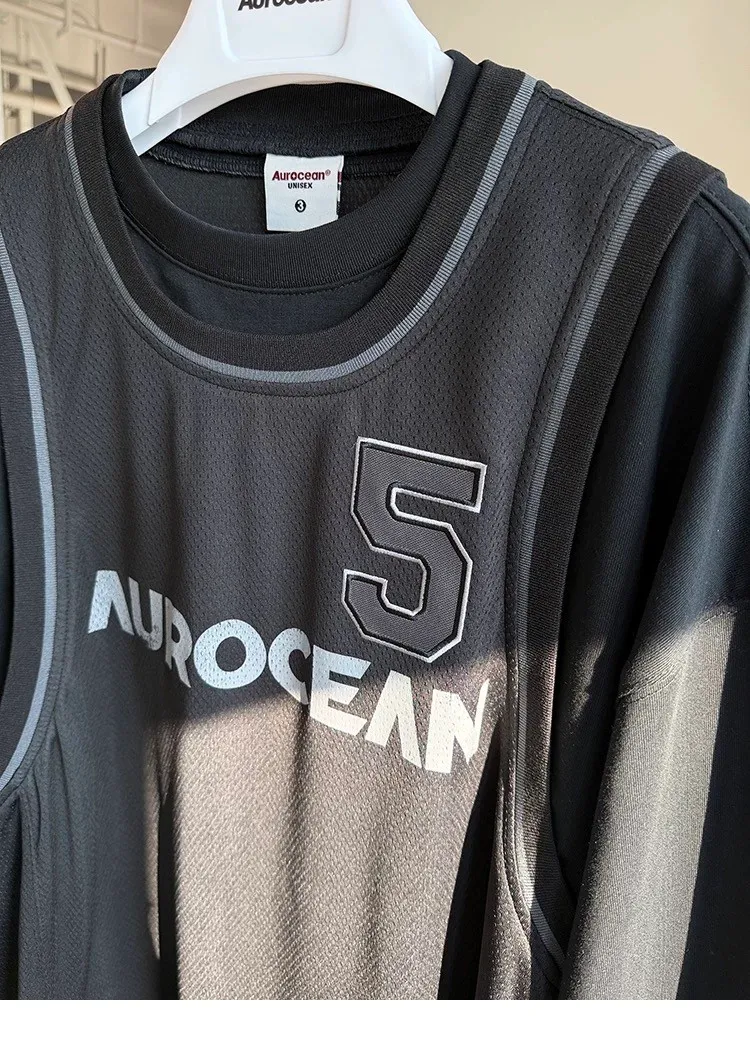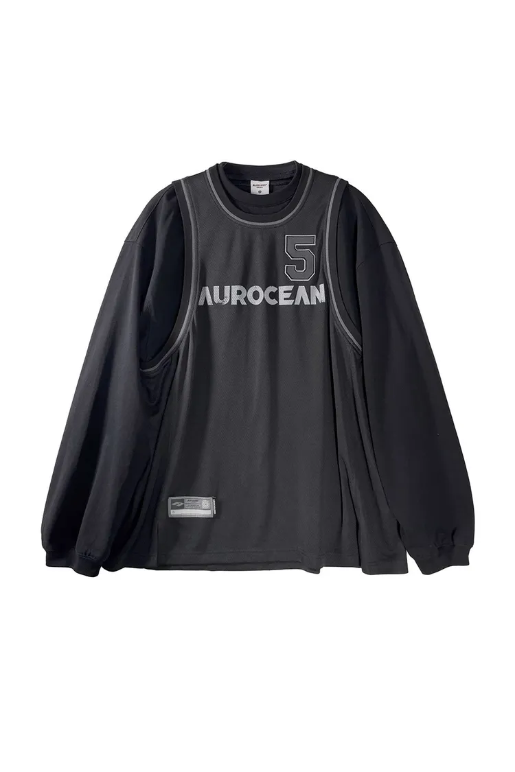 AUROCEAN 復古運動 拼接球衣 OS 長袖 (黑色)