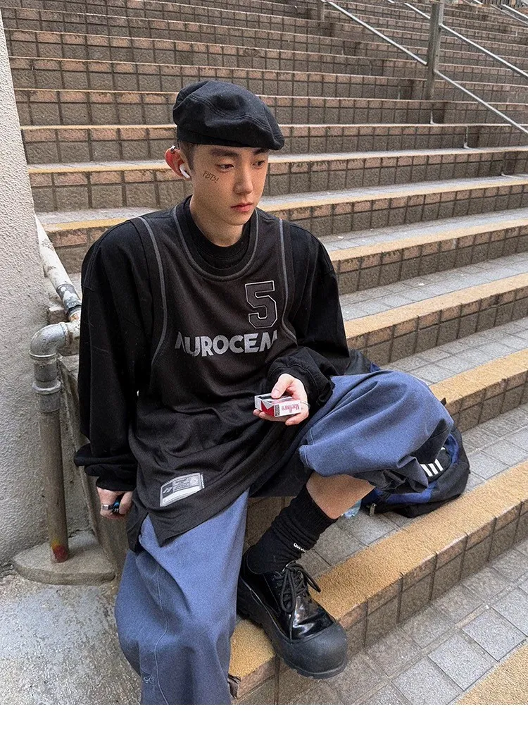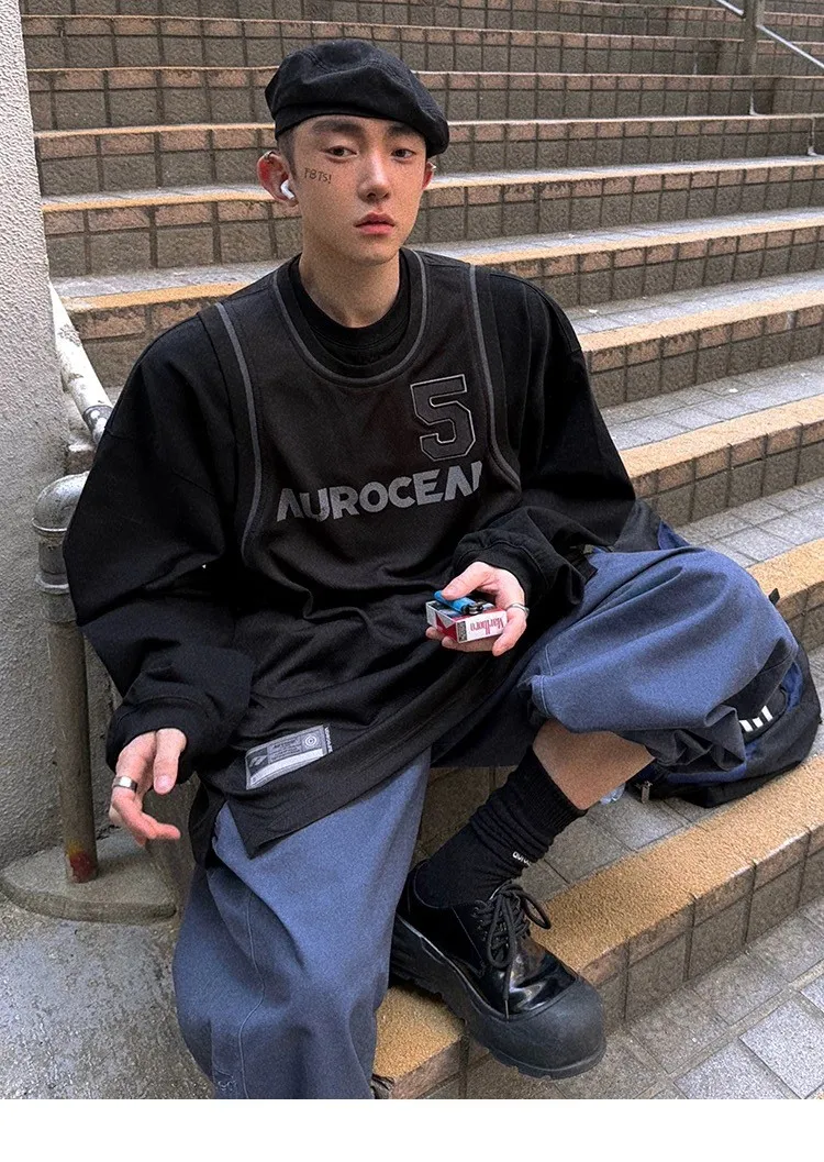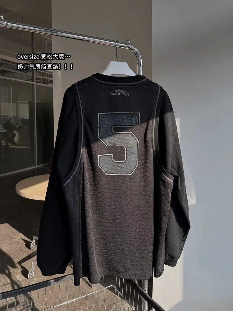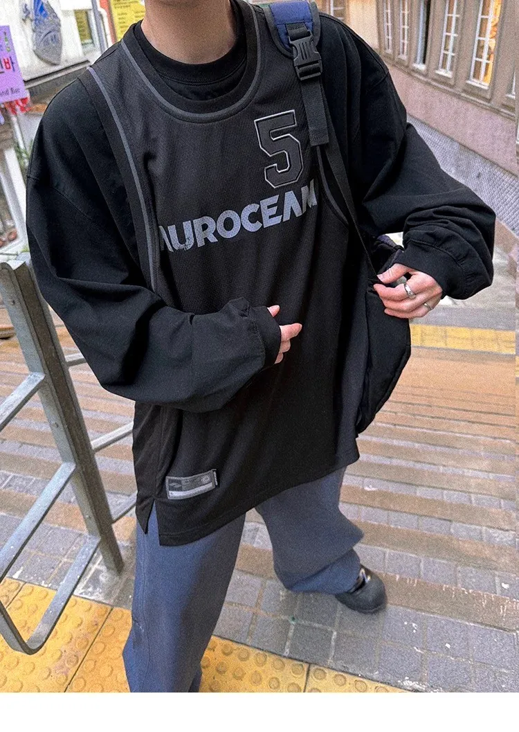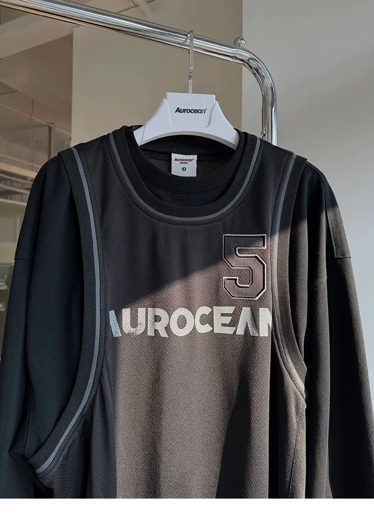 AUROCEAN 復古運動 拼接球衣 OS 長袖 (黑色)