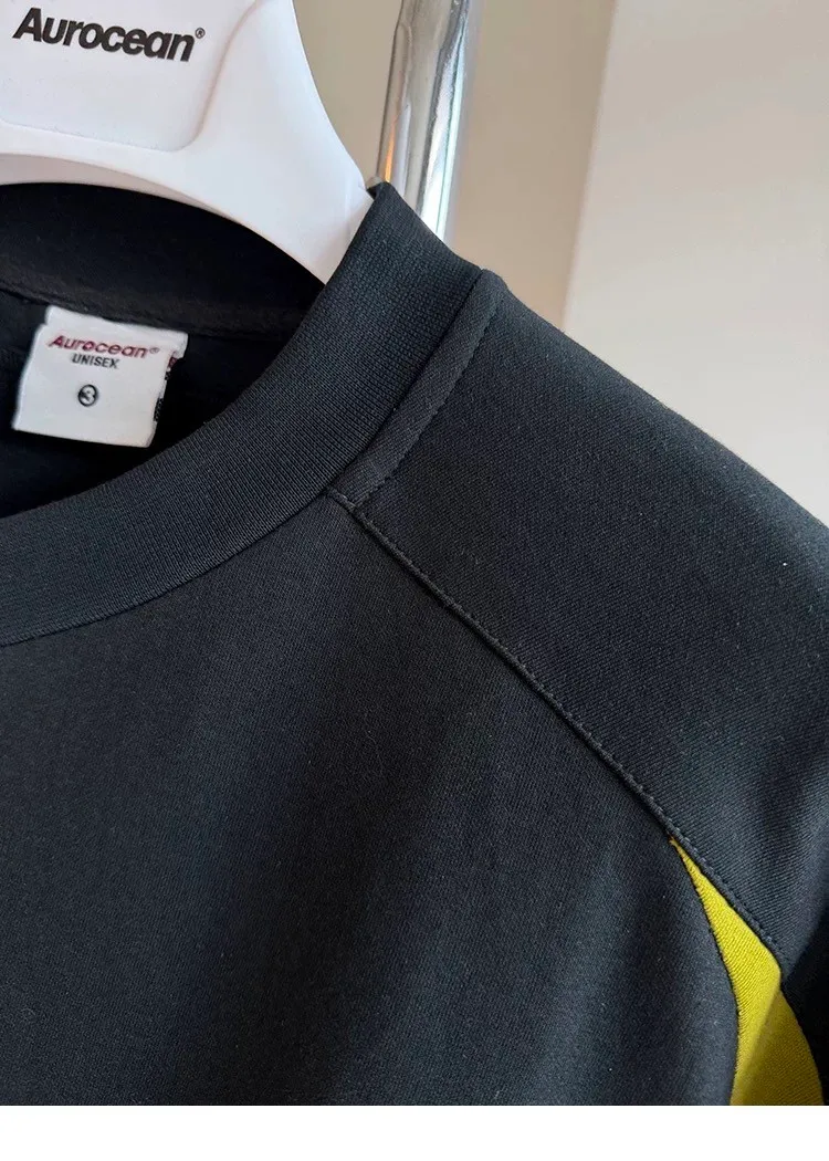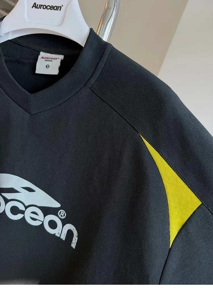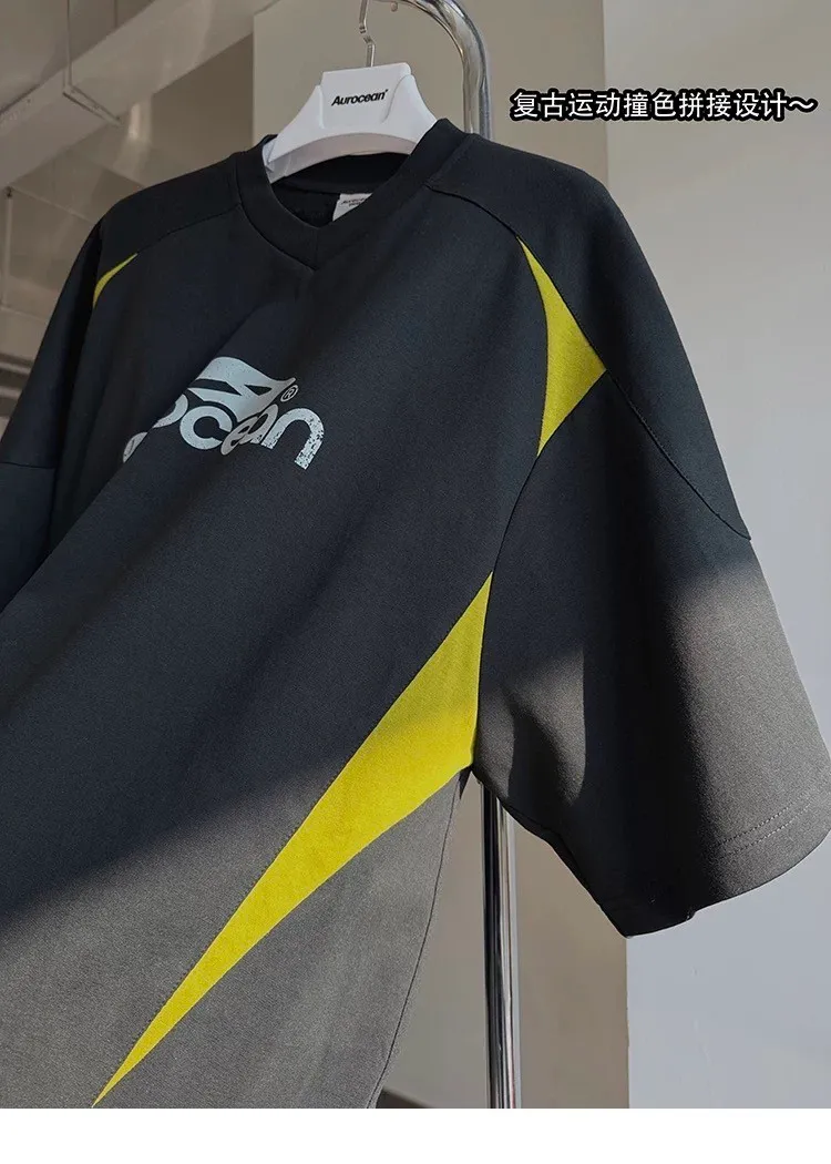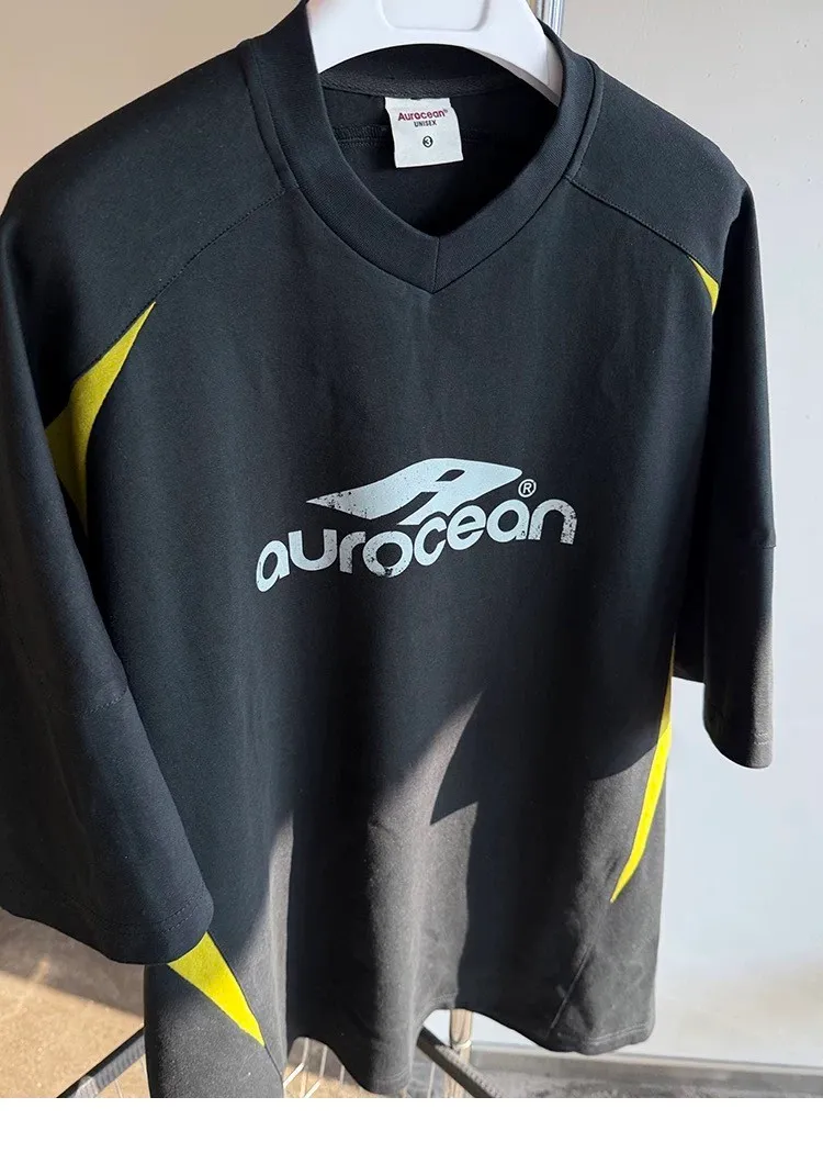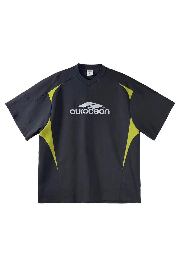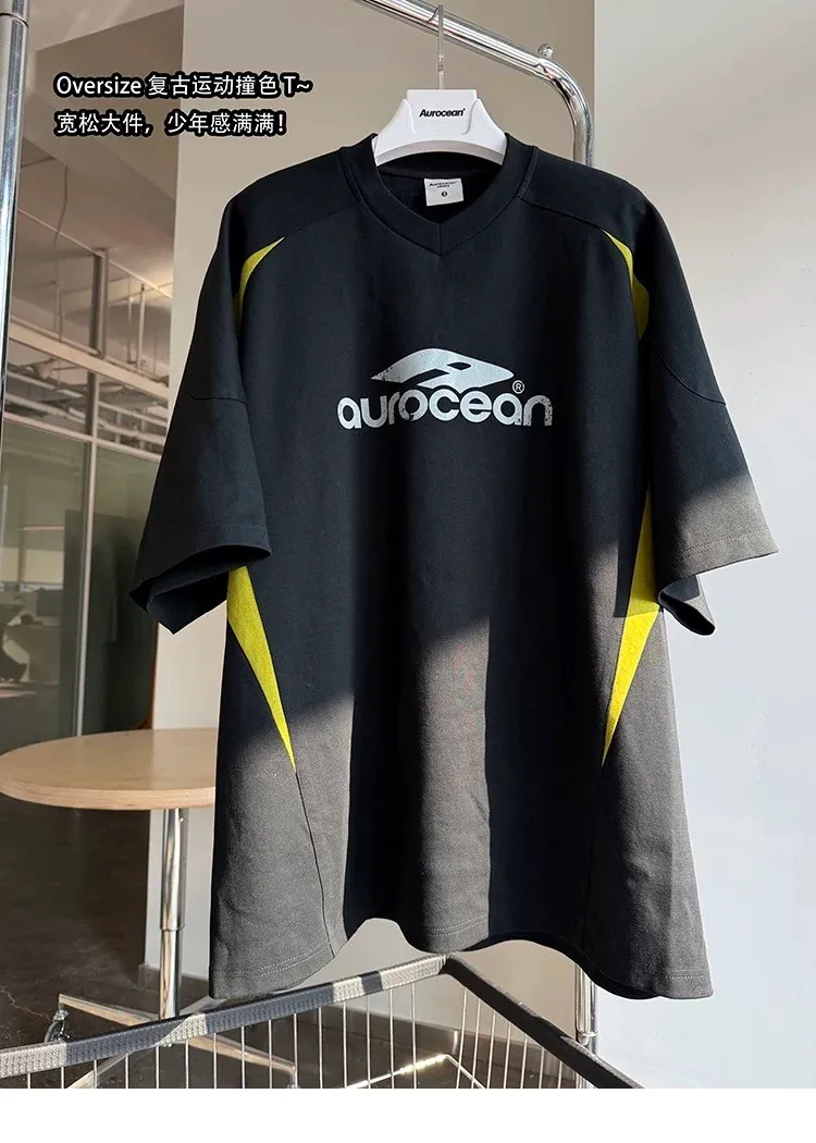 AUROCEAN 復古運動 撞色拼接 OS 短袖 (黑黃)