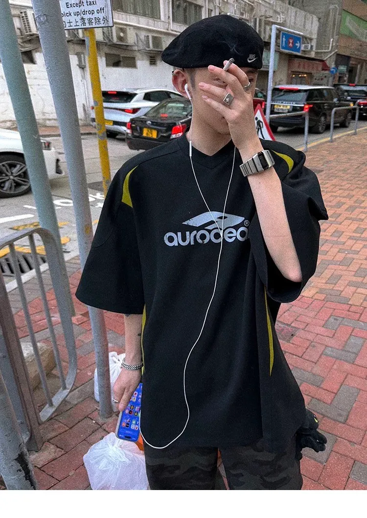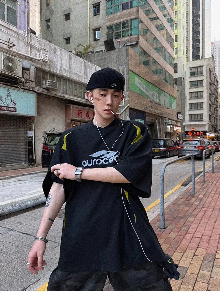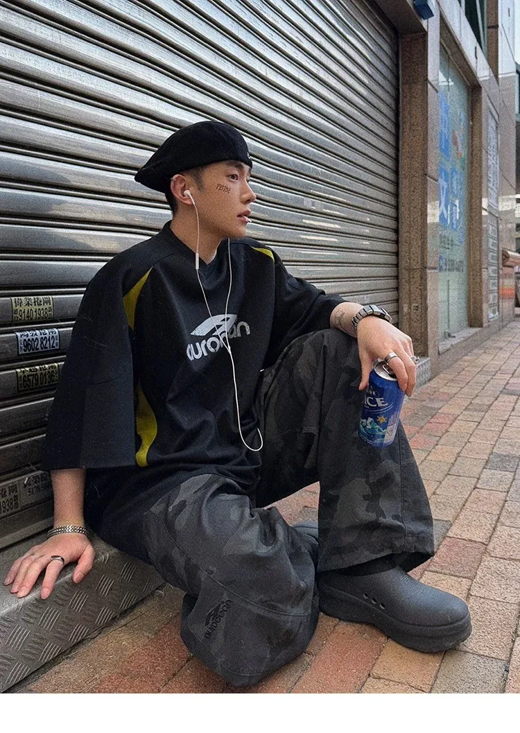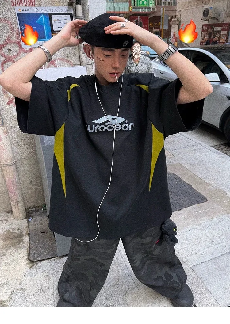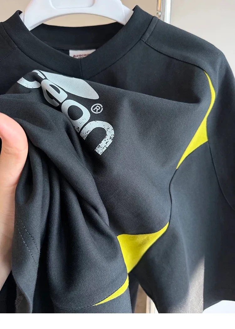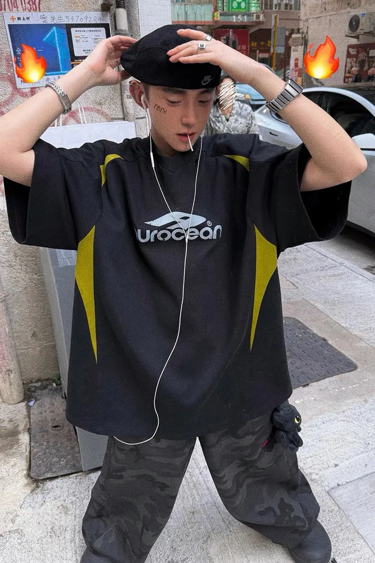 AUROCEAN 復古運動 撞色拼接 OS 短袖 (黑黃)