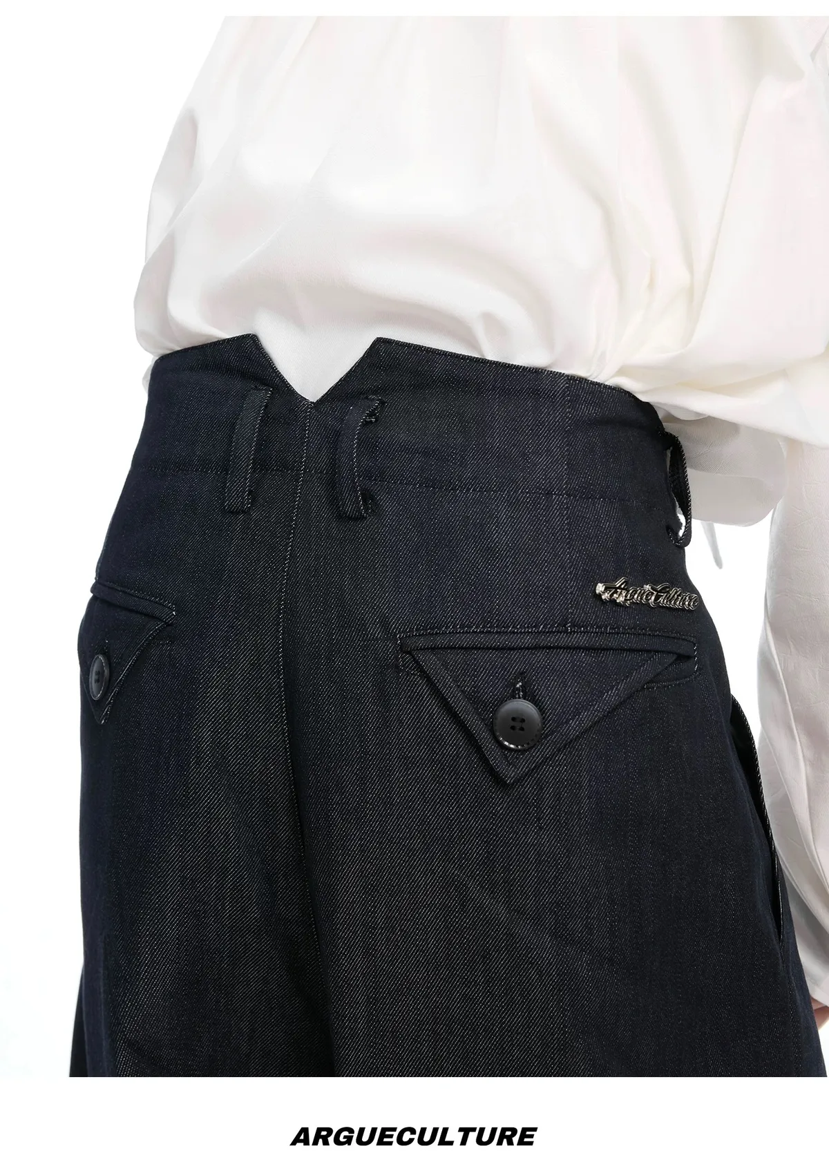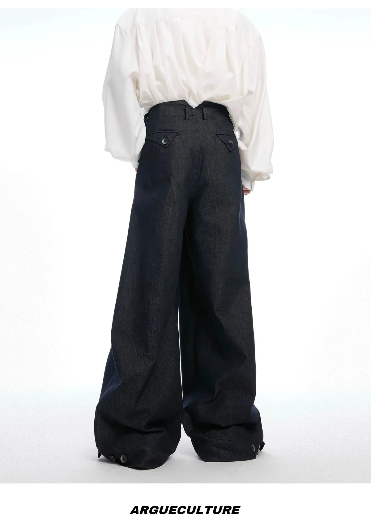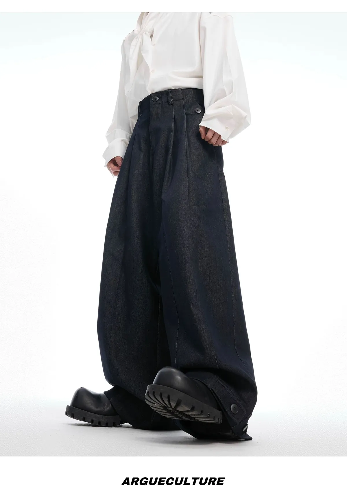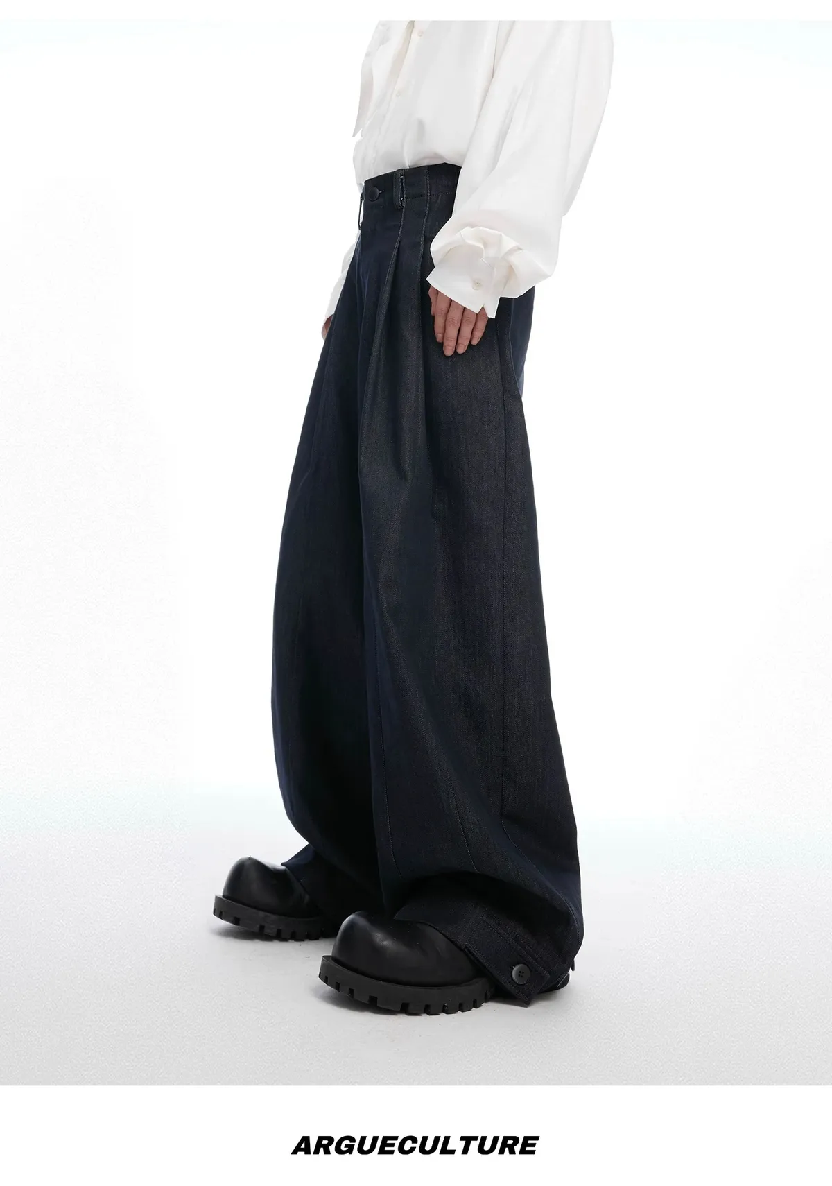 ARGUE 原漿丹寧 復古 褶皺 闊腿 牛仔褲(深藍)