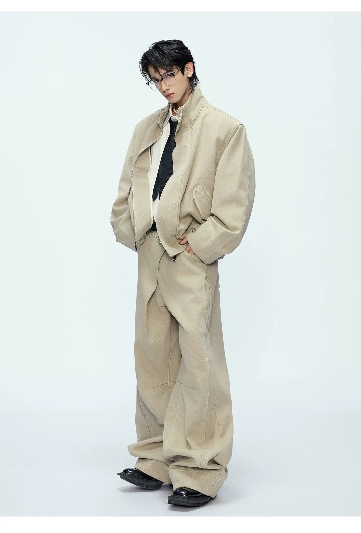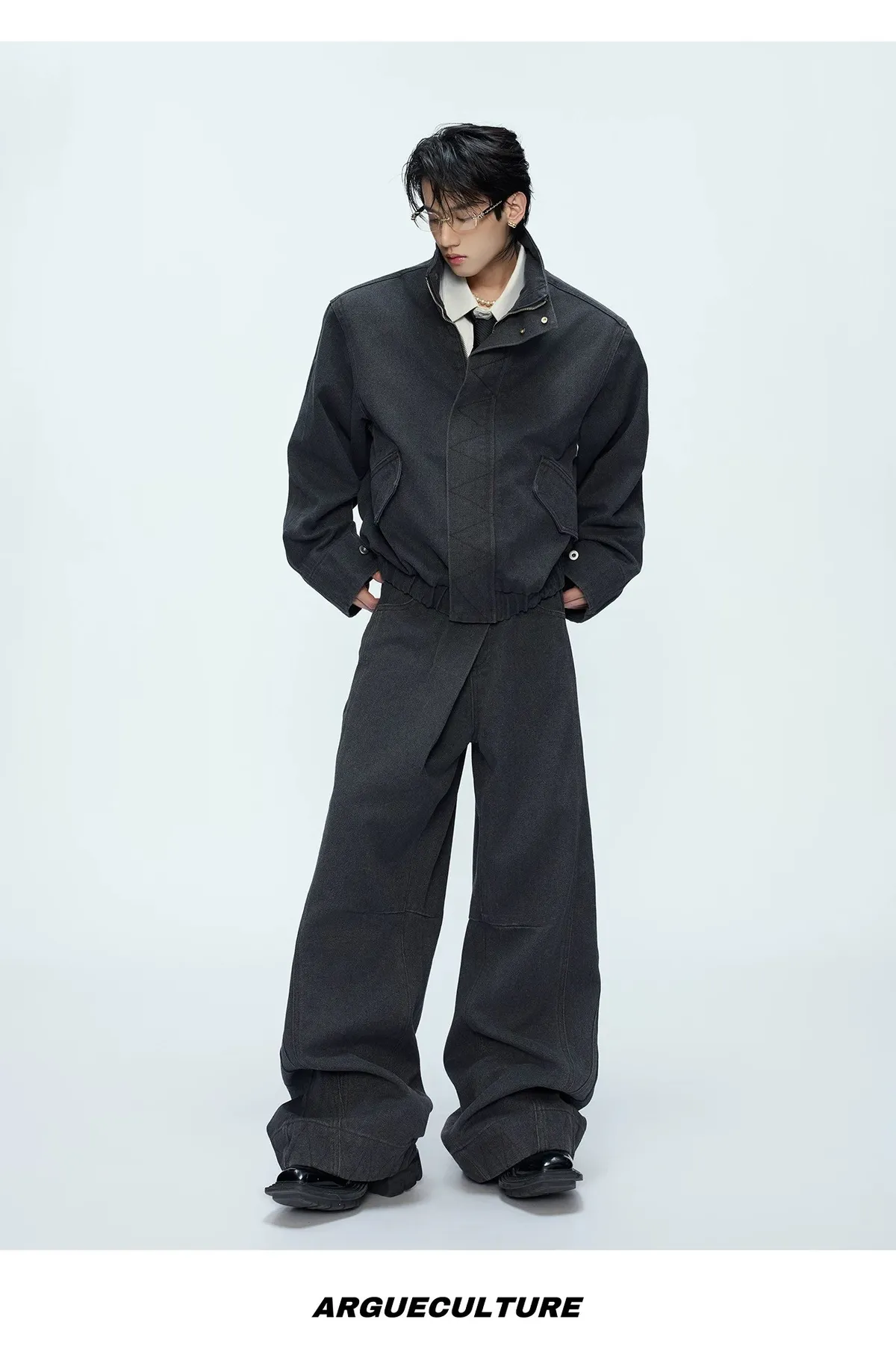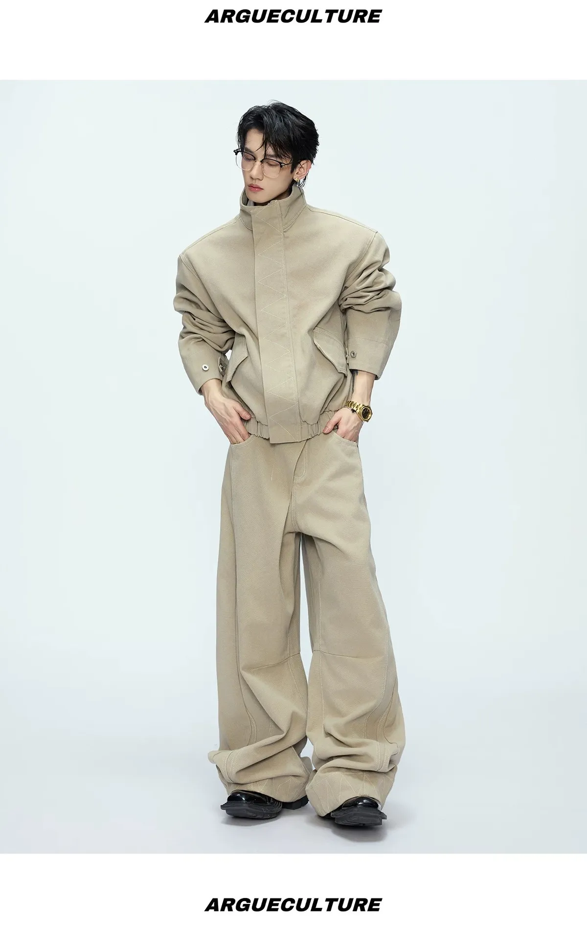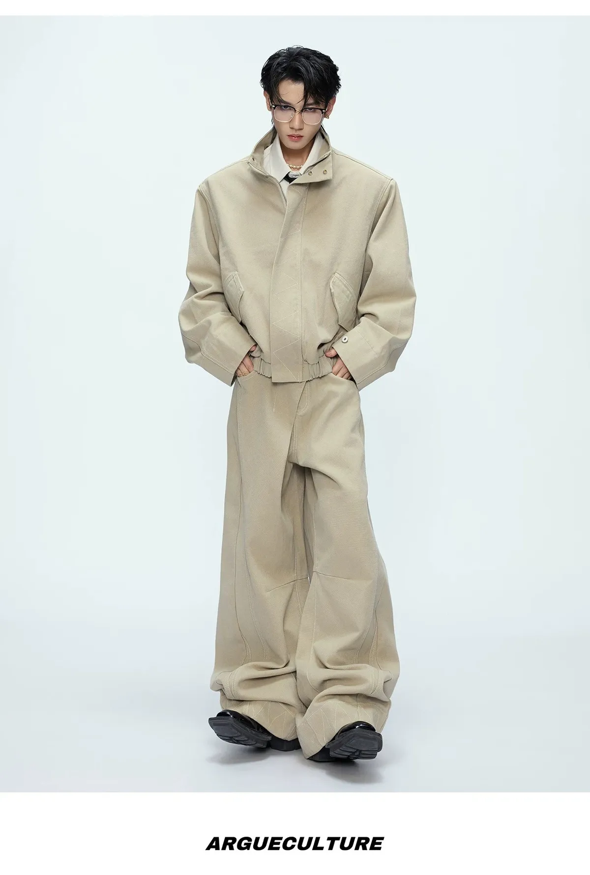 ARGUE 復古水洗 哈靈頓 水洗寬短 外套 解構 長褲 套裝(卡其/黑)
