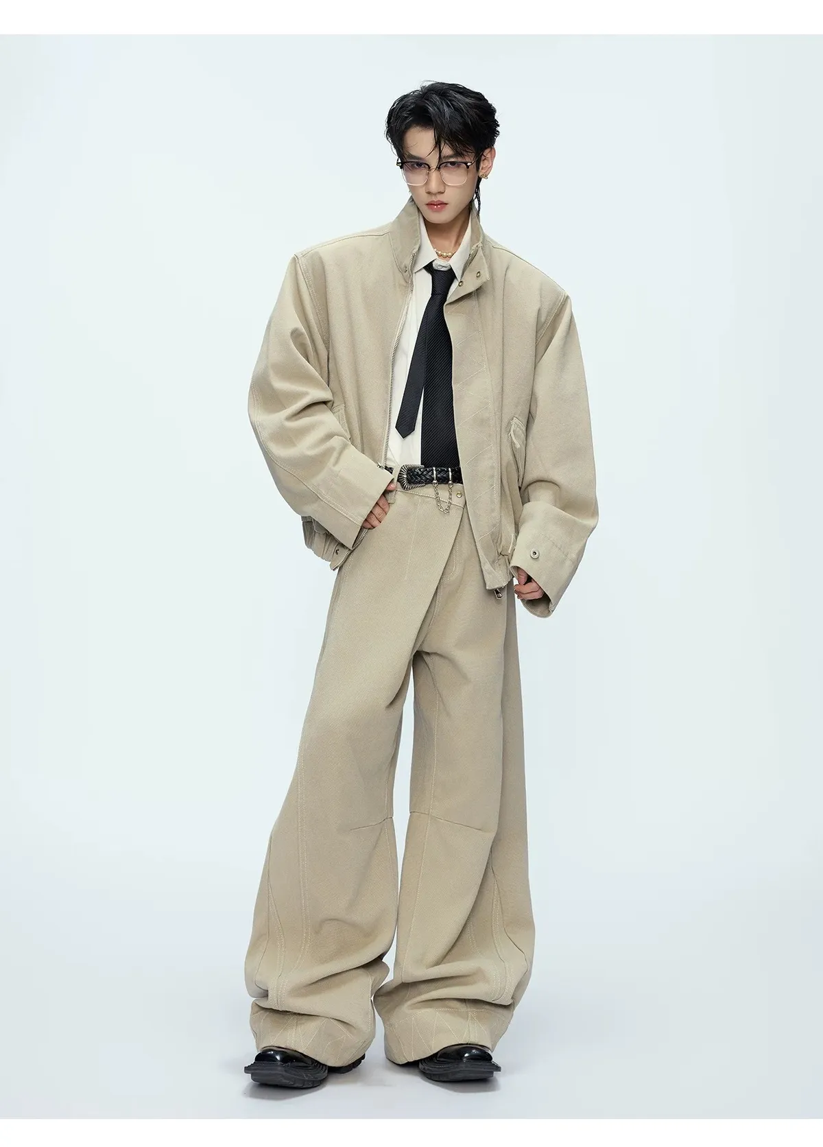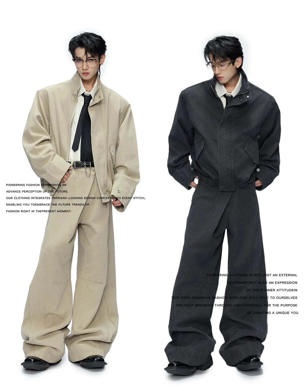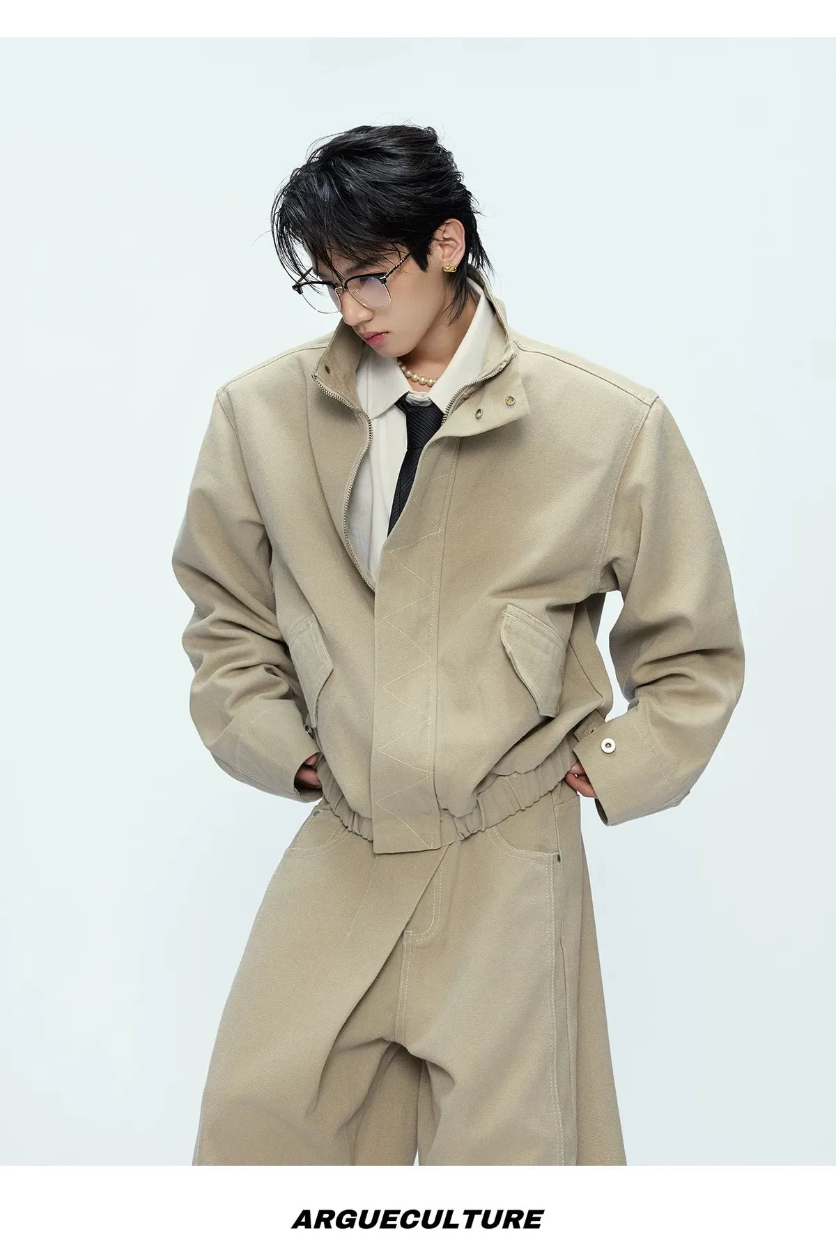 ARGUE 復古水洗 哈靈頓 水洗寬短 外套 解構 長褲 套裝(卡其/黑)